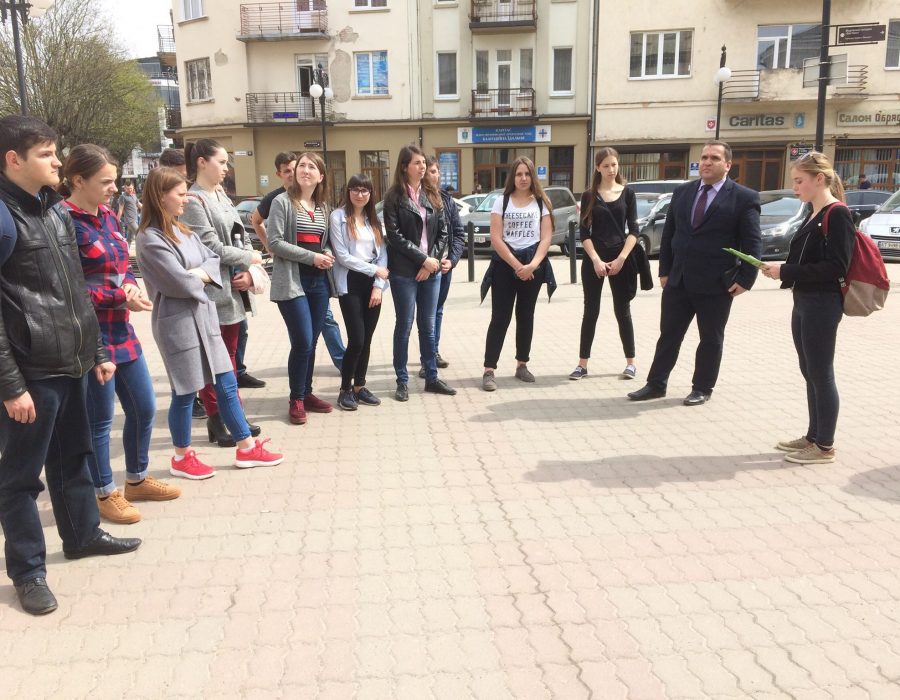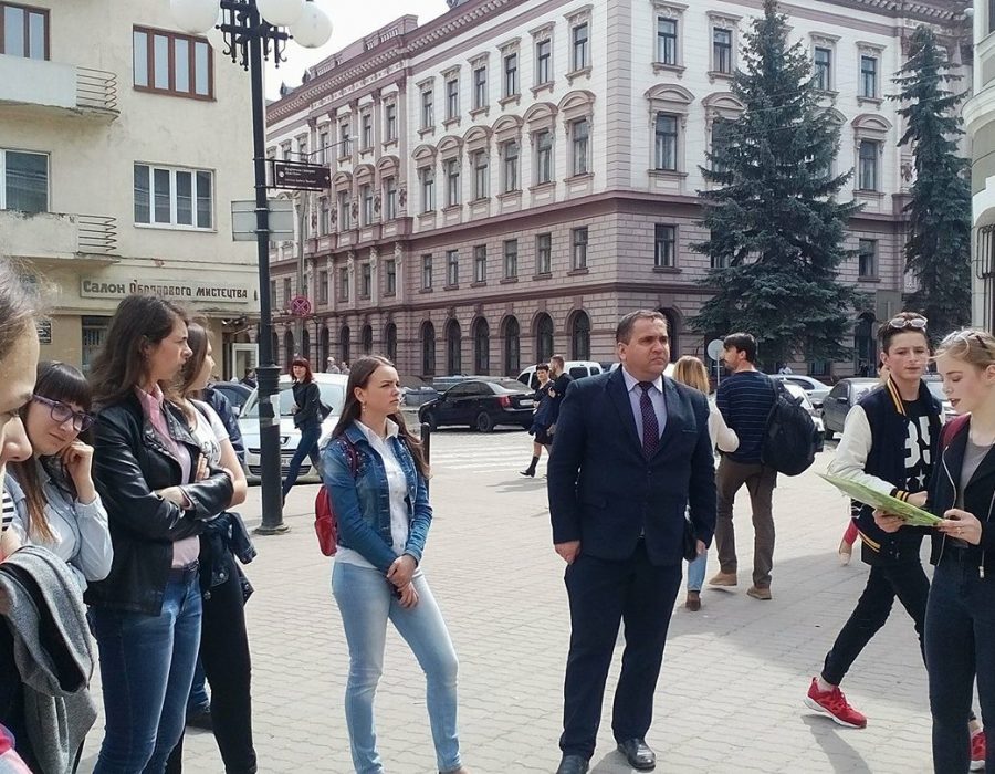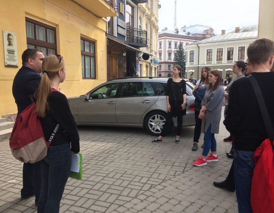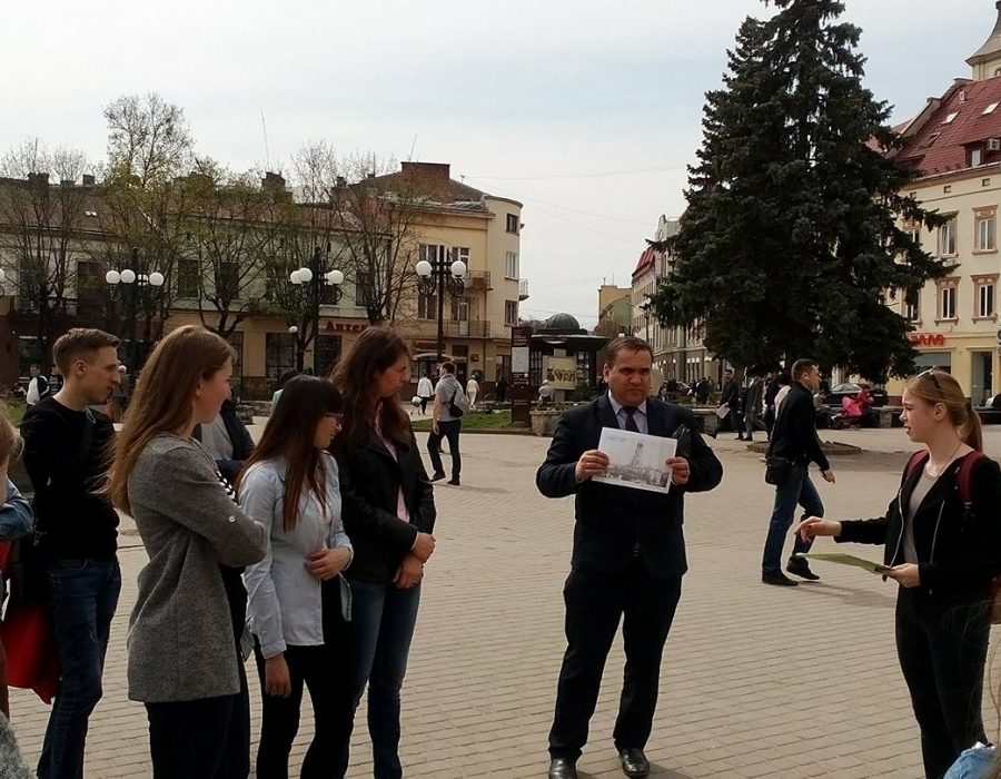 Професор В. Грабовецький на екскурсії зі студентами по історичних місцях обласного центру. 1995 р.
