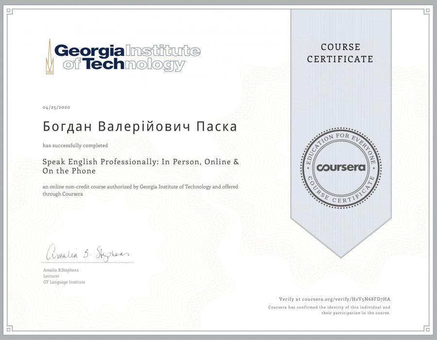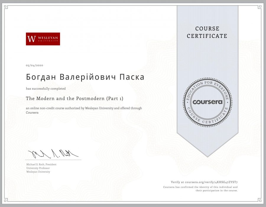 Викладачі кафедри історії України і методики викладання історії Людмила Дрогомирецька і Богдан Паска успішно завершили навчальні курси у системі дистанційного електронного навчання «Coursera» та отримали відповідні сертифікати. Під час проходження курсу «Speak English Professionally: In Person, Online & On the Phone» (викладач Амалія Стівенс (Amalia B. Stevens) із Джорджійського інституту технології (Georgia Institute of Technology), м. Атланта, шт. Джорджія, США) Богдану Пасці вдалося значно підвищити рівень спілкування англійською мовою під час коротких бесід (small talk), відеоконференцій та телефонних розмов. Особливо цікавим був курс «The Modern and the Postmodern (Part 1)» (професор Майкл Рот (Michael S. Roth), президент Весліанського університету (Wesleyan University), м. Міддлтаун, шт. Коннектикут, США). Завдяки чудовим та змістовним лекціям професора М. Рота відбулося ґрунтовне знайомство із філософією провідних світових мислителів XVIII–XIX ст. та розвитком ідеї модерну протягом цього періоду. У свою чергу, Людмила Дрогомирецька ознайомилася з методиками вдосконалення навчальної діяльності, пройшовши курс «Learning How to Learn: Powerful mental tools to help you master tough subjects» (викладачі – Барбара Оклі (Dr. Barbara Oakley) та Терренс Сейновські (Dr. Terrence Sejnowski) із McMaster University (Канада).