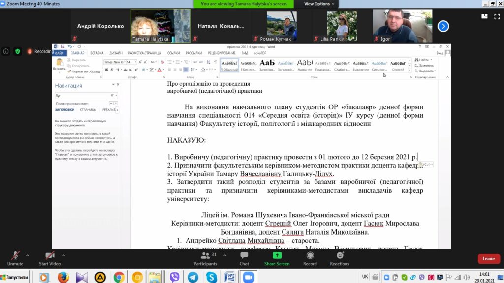 29 січня 2021 р. за допомогою сервісу організації конференцій Zoom відбулася настановча нарада з організації проведення виробничої цільової педагогічної практики в закладах загальної середньої освіти для студентів ІV курсу спеціальності 014 Середня освіта (Історія) ОР «Бакалавр» (денна і заочна форма Читати далі