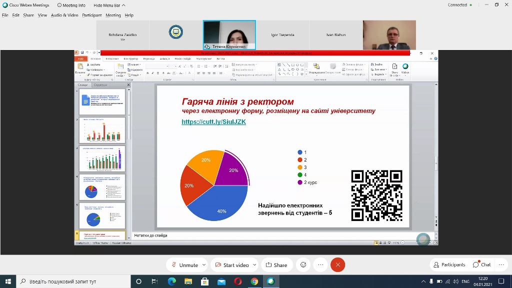Учасники віртуальної зустрічі також обговорили проєкт Положення про порядок особистого прийому громадян в Університеті. В контексті цього питання начальниця загального відділу Університету Тетяна Корнієнко звернула увагу на те, що на період дії карантинних обмежень особистий прийом громадян керівництвом університету тимчасово обмежений.