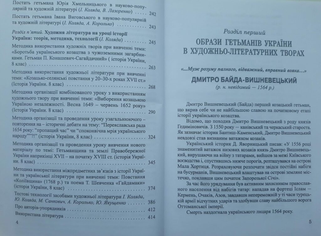У навчально-методичному виданні містяться уривки творів української історичної поезії та прози, подано біографії гетьманів України Д. Байди-Вишневецького, П. Конашевича-Сагайдачного, Б. Хмельницького, Ю. Хмельницького, І. Виговського. У виданні також поміщені історико-біографічні портрети авторів творів, літературно-критичні есе, бібліографічні покажчики, методичні рекомендації з використання української історичної художньої літератури при вивченні історії України у закладах загальної середньої освіти. Навчально-методичне видання пропонується широкому загалу читачів: здобувачам освітніх послуг, вчителям студентам, усім хто цікавиться історією України та українською літературою.