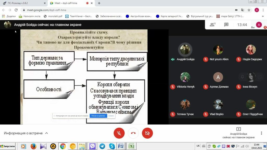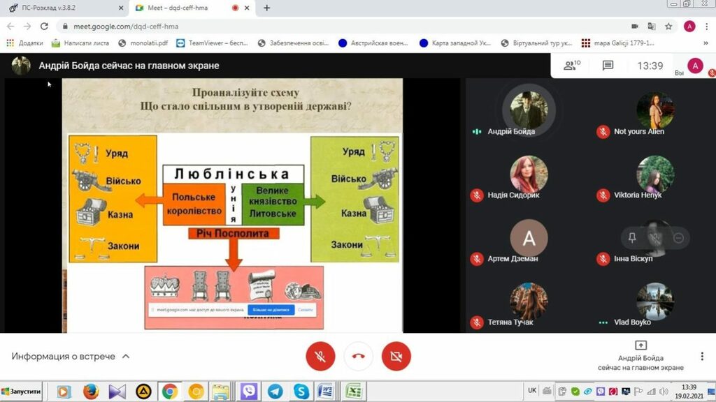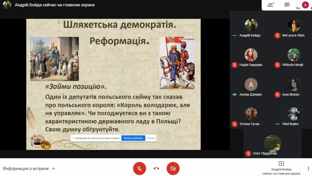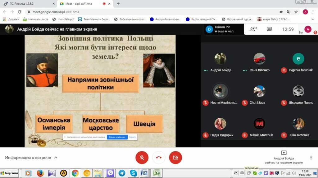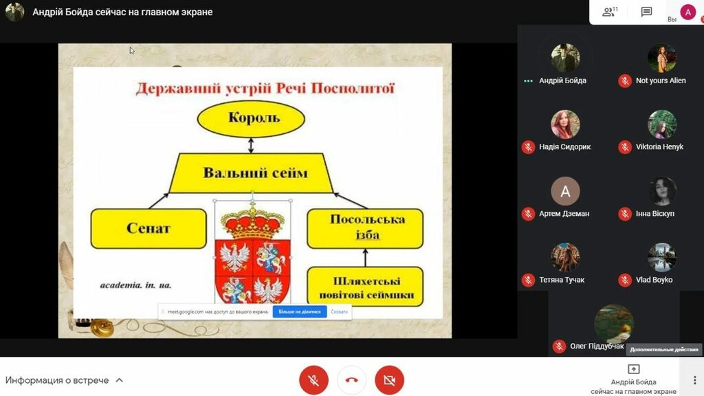 19 лютого 2021 р. на онлайн-платформі Google Meet студент групи СОІ-41 Андрій Бойда провів два онлайн-уроки зі школярами 8-А та 8-Б класів ліцею № 7 Івано-Франківської міської ради, на якому були присутні керівник-методист, кандидат історичних наук, доцент кафедри історії України і методики викладання історії А.З. Королько і вчитель історії та правознавства, кандидат історичних наук цього закладу загальної середньої освіти Н.М. Сидорик.