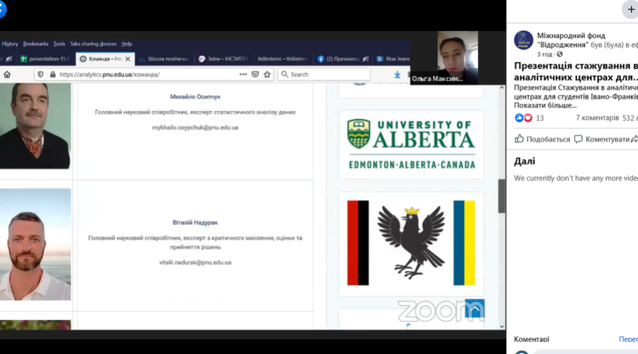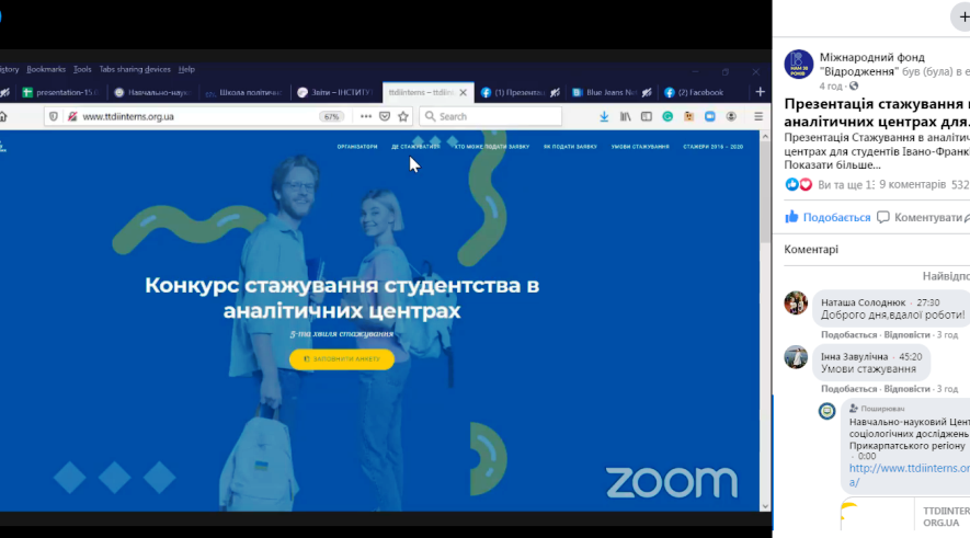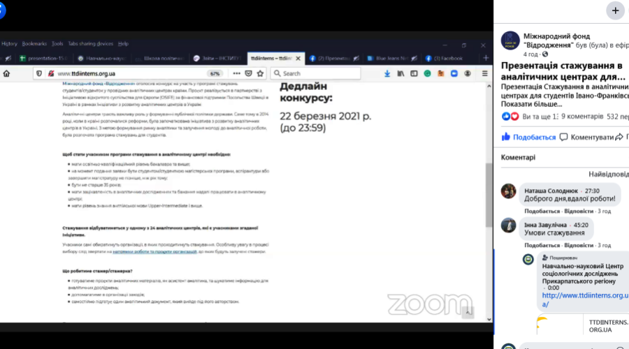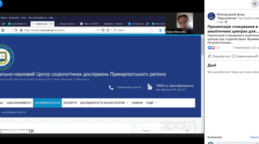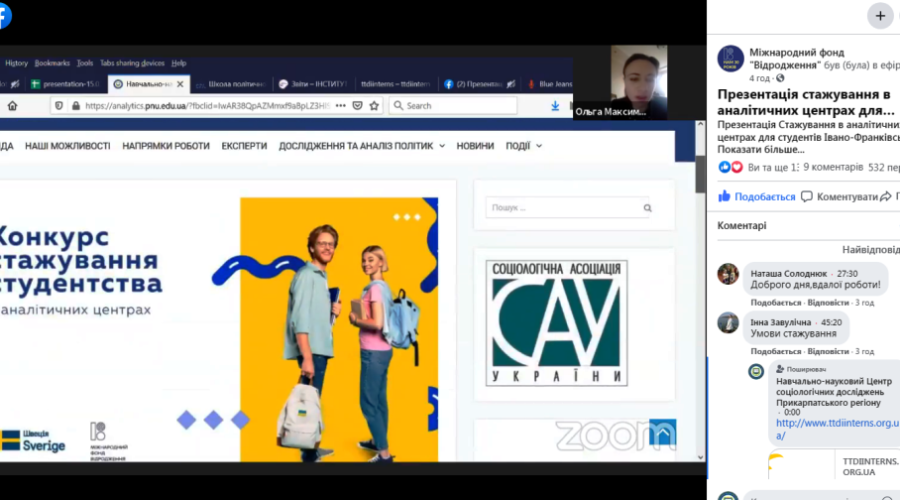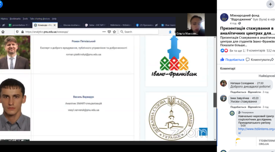 15 березня 2021 р. відбувся інформаційний день щодо конкурсу стажувань для молоді в рамках «Ініціативи з розвитку аналітичних центрів» в Україні. Його нещодавно оголосив Міжнародний фонд «Відродження». Тож, прикарпатці отримали повну інформацію про те, хто саме і за яких умов може пройти стажування з 12 квітня по 12 листопада та чому це варто зробити саме у Прикарпатському університеті! Всі бажаючі змогли поставити організаторам свої питання.