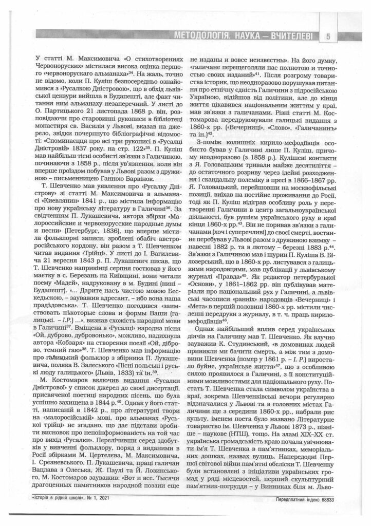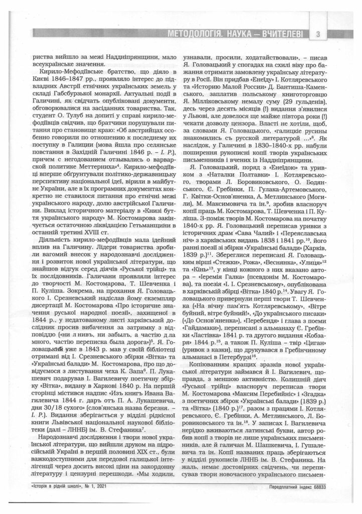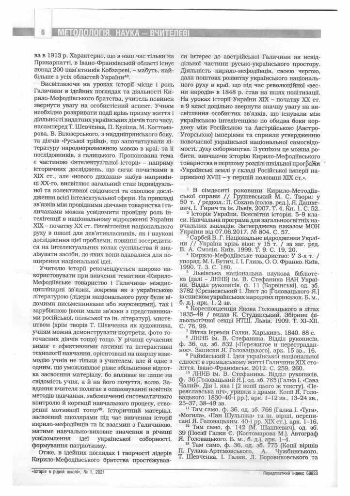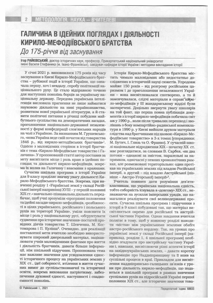 Враховуючи, що кафедра історії України і методики викладання історії є випусковою для студентів спеціальності 014 Середня освіта (Історія) ОР «Бакалавр» і ОР «Магістр», важливу роль у науковій і навчально-методичній роботі відіграють публікації викладачів у фахових виданнях, призначених для вчителів історії. В останньому номері науково-методичного журналу «Історія в рідній школі» за січень 2021 р. (Київ. № 1 (225). С. 2–8) вийшла у світ стаття завідувача кафедри професора І.Я. Райківського «Галичина в ідейних поглядах і діяльності Кирило-Мефодіївського братства. До 175-річчя від заснування», в якій з’ясовано місце і роль Галичини в ідейних поглядах і діяльності кирило-мефодіївців – першої української політичної організації, заснованої в січні 1846 р., 175 років тому. На основі широкого кола джерел автор переконує, що кирило-мефодіївці проявляли інтерес до австрійської Галичини як невід’ємної частини русько-українського простору, а їх творчість дала поштовх розвитку українського національного руху в краї. Особливу увагу звернуто на методичні аспекти висвітлення обраної теми на уроках історії України в 9 класі закладів загальної середньої освіти.