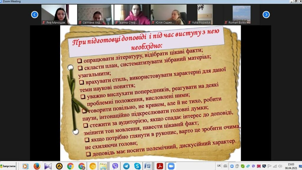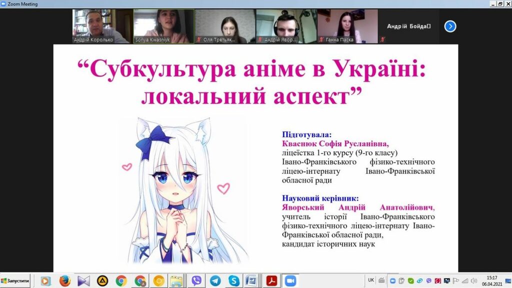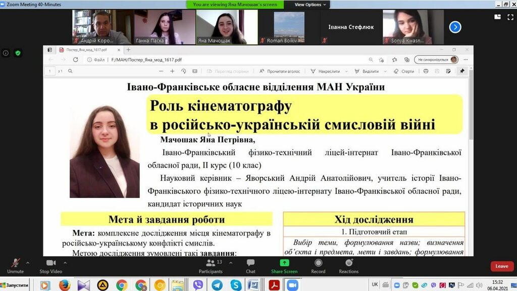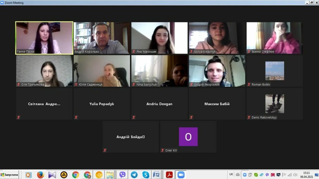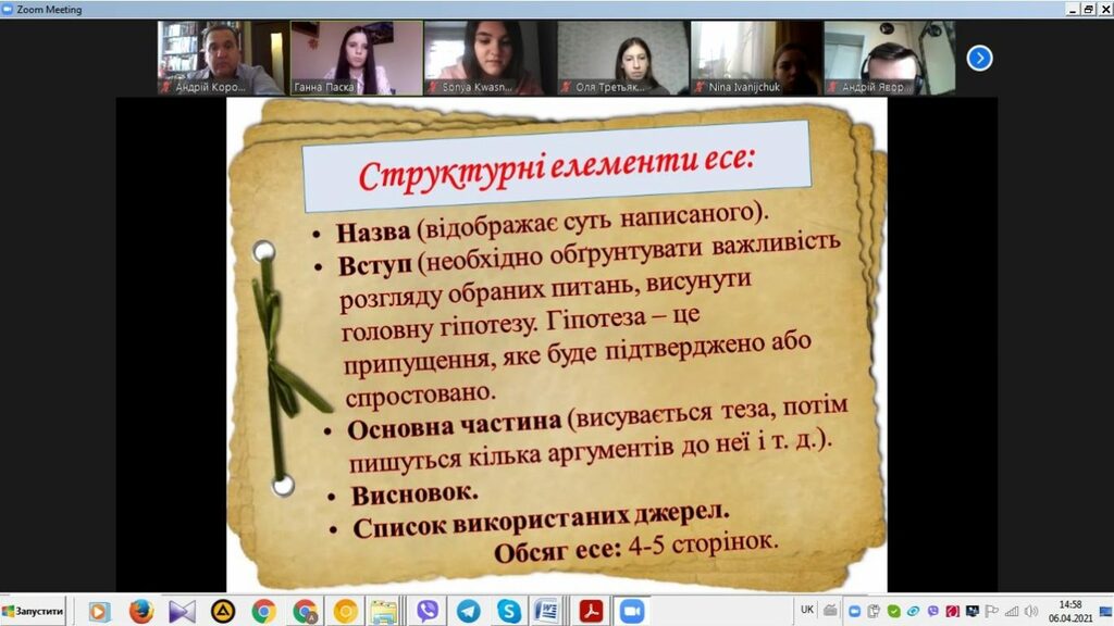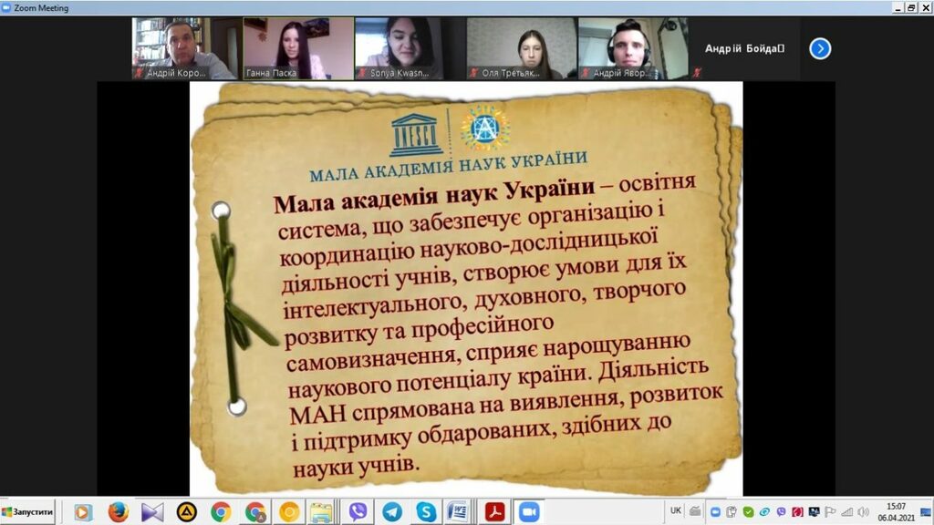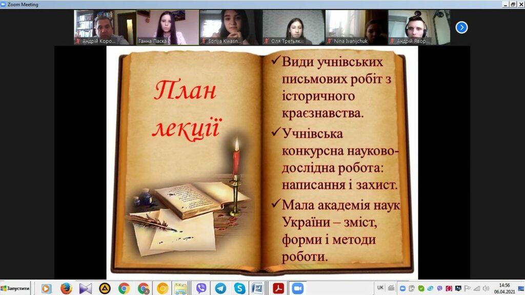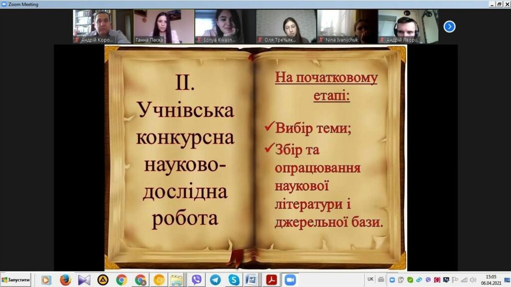 6 квітня 2021 р. у рамках читання дисципліни вільного вибору студента «Основи шкільного краєзнавства», яку для студентів ІV курсу спеціальності 014 Середня освіта (Історія) ОР «Бакалавр» (денна форма навчання) читає доцент кафедри історії України і методики викладання історії А.З. Королько, був проведений методичний семінар на тему «Методика підготовки учнівських конкурсних науково-дослідницьких робіт». На методичний семінар були запрошені гості – ліцеїстки (учениці) Івано-Франківського фізико-технічного ліцею-інтернату Івано-Франківської обласної ради Яна Мачошак та Софія Кваснюк, які стали цьогорічними переможцями ІІ (обласного) етапу Всеукраїнського конкурсу-захисту науково-дослідницьких робіт учнів-членів Малої академії наук України, та їхній науковий керівник, вчитель історії цього закладу загальної середньої освіти, кандидат історичних наук Андрій Анатолійович Яворський. Модераторкою цього інтерактивного заходу виступила аспірантка другого року навчання зі спеціальності 032 Історія та археологія Ганна Паска, яка у цьому семестрі проходить асистентську виробничу педагогічну практику (науковий керівник – доц. А.З. Королько).
