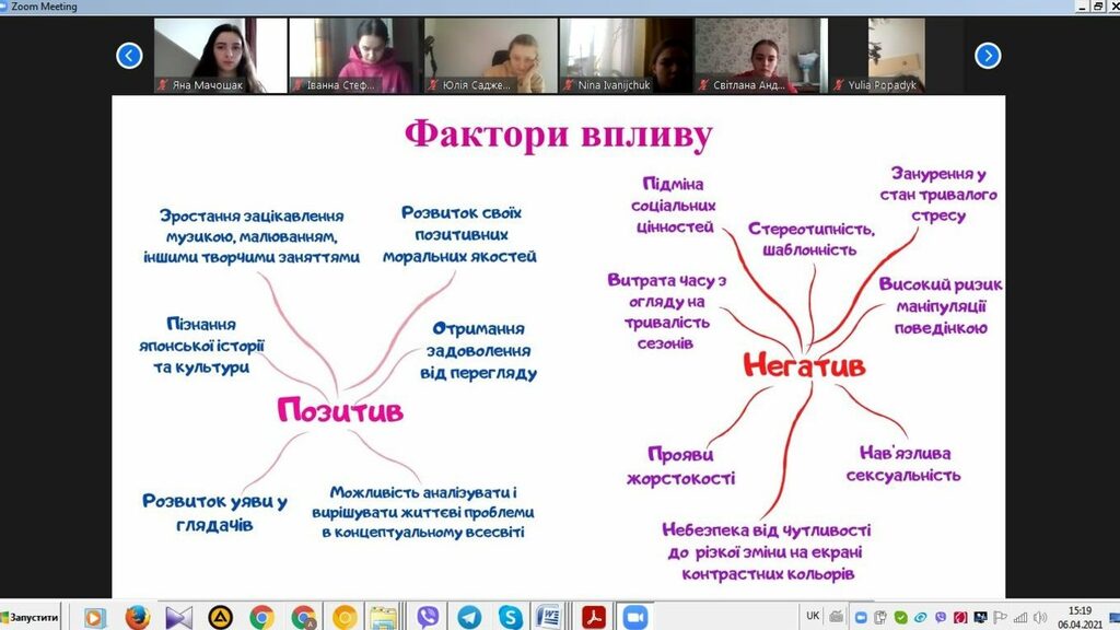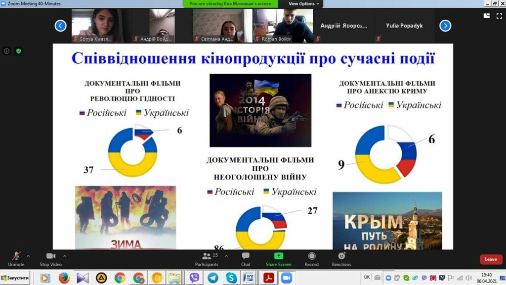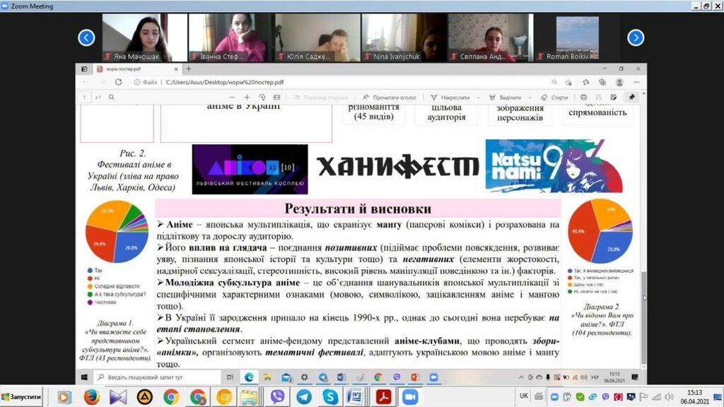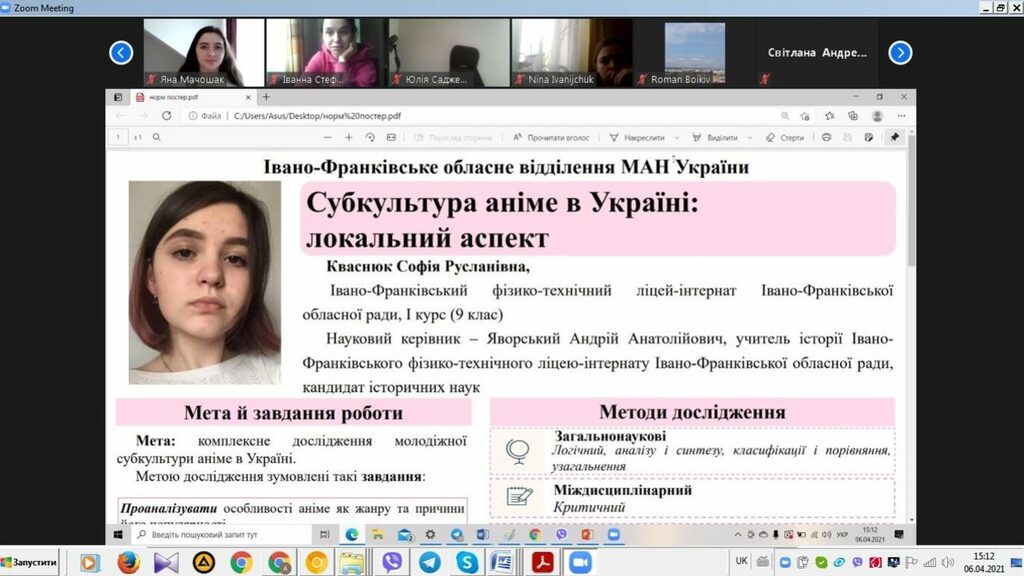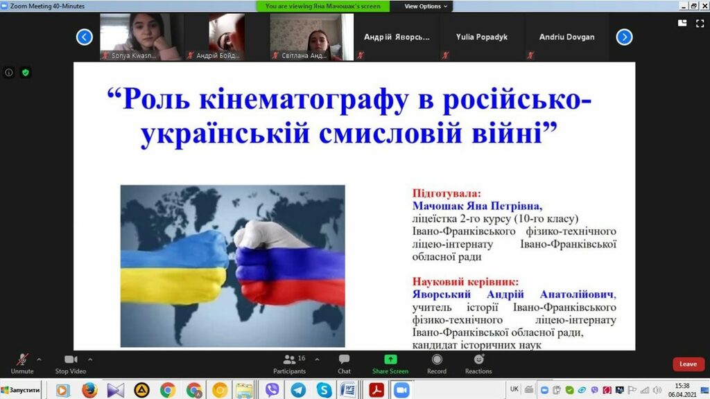 Наступна фаза методичного семінару – представлення у формі візуалізованих презентацій ліцеїстками (ученицями) Івано-Франківського фізико-технічного ліцею-інтернату Івано-Франківської обласної ради Софією Кваснюк та Яною Мачошак своїх учнівських конкурсних робіт. Першою представила результати свого наукового дослідження на тему «Субкультура аніме в Україні: локальний аспект» ліцеїстка І курсу (9 класу) Софія Кваснюк, переможниця ІІ (обласного) етапу Всеукраїнського конкурсу-захисту науково-дослідницьких робіт учнів-членів Малої академії наук України на секції з соціології відділення філософії та суспільствознавства, другою – на тему «Роль кінематографу в російсько-українській смисловій війні» ліцеїстка ІІ курсу (10 класу) Яна Мачошак, переможниця цього ж етапу конкурсу на секції з історії України відділення історії.