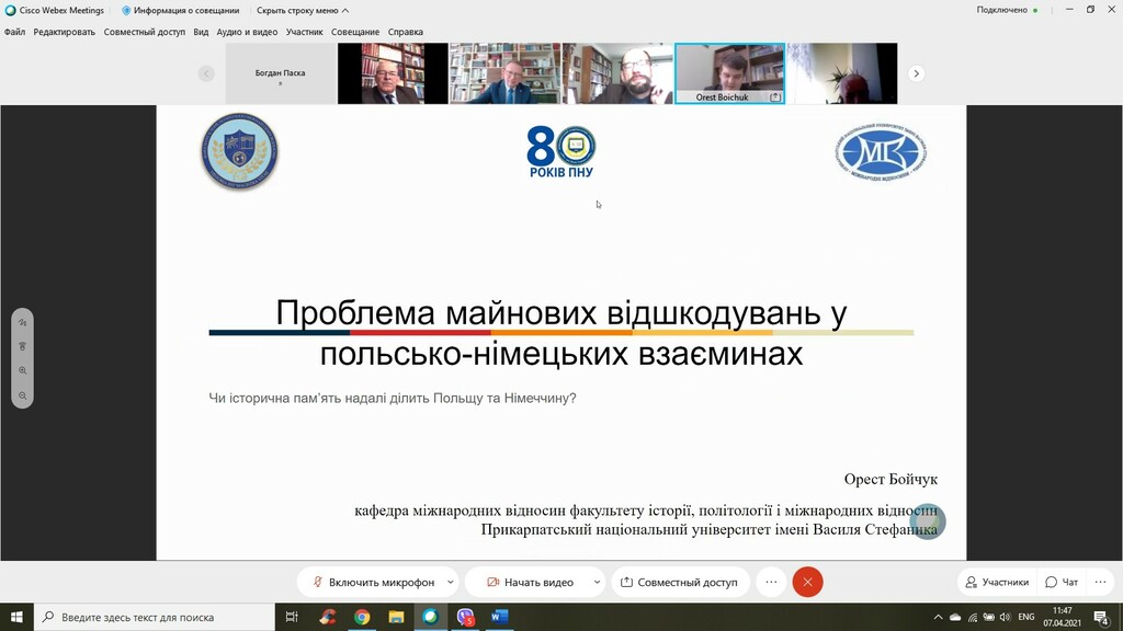 На конференції виступили доктор історичних наук, професор кафедри всесвітньої історії Мирослав Волощук (тема доповіді – «Центр медієвістичних студій: здобутки та перспективи (до 5-річчя з часу створення)»), доктор політичних наук, професор кафедри політології Іван Монолатій (тема доповіді – «Використання теорії Чорного лебедя в інтерпретаціях історії ЗУНР/ЗОУНР»), старший викладач кафедри міжнародних відносин Орест Бойчук (тема доповіді «Проблема майнових відшкодувань в польсько-німецьких відносинах»).