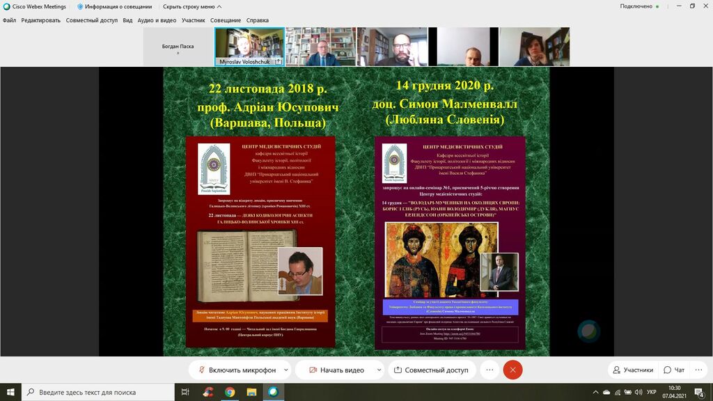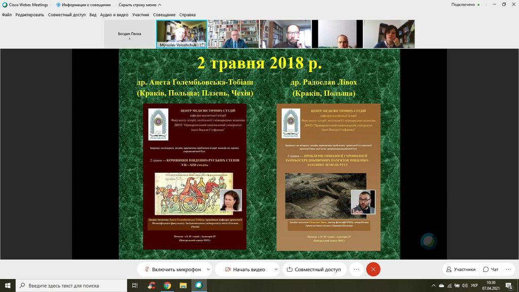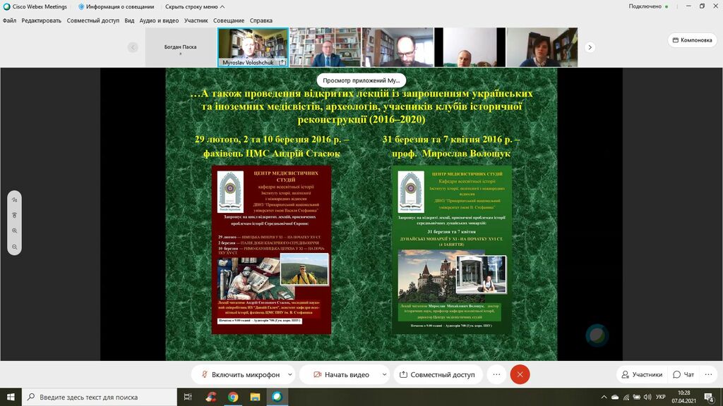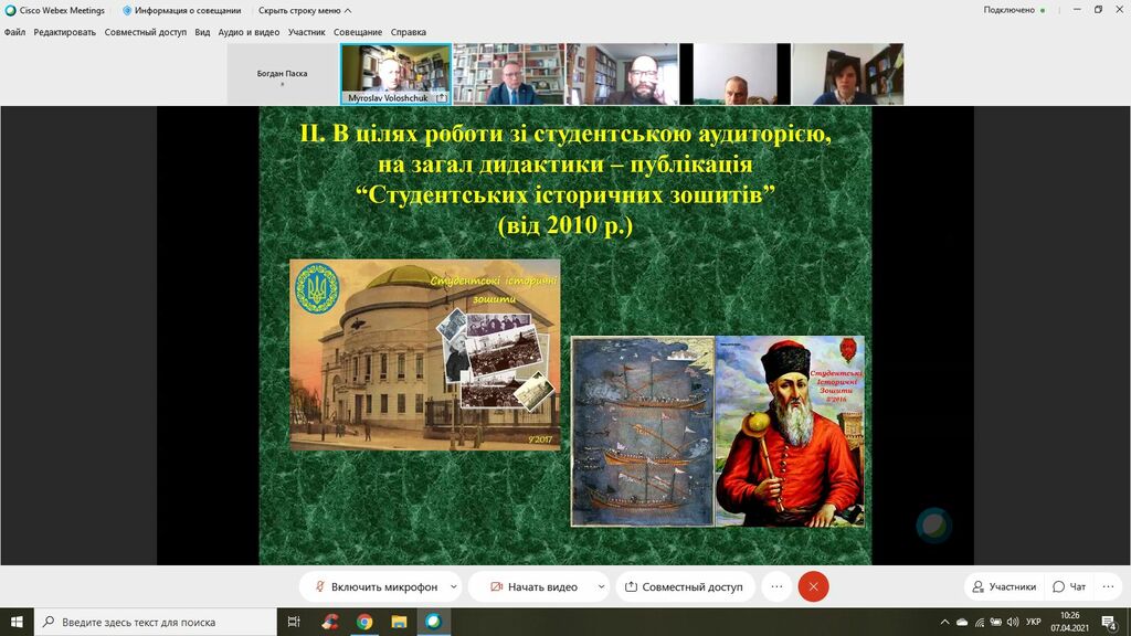 7 квітня 2021 р. відбулося пленарне засідання звітної наукової веб-конференції секції історичних наук Факультету історії, політології і міжнародних відносин, на якому були присутні викладачі і аспіранти кафедри історії України і методики викладання історії. У вступному слові керівник секції, головуючий на засідання заступник декана Факультету, доцент кафедри історії України і методики викладання історії М. В. Сигидин підкреслив важливість заходу, звертаючи особливу вагу не те, що ця подія є майданчиком для обміну думок між науковцями Факультету та створює додаткову можливість представити результати власних досліджень, які провадить професорсько-викладацький склад структурного підрозділу Університету.