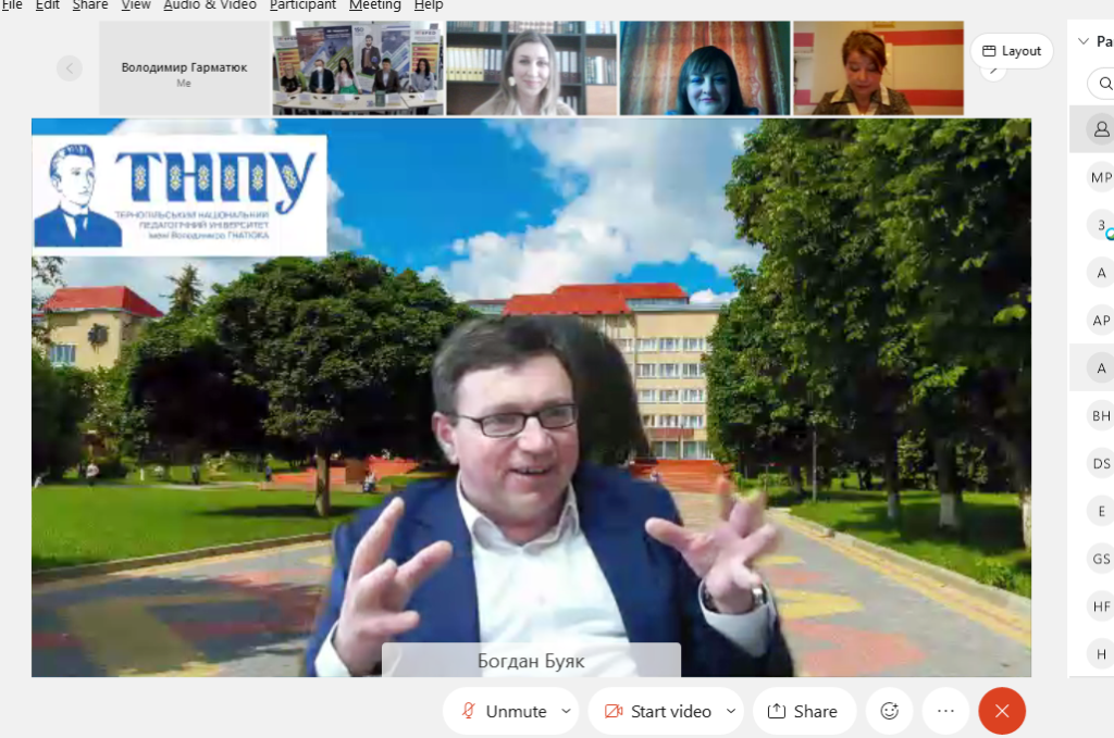 «Це чудова ініціатива – в такій неформальній обстановці поспілкуватися, показати одне одному те, що надихає нас, оскільки у нас є дуже багато перехресних моментів долі. Ми маємо спільну історію, спільний вік, навіть ініціатива відзначити разом ювілеї наших патронів – це ознака того, що 150 років тому мали місце історичні події в нашій державі, на українських землях, оскільки і Володимир Гнатюк, і Василь Стефаник достойні того, щоби бути провісниками, патронами опікунами, ангелами-охоронцями таких величних академічних колективів, якими сьогодні є ТНПУ і ПНУ. Тішимося, що навіть в цих пандемійних умовах ми все ж знаходимо можливості і способи спілкуватися, співпрацювати, творити разом», – зазначив Богдан Буяк, ректор Тернопільського національного педагогічного університету імені Володимира Гнатюка.