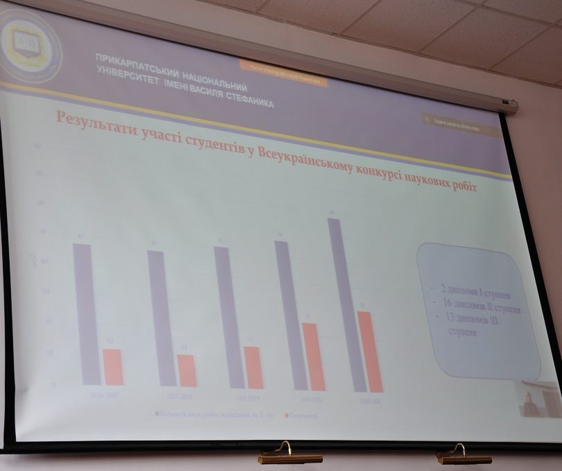 Учасників засідання також поінформували про підсумки участі студентів Університету у всеукраїнських студентських наукових заходах, творчих фестивалях і конкурсах, спортивних змаганнях в 2020–2021 навчальному році. З відповідною доповіддю виступила начальниця науково-дослідної частини Університету, професорка Ірина Галущак. Вона, зокрема, зазначила, що в минулому навчальному році до організаційних комітетів всеукраїнських і міжнародних конкурсів студентських наукових робіт студентами Університету було направлено 68 наукових робіт. У ІІ-му турі всеукраїнських конкурсів студентських наукових робіт з різних галузей знань і спеціальностей у 2020–2021 навч. році наші студенти здобули 31 диплом, з яких І ступеня –2, ІІ-го – 16 та ІІІ-го – 13. Відрадно зазначити, що серед цієї когорти здобувачів вищої освіти є і студент ІV курсу спеціальності 014 Середня освіта (Історія) ОР «Бакалавр», а нині студенті І курсу цієї ж спеціальності ОР «Магістр» (денна форма навчання) Андрій Бойда, який у минулому 2020-2021 навч. році отримав диплом ІІІ-го ступеня. Також студенти Навчально-наукового інституту мистецтв стали переможцями 7-ми міжнародних творчих конкурсів, 7 всеукраїнських конкурсів та отримали 2 гран-прі, 5 дипломів І-го ступеня, 4 дипломи – ІІ та 1 диплом ІІІ-го ступеня.