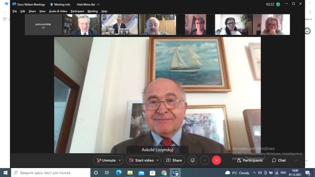 Учасникам онлайн-зустрічі презентували видавничий проєкт «Україна в сучасному світі». Тексти, зібрані в цій книзі, написані Аскольдом Лозинським в період від вересня 2020 до початку вересня 2021 р. Це роздуми автора про місце та роль України в сучасному світі, присвячені 30-річчю її Незалежності. Вони згруповані за хронологічно-проблемним принципом у тематичні розділи, що відображають до певної міри квінтесенції відповідних часових відрізків, і зокрема, президентські вибори у США, проблеми й перспективи утвердження української ідентичності на сучасному етапі, становище України на міжнародній арені та актуальні для нашої країни внутрішні й зовнішні випробування та завдання в контексті величного національного свята – 30-річчя відновлення державної незалежності України.