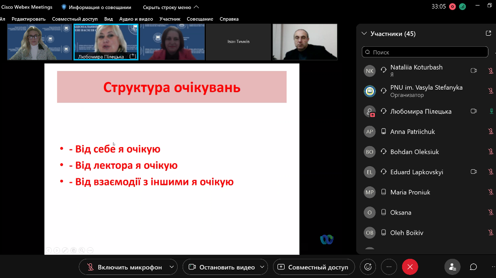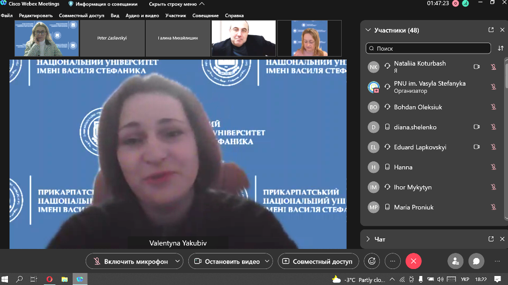 21 січня 2022 р. в Університеті відбулася чергова онлайн-зустріч із працівниками та студентами закладу вищої освіти в межах корпоративного соціально-відповідального проєкту «Наше здоров’я». На початку заходу учасників привітала проректорка з наукової роботи Валентина Якубів, яка наголосила на важливості та актуальності проведення таких зустрічей.
