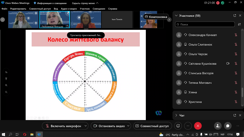 Чергова онлайн-зустріч була присвячена темі емоційного вигорання. Завідувачка кафедри соціальної психології факультету психології, докторка психологічних наук Любомира Пілецька розкрила сутність даного поняття, охарактеризувала чинники, які впливають на емоційну стабільність сучасної особистості, а найголовніше – привідкрила завісу щодо профілактики емоційного вигорання для студентів та працівників ЗВО. Лекторка також відкрила особливості заспокоєння в конфліктних чи емоційних ситуаціях та рекомендувала кожному створити для себе «Колесо життєвого балансу» для формування емоційно стабільного навколишнього середовища, яке покаже що потрібно зробити для гармонізації нашого життя.