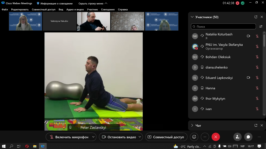 Також під час онлайн-зустрічі аспірант кафедри фізичної терапії, ерготерапії факультету фізичного виховання і спорту Петро Заславський продемонстрував комплекс вправ з профілактика розвантаження м’язів хребта у зв’язку з постійною сидячою роботою.