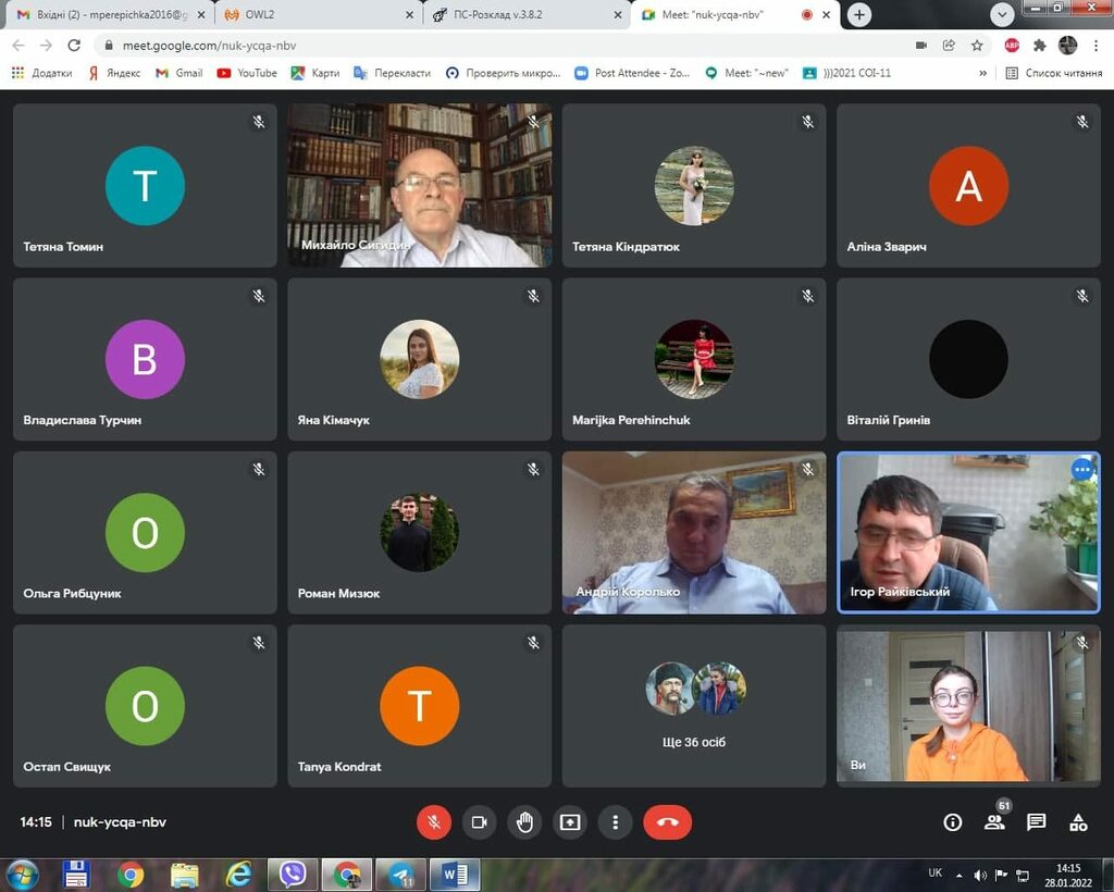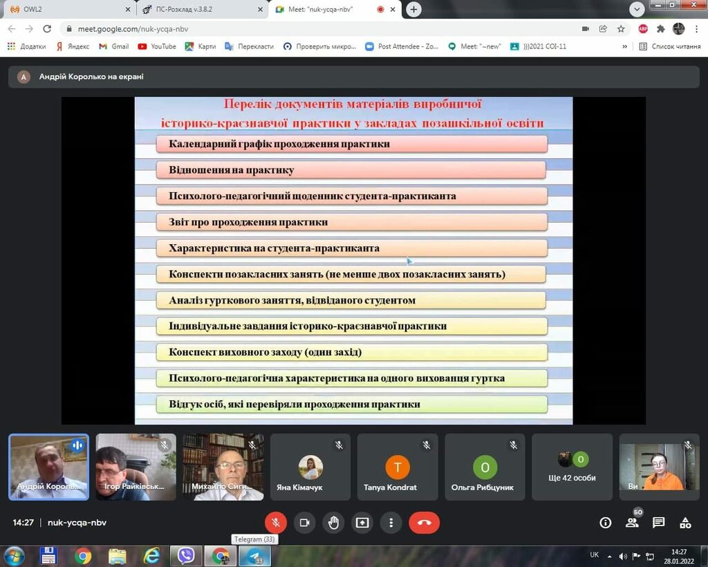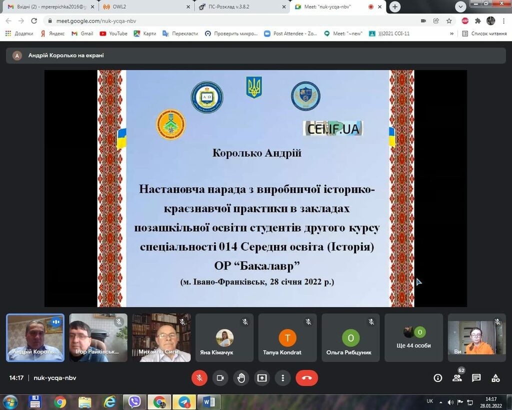 28 січня 2022 р. за допомогою сервісу організації конференцій Google Meet відбулася настановча нарада з організації проведення виробничої історико-краєзнавчої практики в закладах позашкільної освіти для студентів ІІ курсу спеціальності 014 Середня освіта (Історія) ОР «Бакалавр» (денна і заочна форма навчання). Вона спрямована на конкретну професіоналізацію та збільшує можливості самореалізації майбутніх керівників гуртків та учителів, є містком для формування в майбутніх керівників гурткової роботи і учителів педагогічних вмінь і навичок, що сприяють розвиткові професійних якостей педагога, потреби в педагогічній самоосвіті.