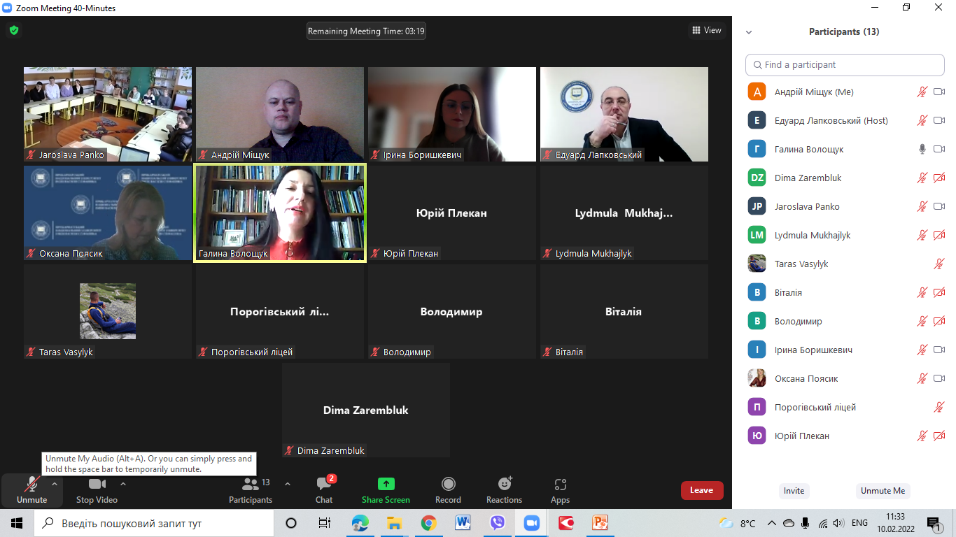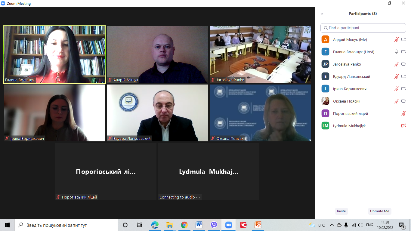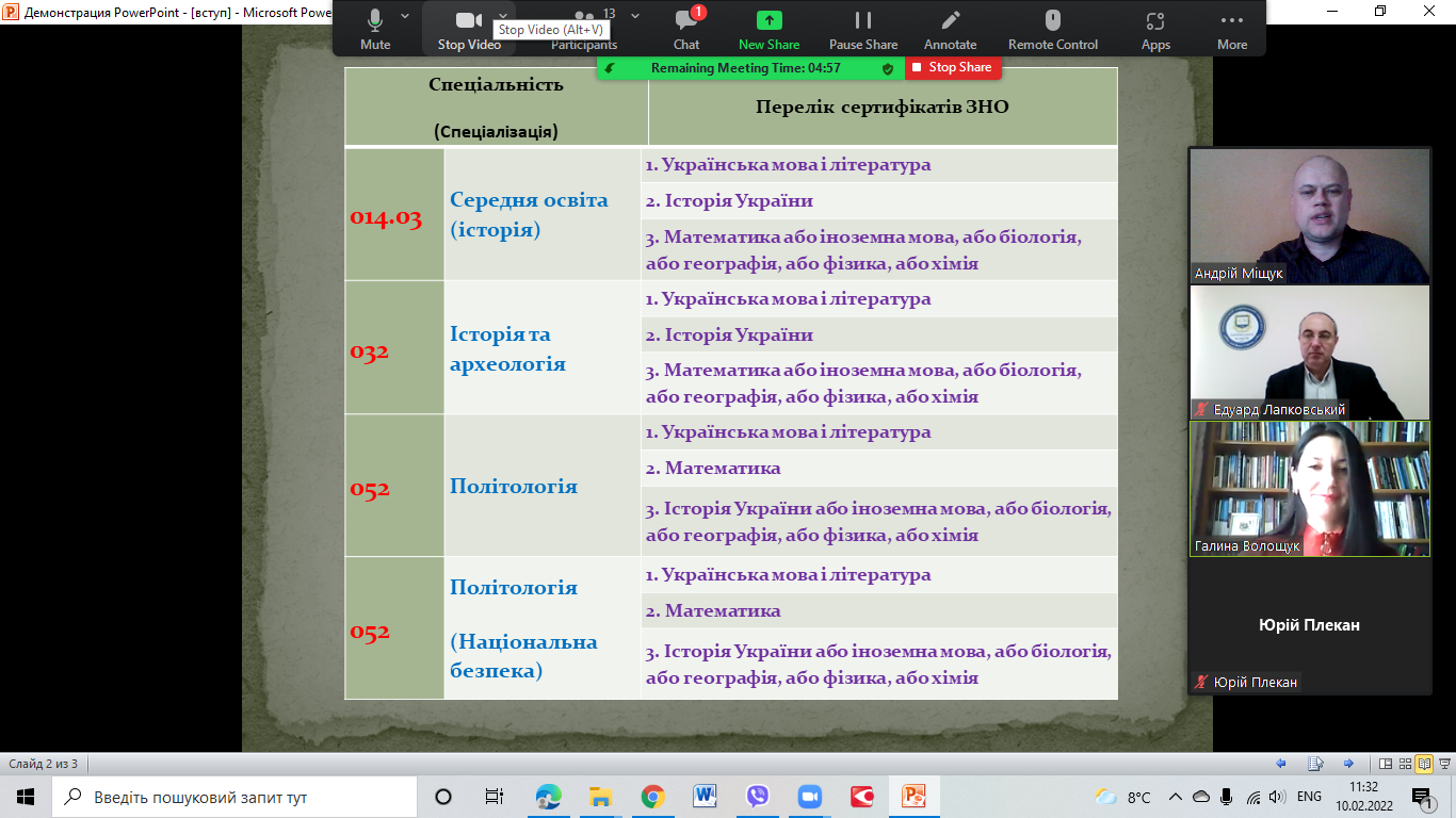 Під час онлайн зустрічі провідний фахівець з профорієнтації Галина Волощук, відповідальний секретар Приймальної комісії Прикарпатського національного університету імені Василя Стефаника Едуард Лапковський, відповідальний секретар відбіркової комісії Факультету історії, політології і міжнародних відносин Андрій Міщук Іванович та інші викладачі закладу вищої освіти ознайомили присутніх з умовами Вступу 2022 року до Університету та зокрема на освітні програми Факультету історії, політології і міжнародних відносин.