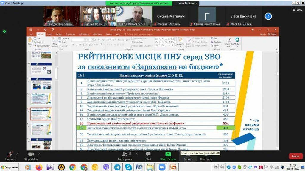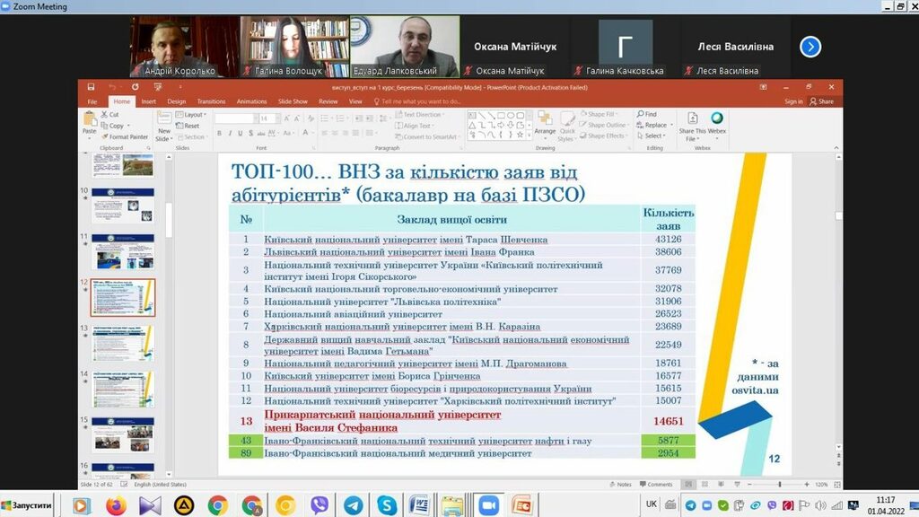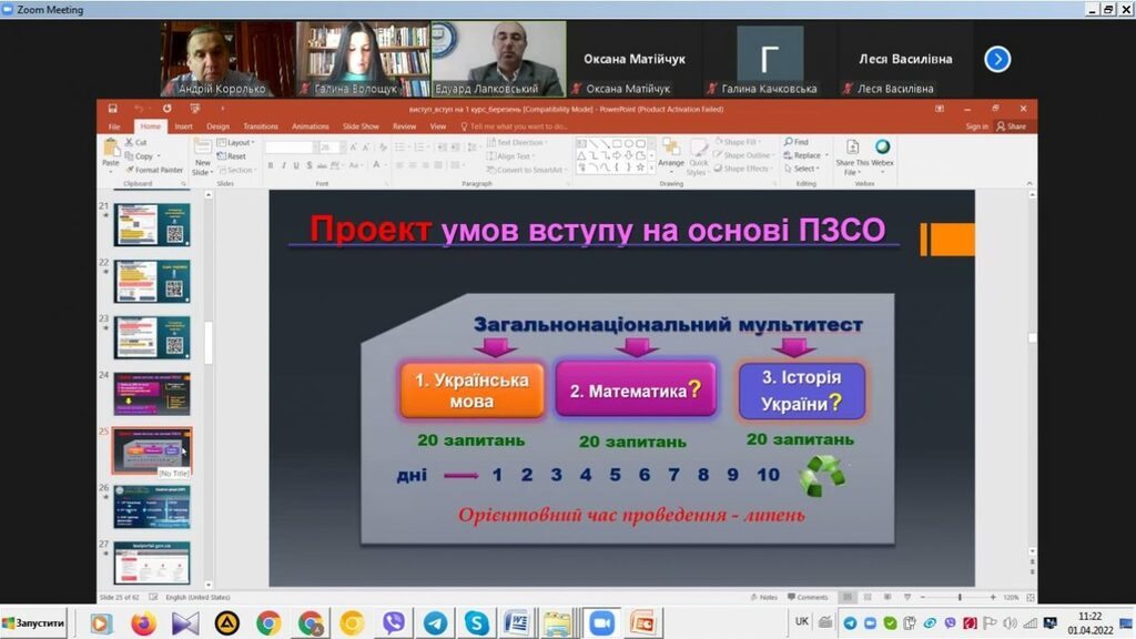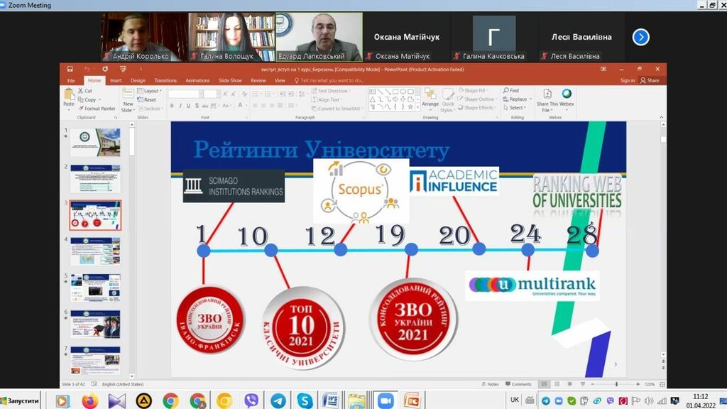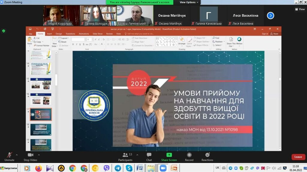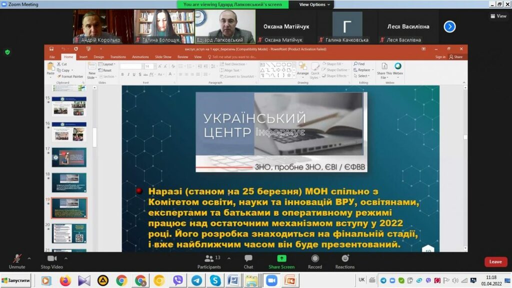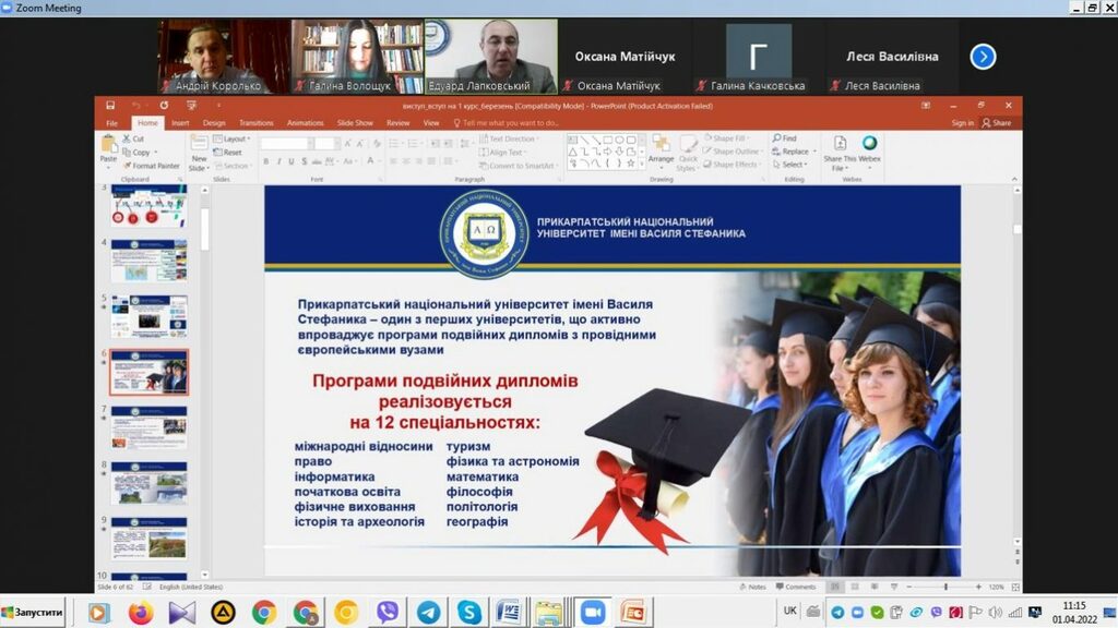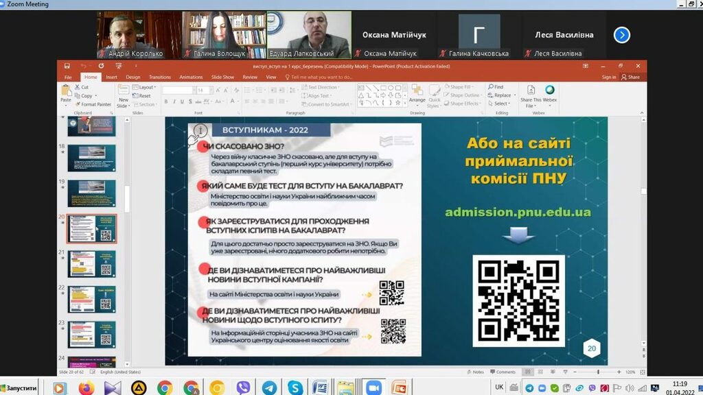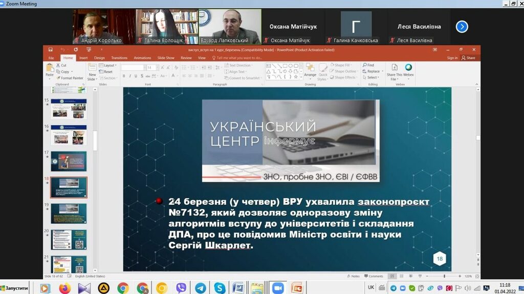 Провідний фахівець з профорієнтації Інституту післядипломної освіти та довузівської підготовки Галина Волощук та відповідальний секретар Приймальної комісії Прикарпатського національного університету імені Василя Стефаника Едуард Лапковський ознайомили присутніх із перевагами навчання в Університеті та розповіли про специфіку і умови цьогорічного вступу. Зокрема, відповідальний секретар Приймальної комісії Едуард Лапковський зупинив свою увагу на оновлених вимогах прийому вступу в умовах воєнного стану, вказавши, що 24 березня 2022 р. Верховна Рада України ухвалила законопроєкт № 1732, який дозволяє одноразову зміну алгоритмів вступу до університетів і складання ДПА. Наразі МОН України спільно з Комітетом освіти, науки та інновацій Верховної Ради України, освітянами, експертами та батьками в оперативному режимі працює над остаточним механізмом вступу у 2022 р. Його розробка знаходиться на фінальній стадії, і вже найближчим часом він буде презентований.