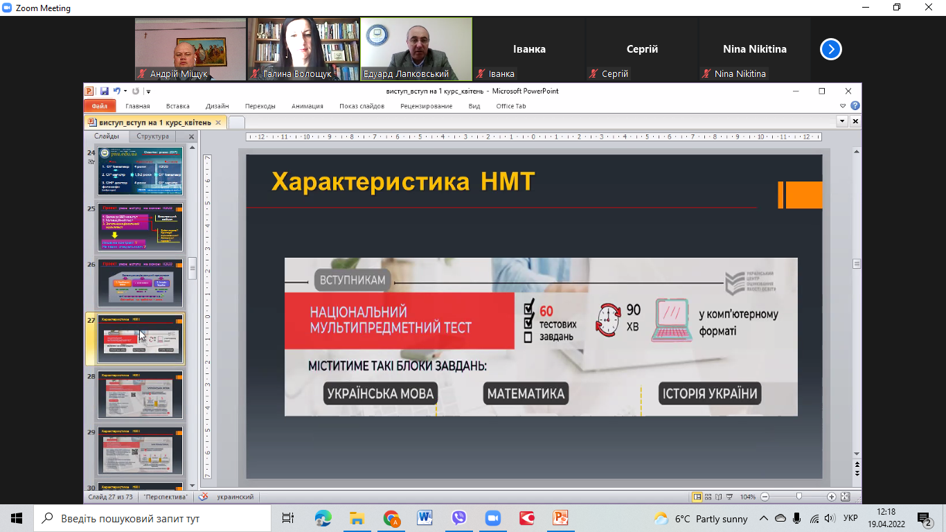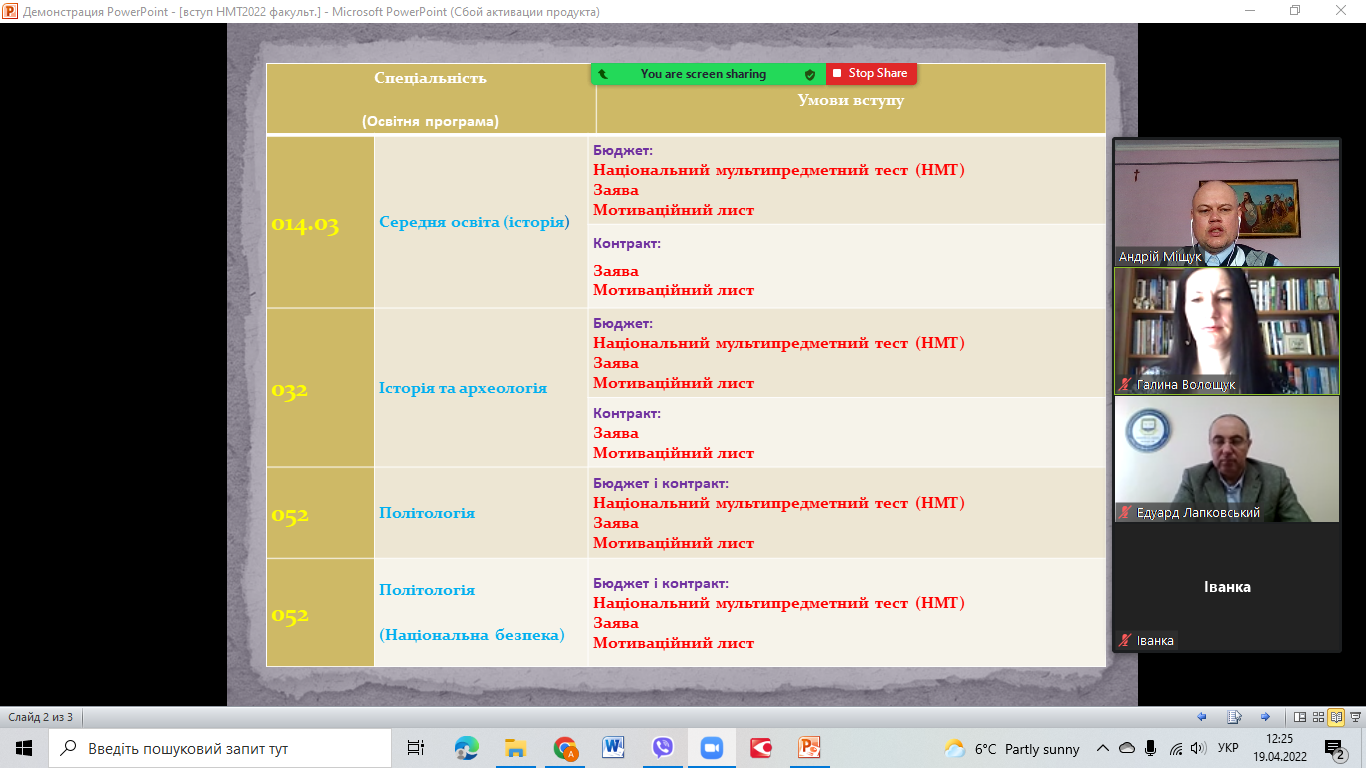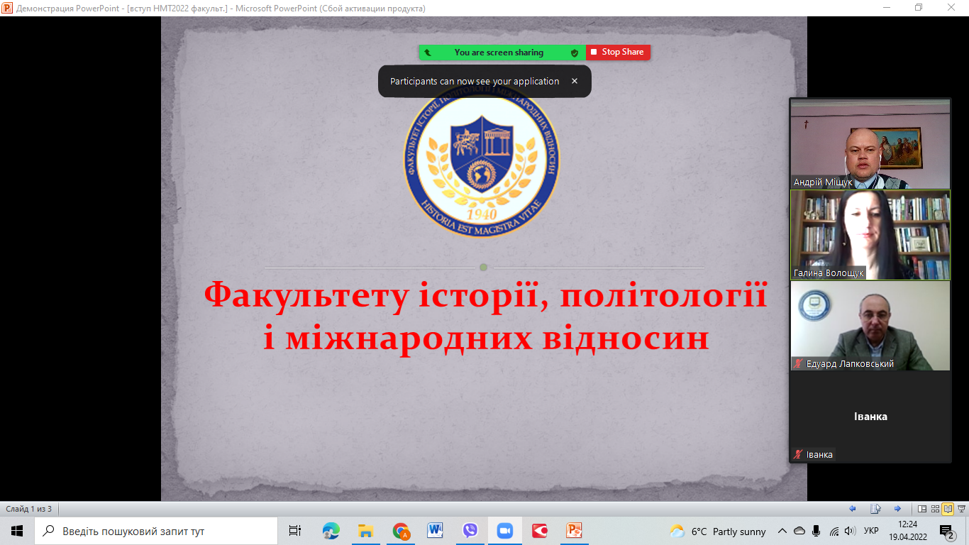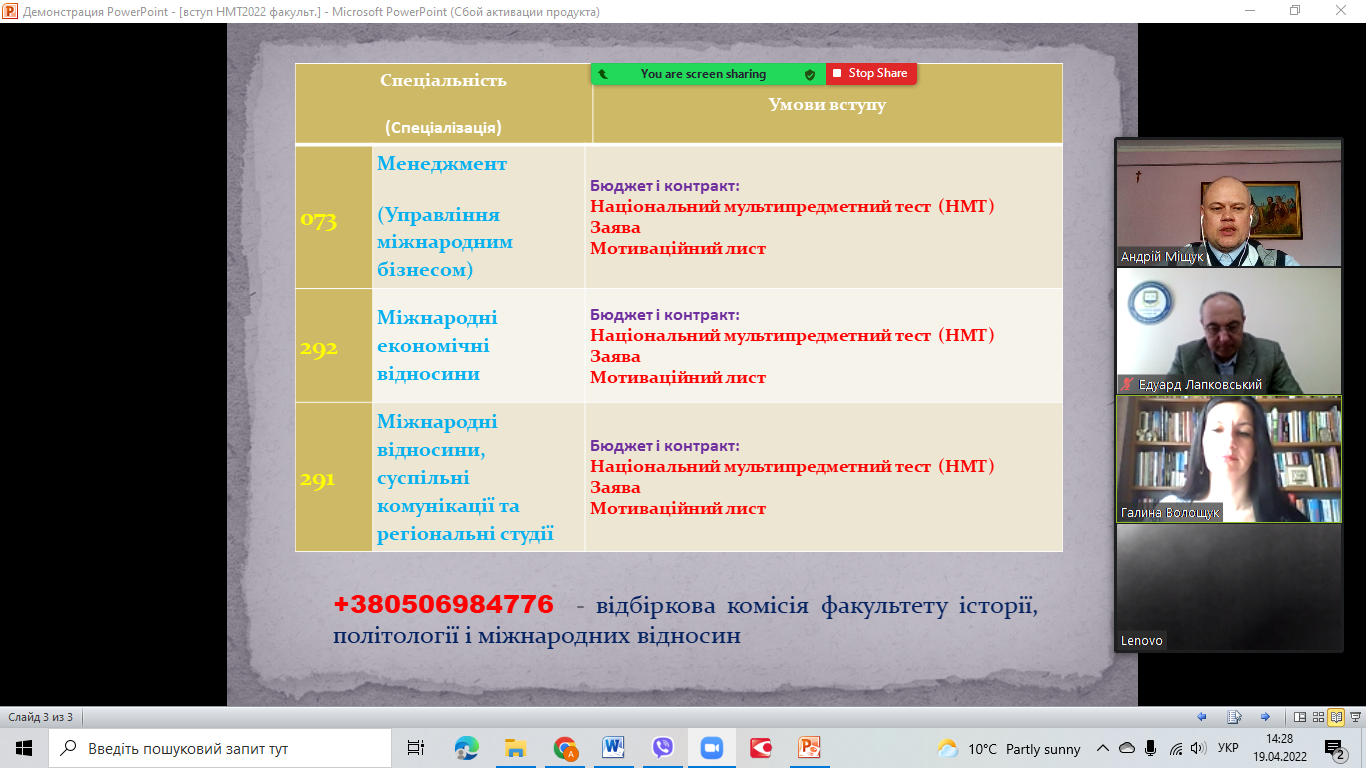 19 квітня 2022 р. відповідальний секретар відбіркової комісії Факультету історії, політології і міжнародних відносин, доцент кафедри історії України і методики викладання історії Андрій Міщук долучився до онлайн-зустрічі «Особливості вступу–2022. Що змінилося?» в рамках проєкту «Обери своє майбутнє» з випускниками Войнилівського ліцею Войнилівської ТГ та Тустанського ліцею Дубовецької ТГ Калуського району Івано-Франківської обл., організованої Прикарпатським національним університетом імені Василя Стефаника.