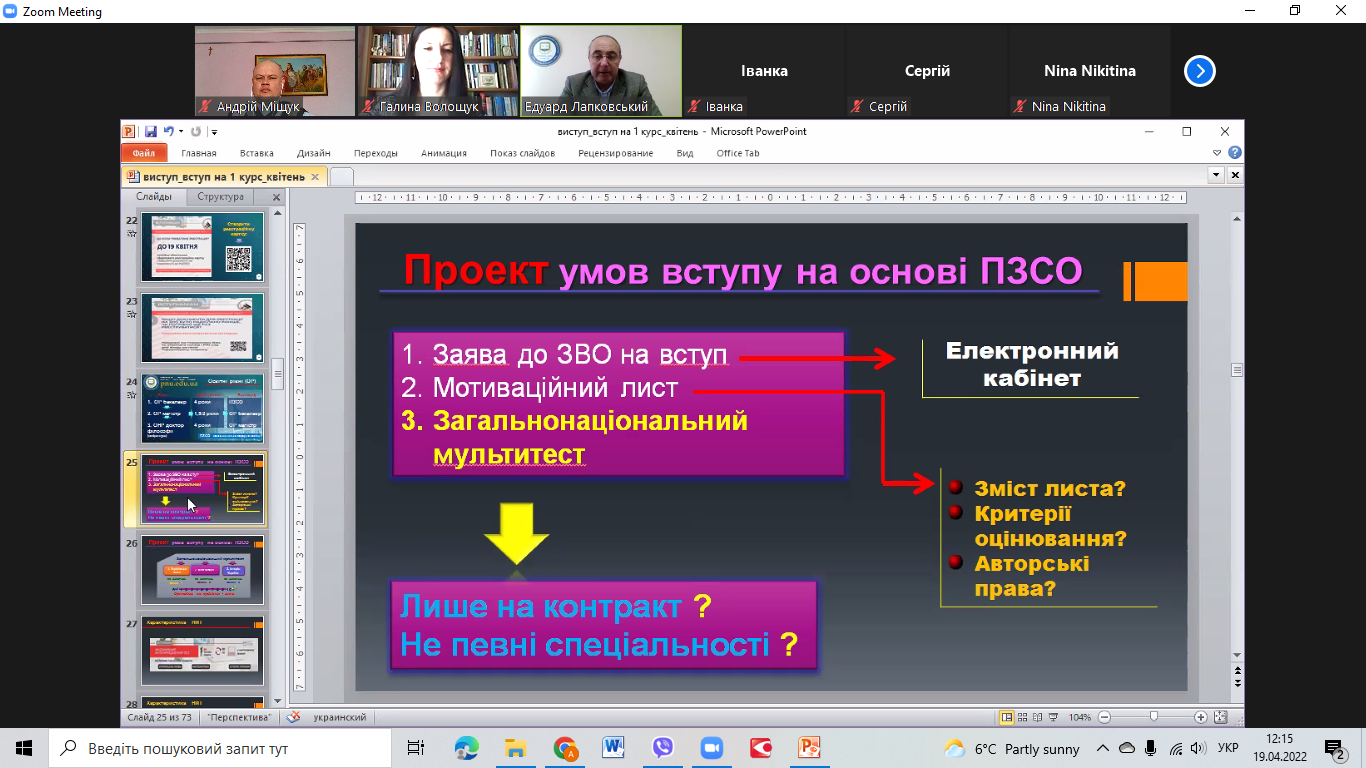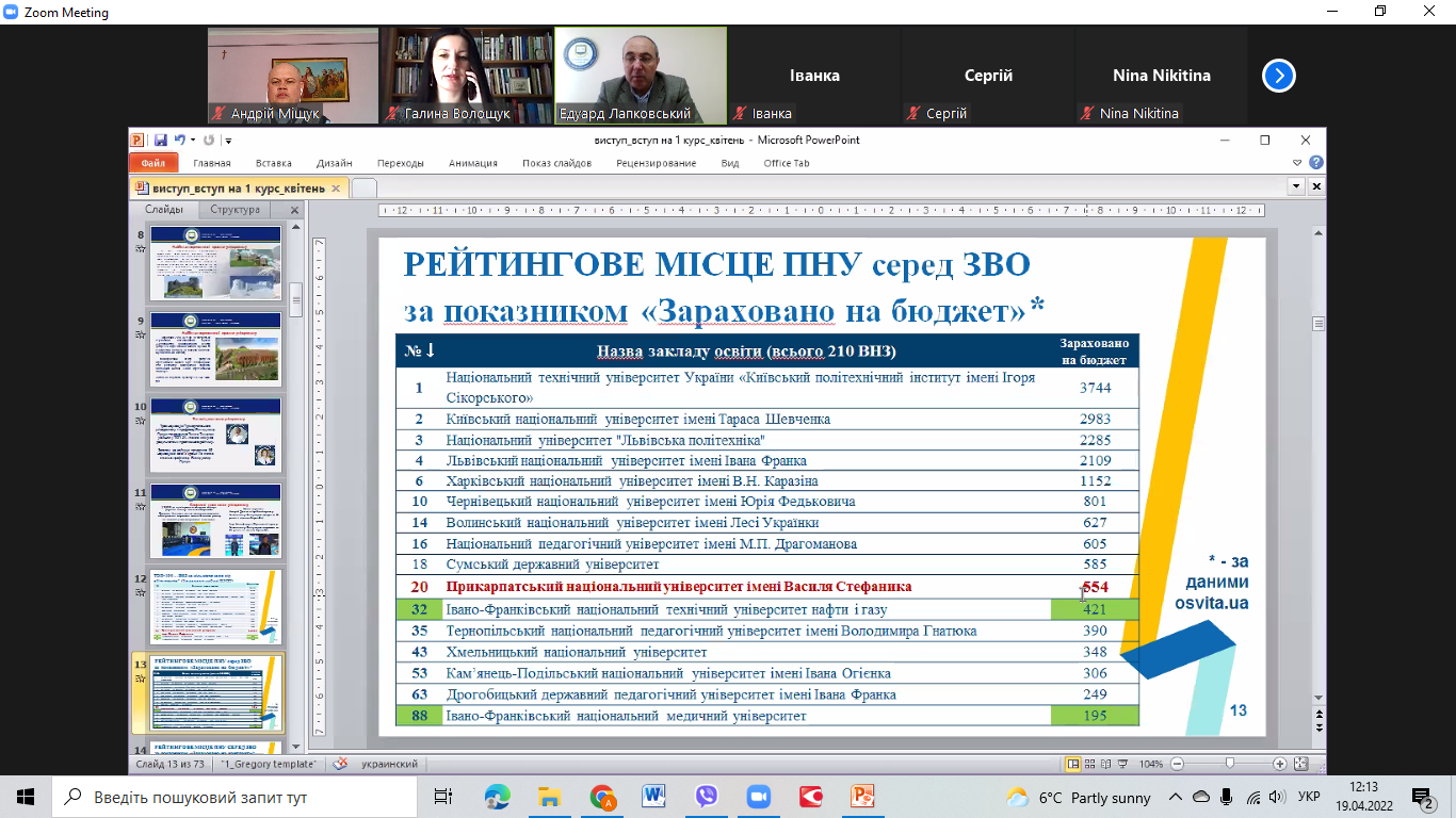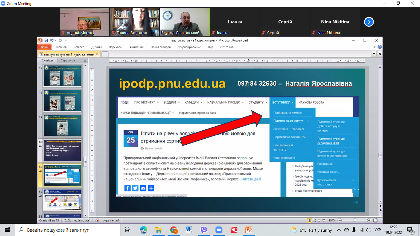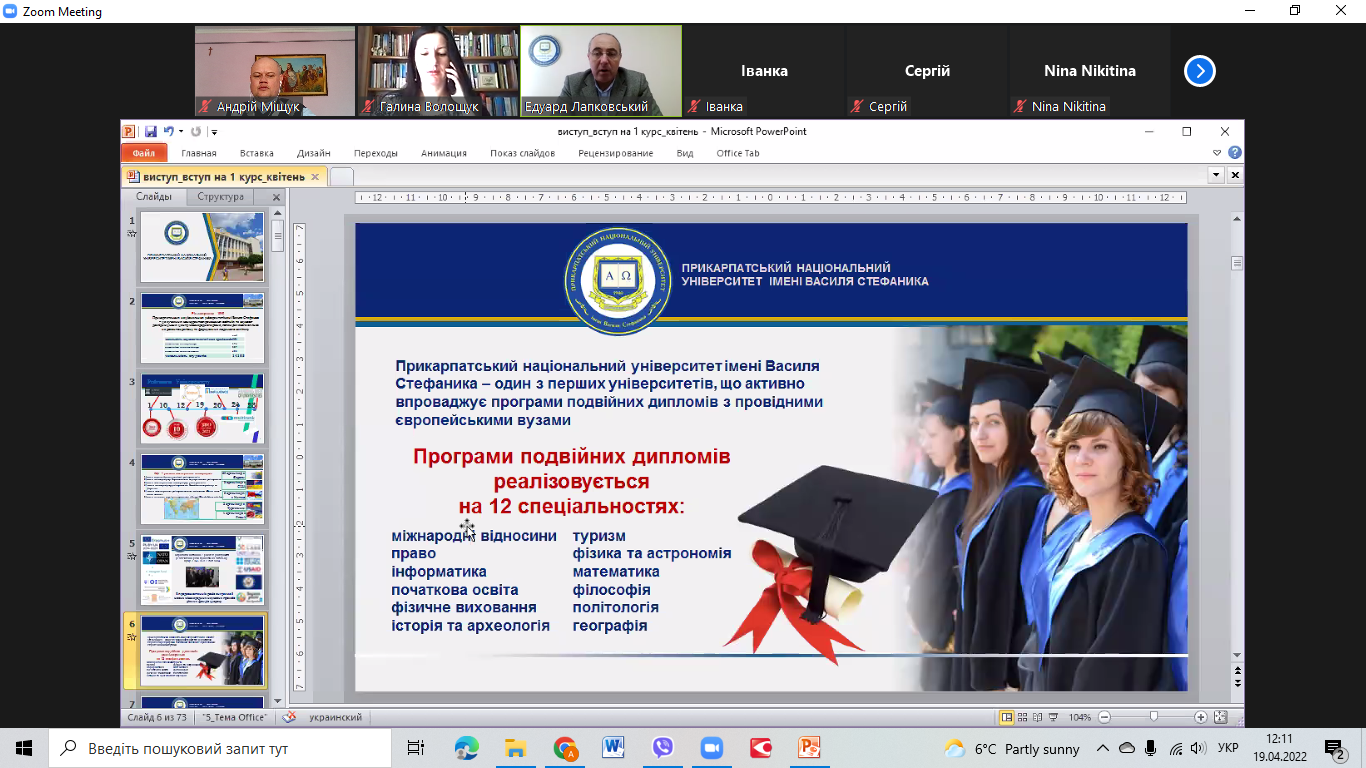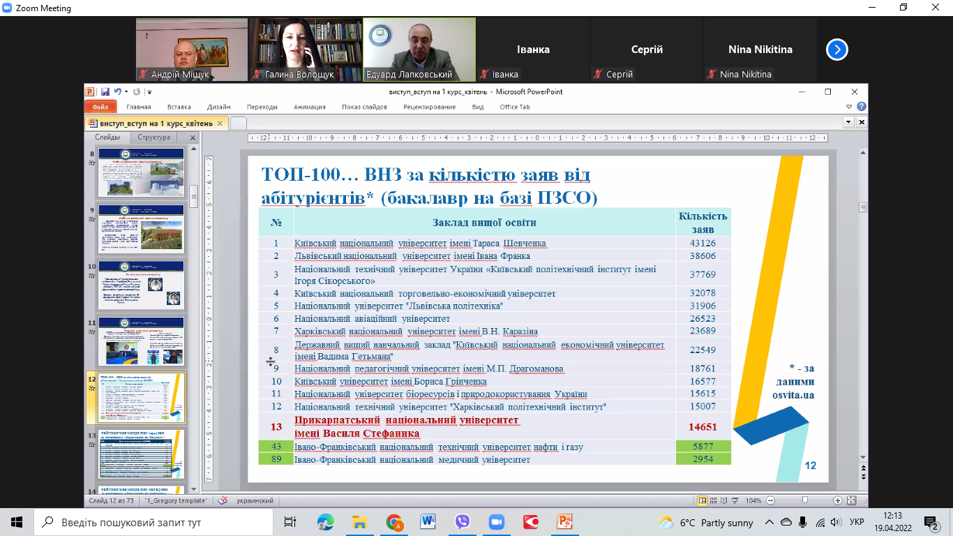 19 квітня 2022 р. відповідальний секретар відбіркової комісії Факультету історії, політології і міжнародних відносин, доцент кафедри історії України і методики викладання історії Андрій Міщук долучився до онлайн-зустрічі «Особливості вступу–2022. Що змінилося?» в рамках проєкту «Обери своє майбутнє» з випускниками Войнилівського ліцею Войнилівської ТГ та Тустанського ліцею Дубовецької ТГ Калуського району Івано-Франківської обл., організованої Прикарпатським національним університетом імені Василя Стефаника.