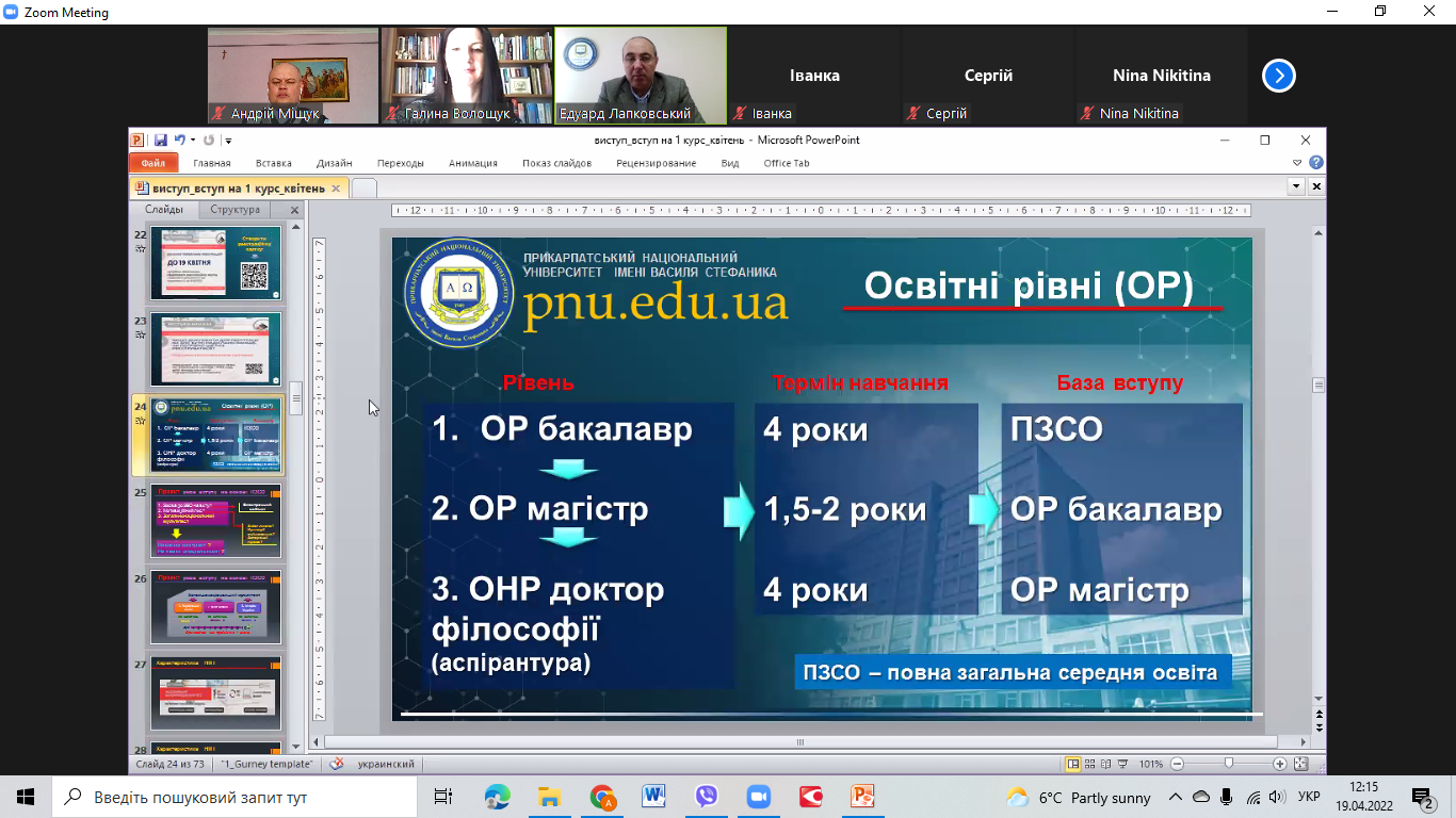 Провідний фахівець з профорієнтації Інституту післядипломної освіти та довузівської підготовки Університету Галина Волощук та відповідальний секретар Приймальної комісії Прикарпатського національного університету імені Василя Стефаника Едуард Лапковський ознайомили присутніх із перевагами навчання у закладі вищої освіти та розповіли про специфіку і умови цьогорічного вступу під час воєнного стану.