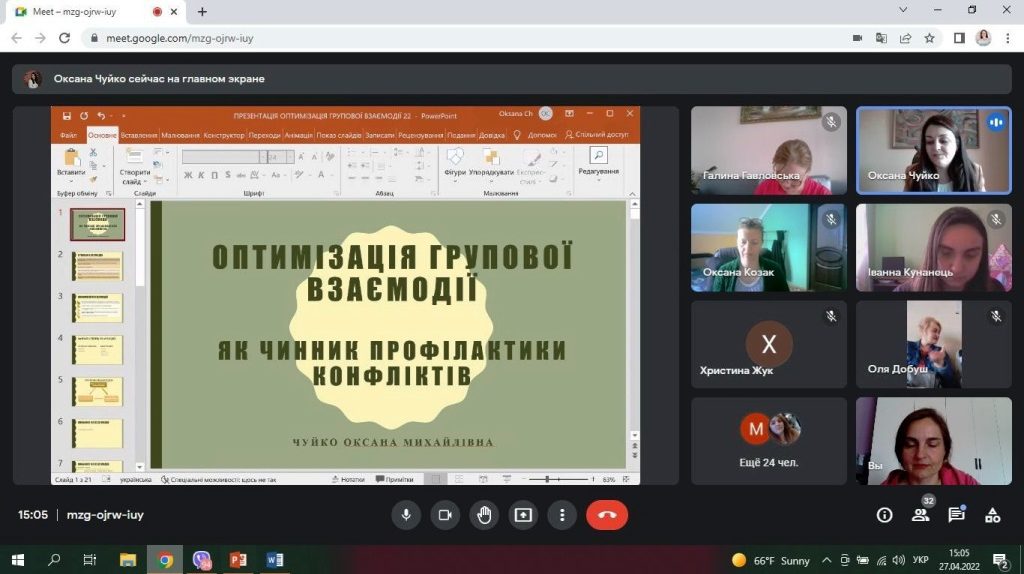 Оксана Чуйко говорила про оптимізацію групової взаємодії як чинник профілактики конфліктів. Група проаналізувала структуру та різні типи групової взаємодії (конфлікти, конкуренцію, кооперацію, співпрацю), виокремила їх сильні сторони та проблемні аспекти, які не сприяють ефективній взаємодії. Акцент зроблено на перехід від конфліктів, конкуренції до кооперації та співпраці. Розглянуто методи та техніки, спрямовані на формування навиків конструктивної взаємодії. Учасники надали позитивні відгуки про тренінг та отримані техніки.
