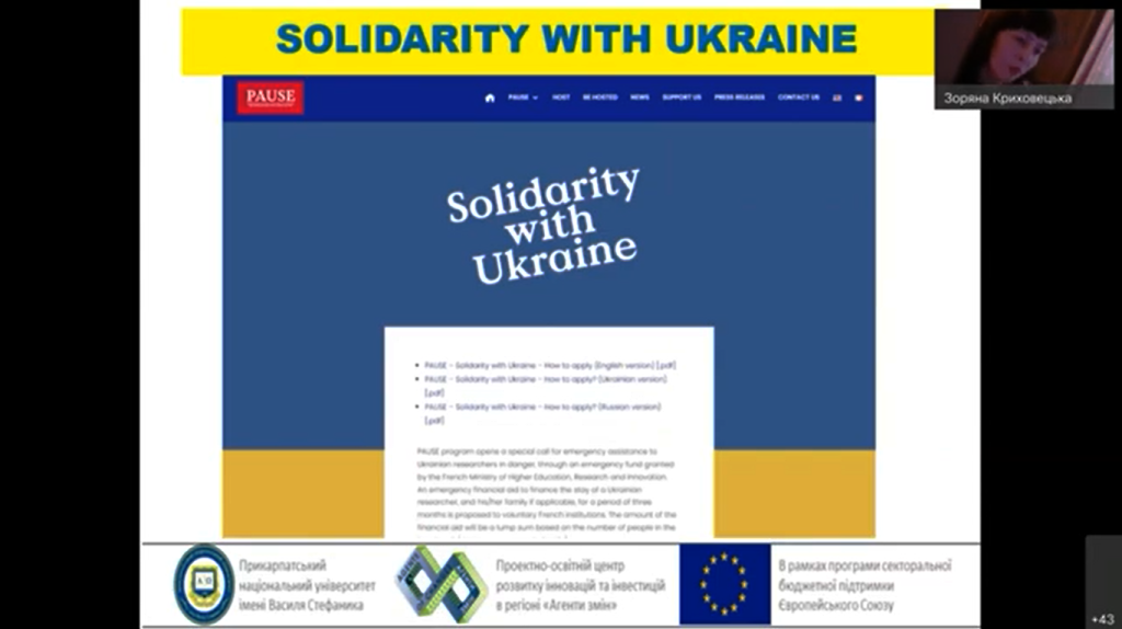 Проектно-освітній центр «Агенти змін» Прикарпатського національного університету імені Василя Стефаника за участю стипендіатки програми Фулбрайт 4 травня 2022 р. провели вебінар для науковців, освітян, фахівців мистецької та інших сфер на актуальну тематику: «Грантові можливості та гуманітарні ініціативи для українських науковців, освітян в умовах війни».