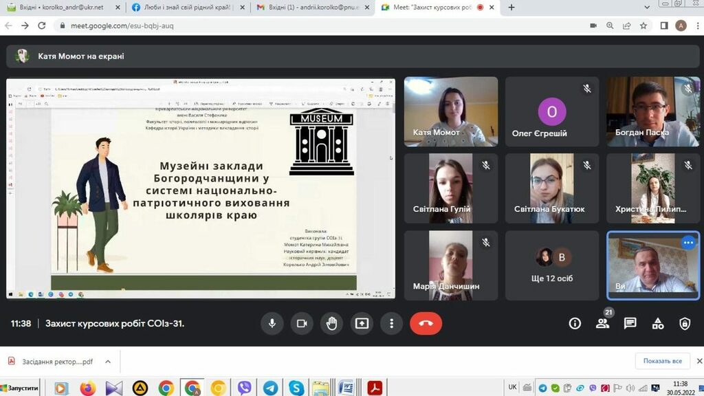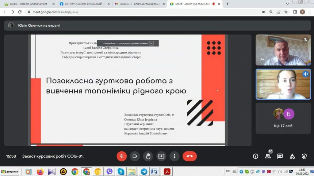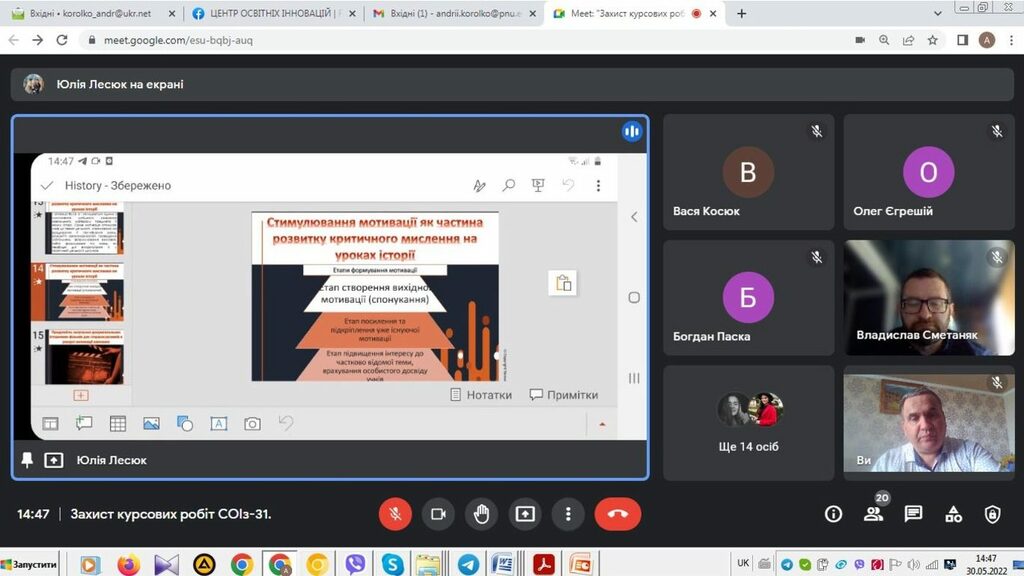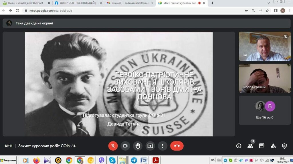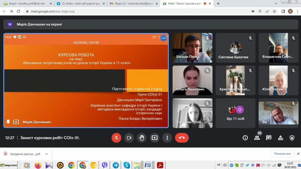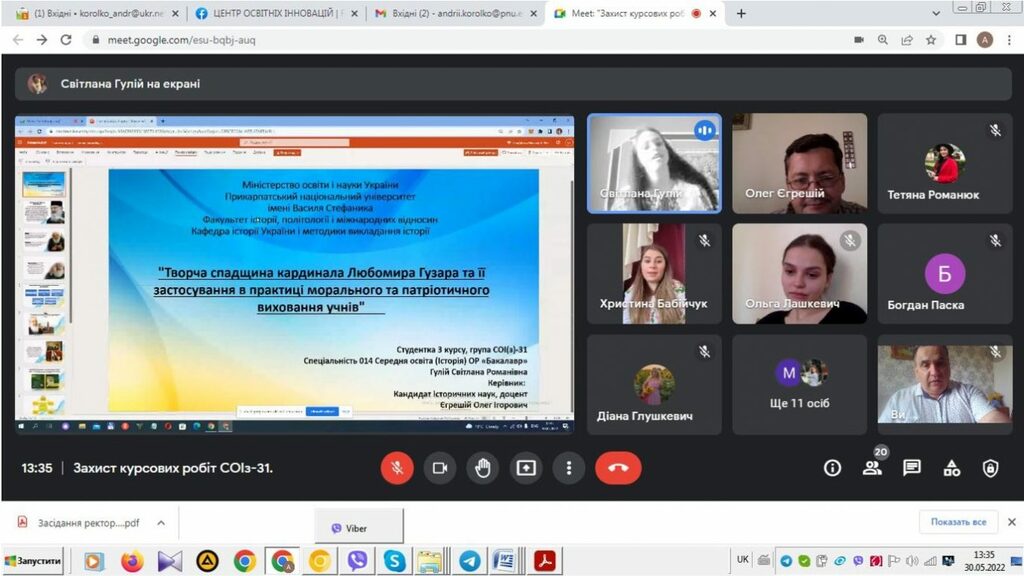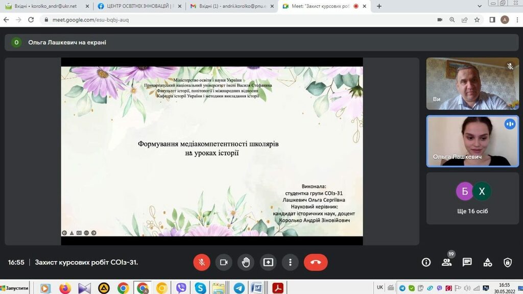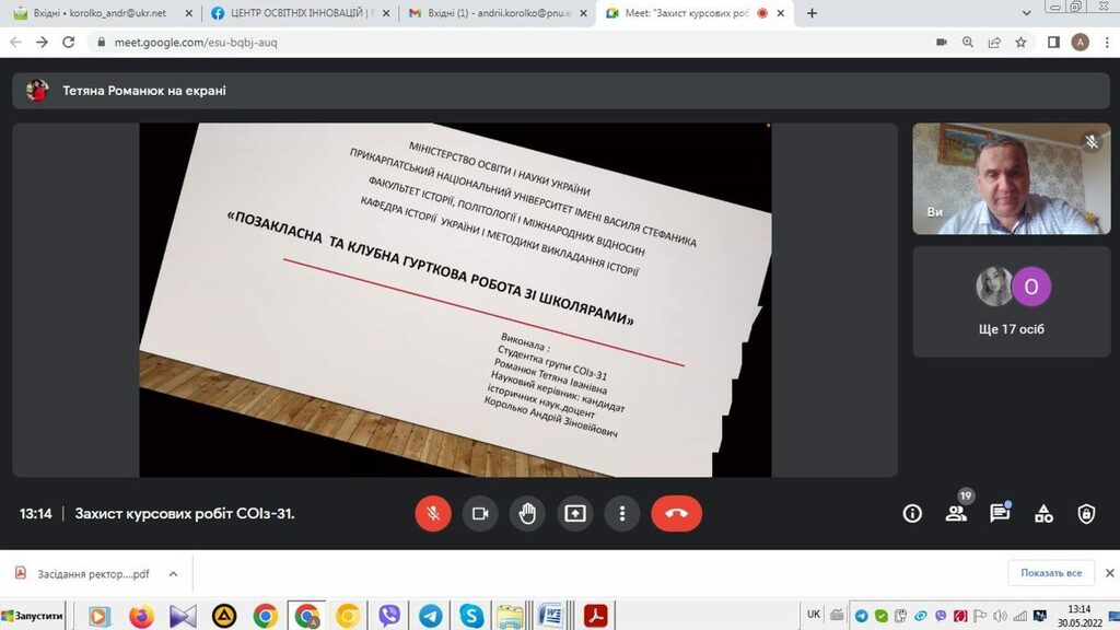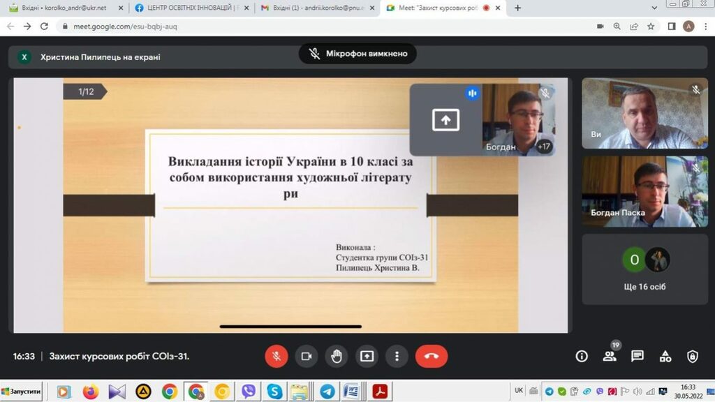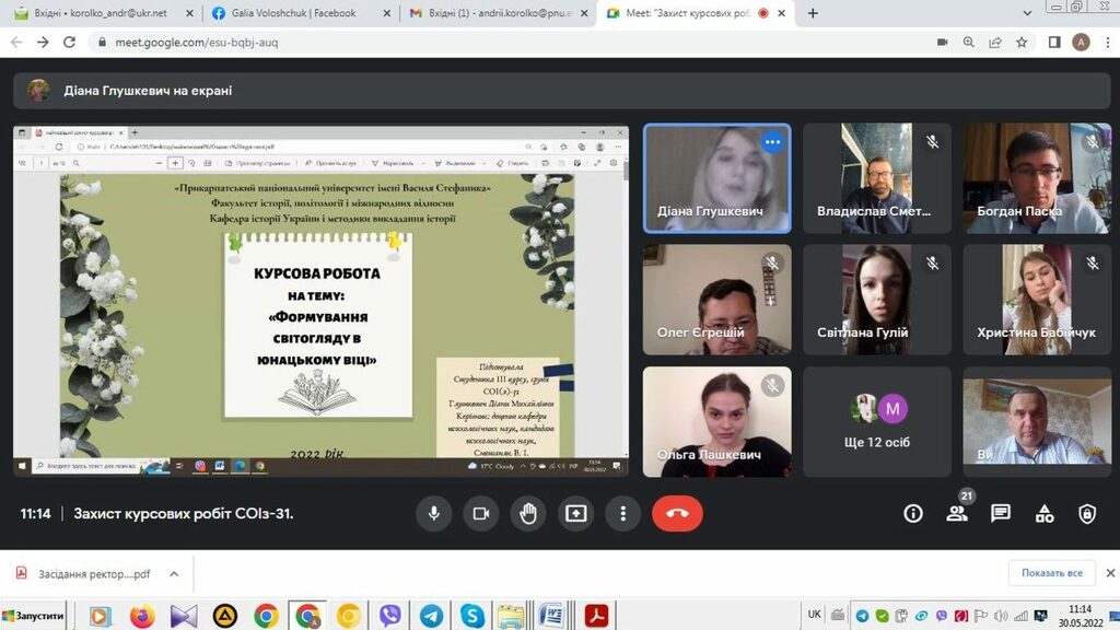 30 травня 2022 р. відбувся онлайн-захист курсових робіт студентів ІІІ курсу спеціальності 014 Середня освіта (Історія) ОР «Бакалавр» (заочна форма навчання) з методики викладання історії і психолого-педагогічних дисциплін. До складу комісії, яка оцінювала захист курсових робіт студентів, ввійшли викладачі кафедри історії України і методики викладання історії Факультету історії, політології і міжнародних відносин О.І. Єгрешій, А.З. Королько і Б.В. Паска та кафедри соціальної психології Факультету психології В.І. Сметаняк.
