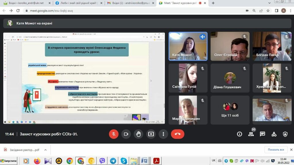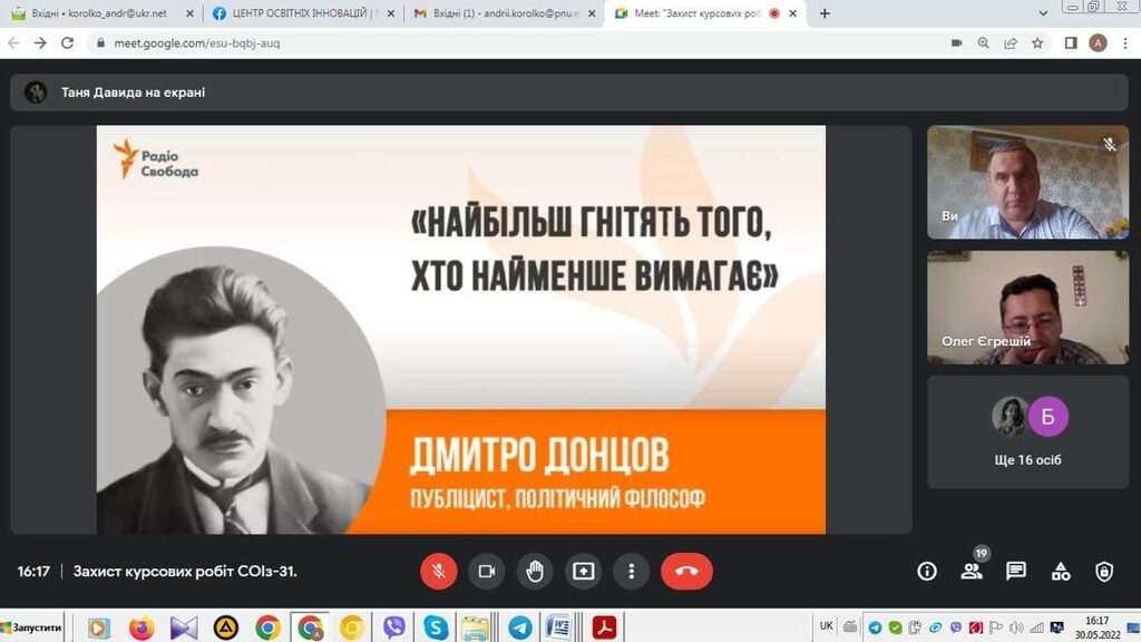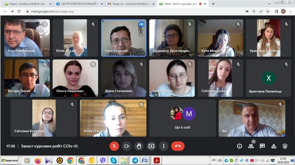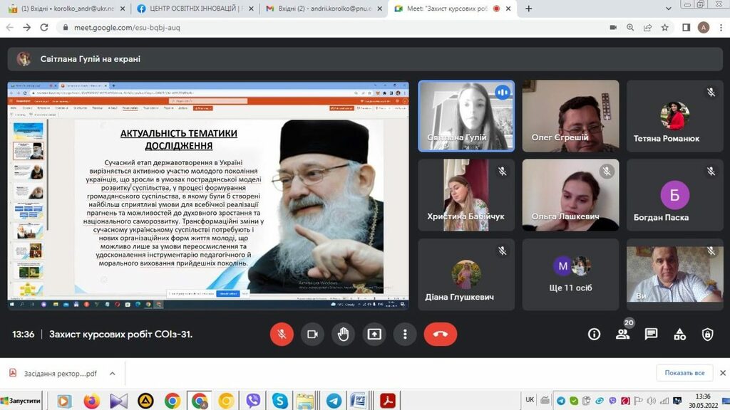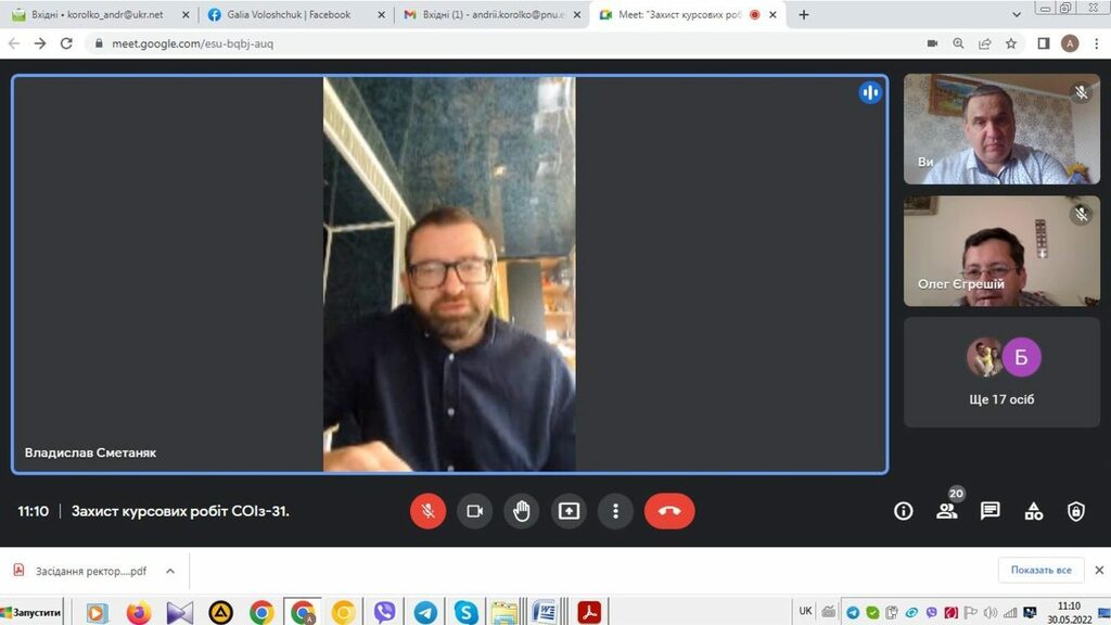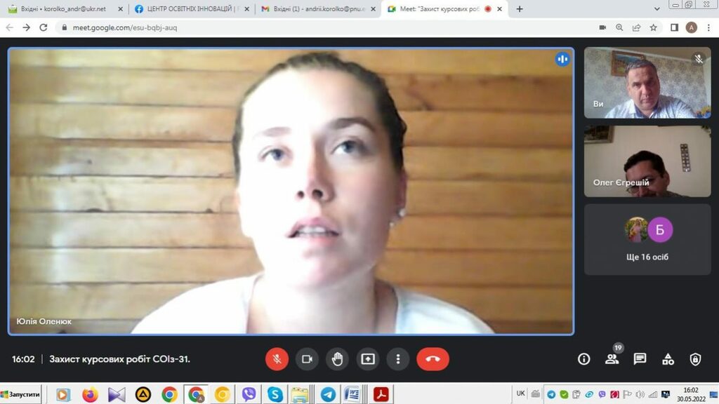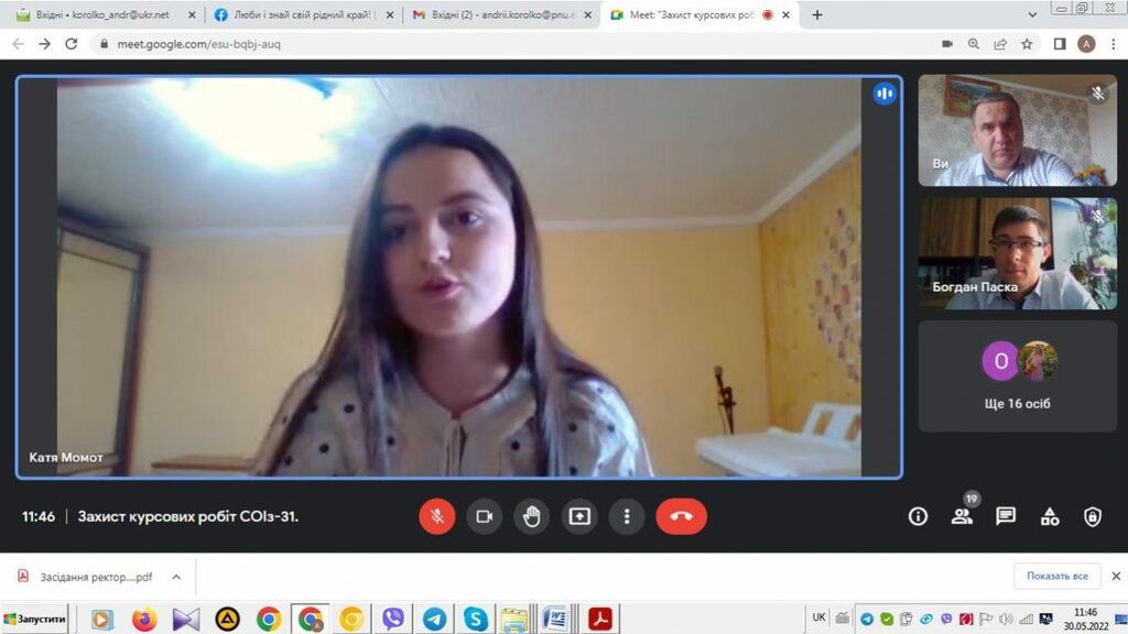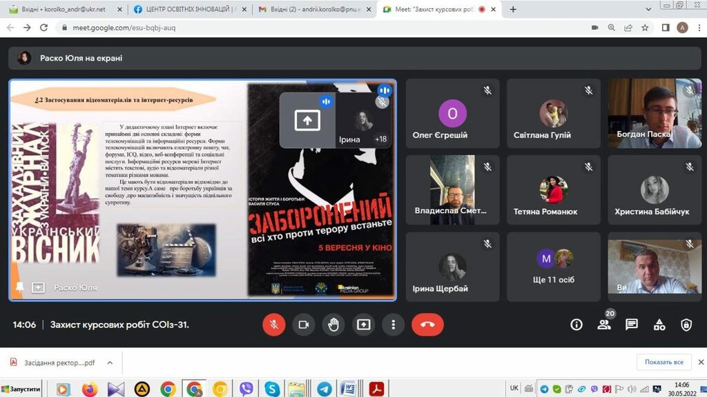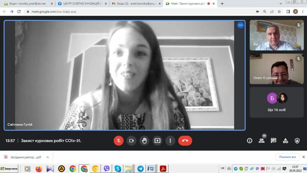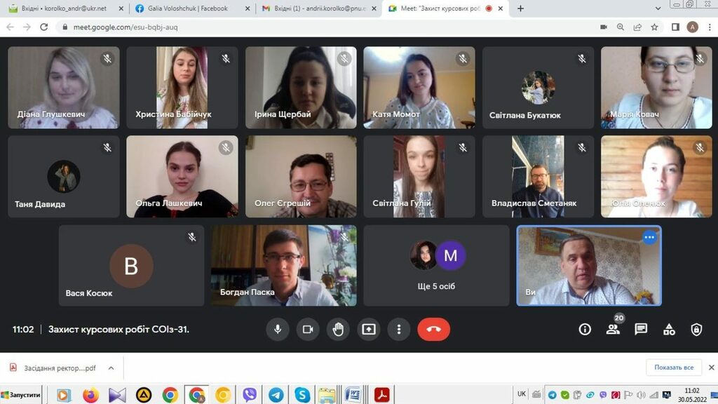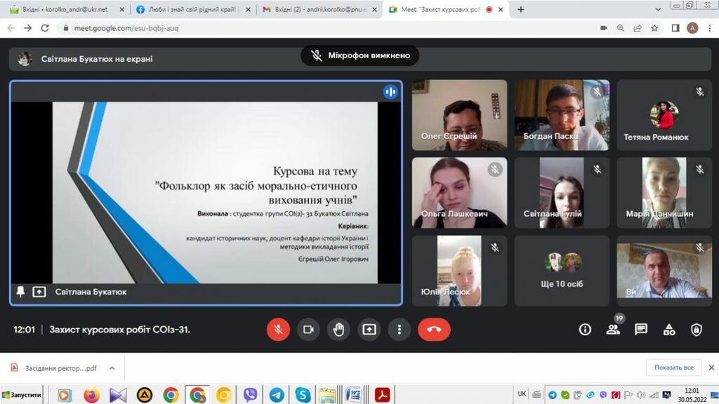 30 травня 2022 р. відбувся онлайн-захист курсових робіт студентів ІІІ курсу спеціальності 014 Середня освіта (Історія) ОР «Бакалавр» (заочна форма навчання) з методики викладання історії і психолого-педагогічних дисциплін. До складу комісії, яка оцінювала захист курсових робіт студентів, ввійшли викладачі кафедри історії України і методики викладання історії Факультету історії, політології і міжнародних відносин О.І. Єгрешій, А.З. Королько і Б.В. Паска та кафедри соціальної психології Факультету психології В.І. Сметаняк.