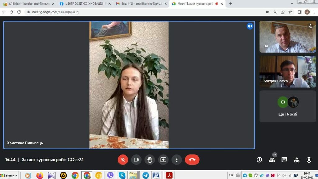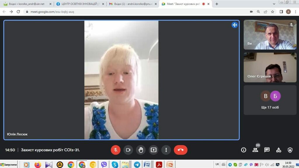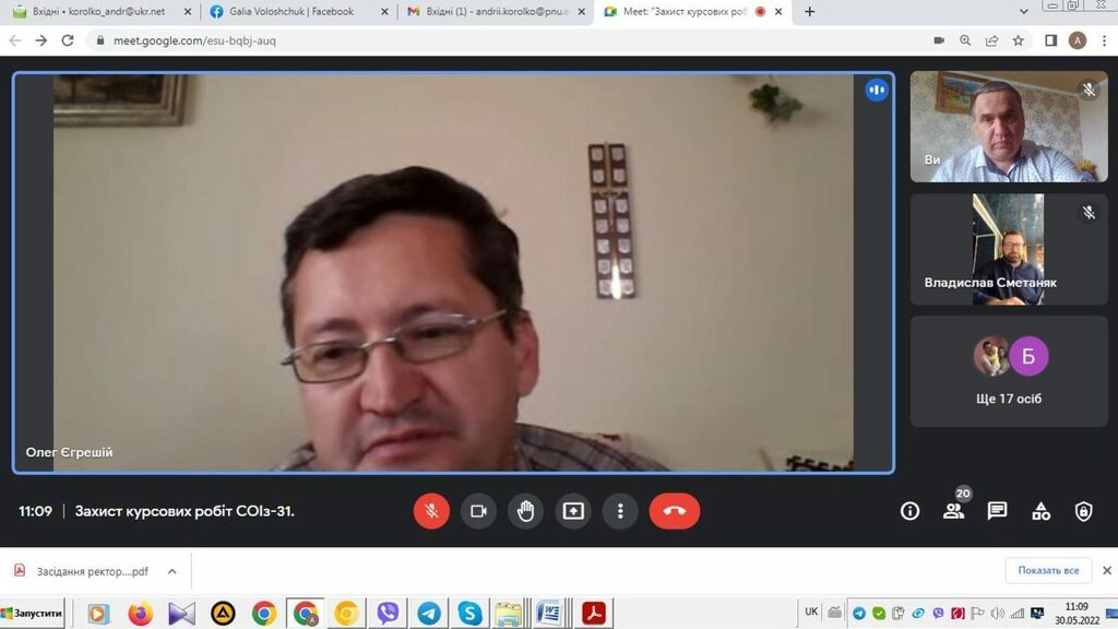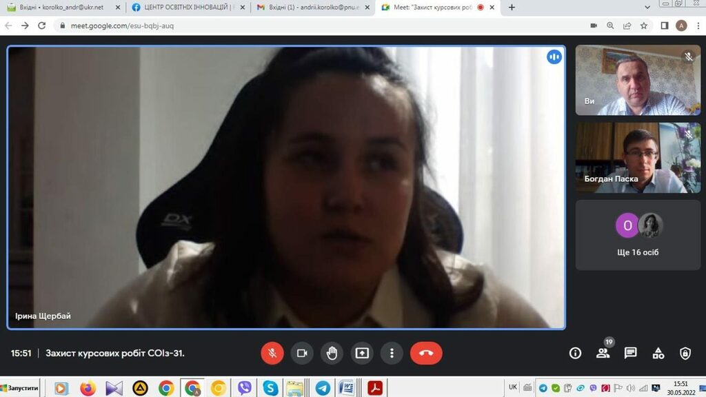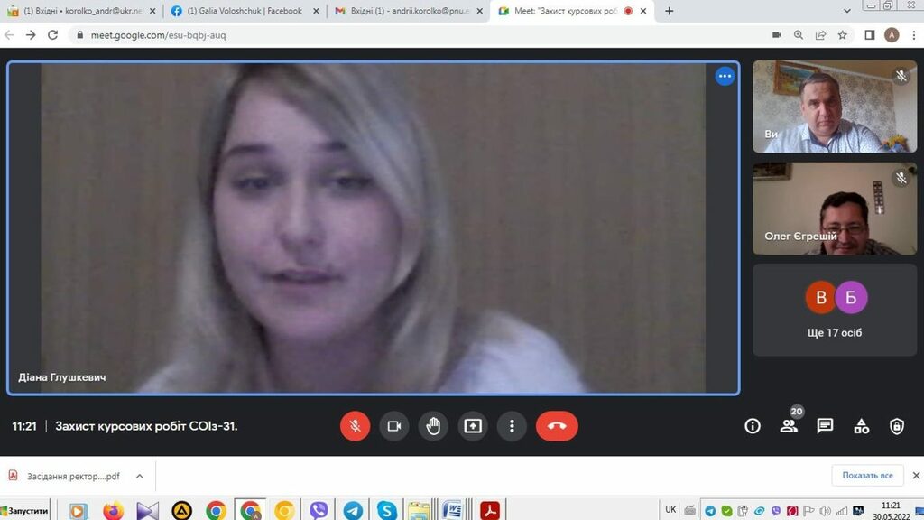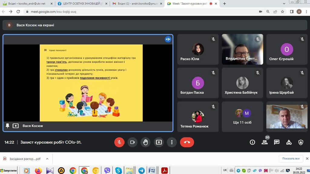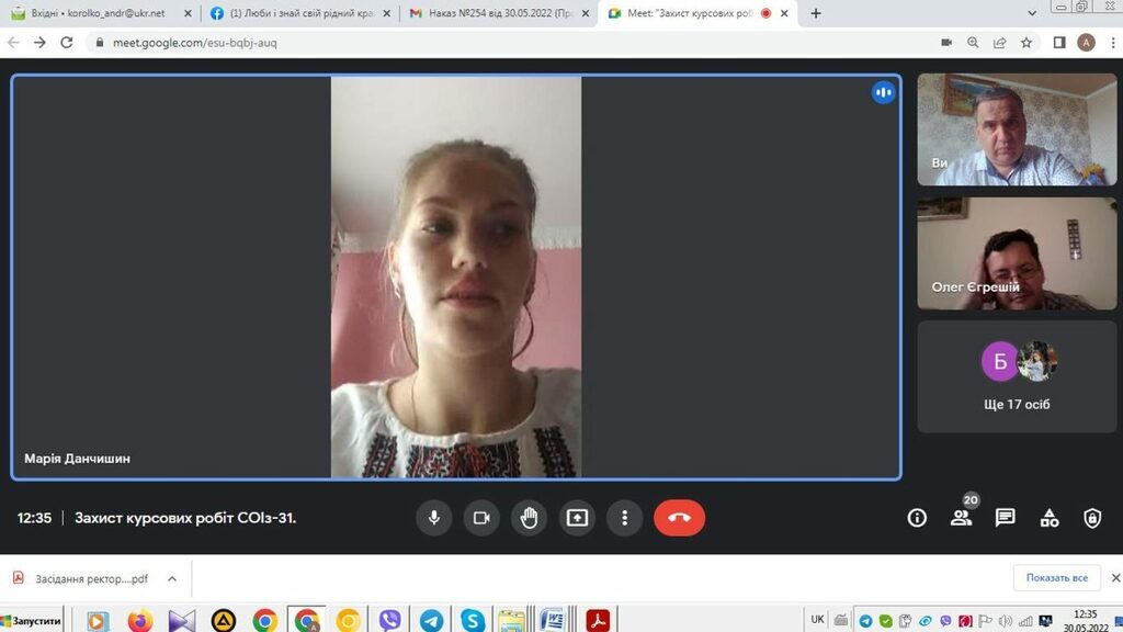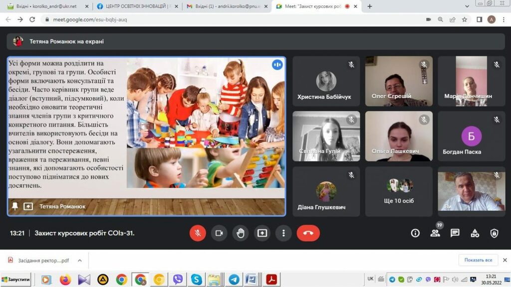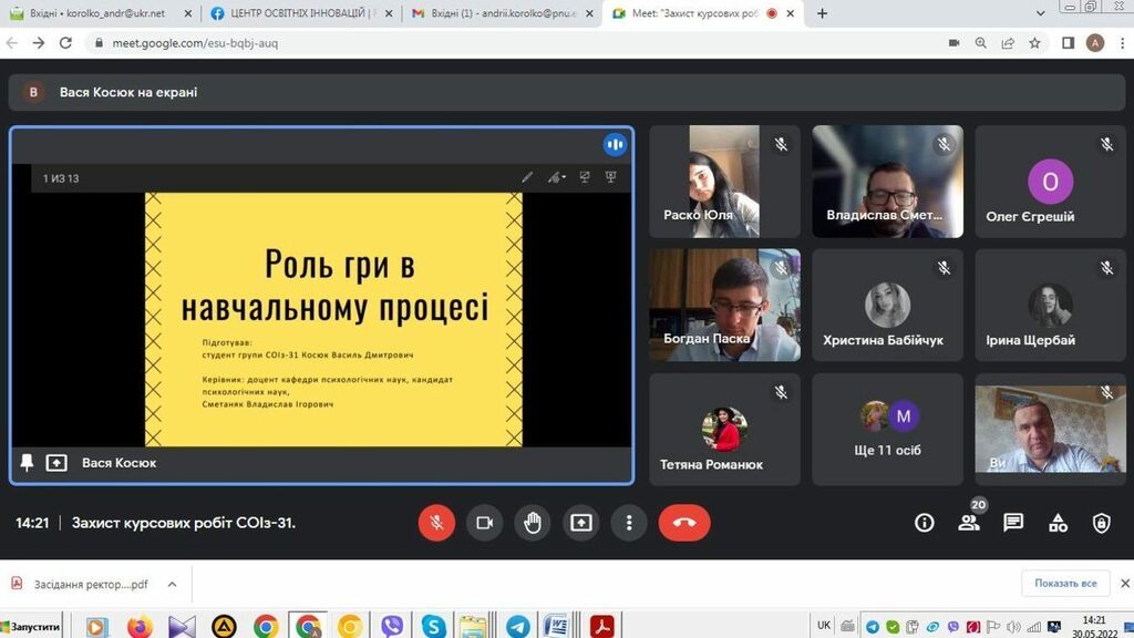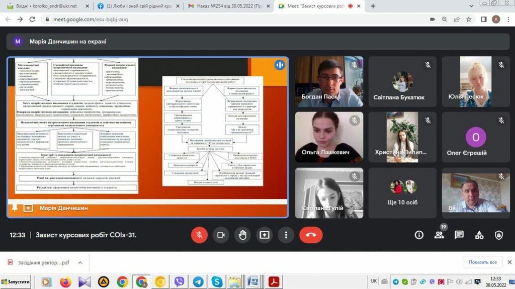 30 травня 2022 р. відбувся онлайн-захист курсових робіт студентів ІІІ курсу спеціальності 014 Середня освіта (Історія) ОР «Бакалавр» (заочна форма навчання) з методики викладання історії і психолого-педагогічних дисциплін. До складу комісії, яка оцінювала захист курсових робіт студентів, ввійшли викладачі кафедри історії України і методики викладання історії Факультету історії, політології і міжнародних відносин О.І. Єгрешій, А.З. Королько і Б.В. Паска та кафедри соціальної психології Факультету психології В.І. Сметаняк.