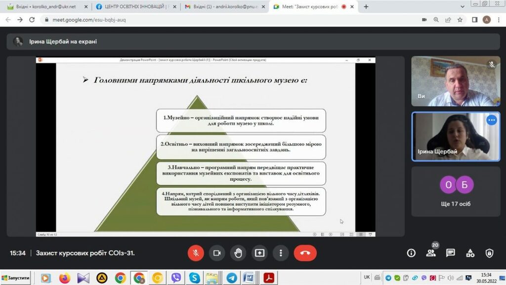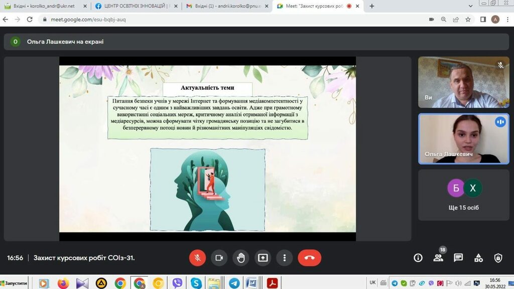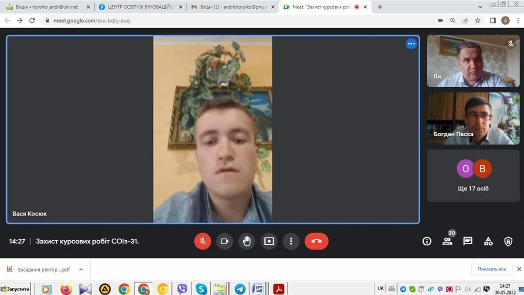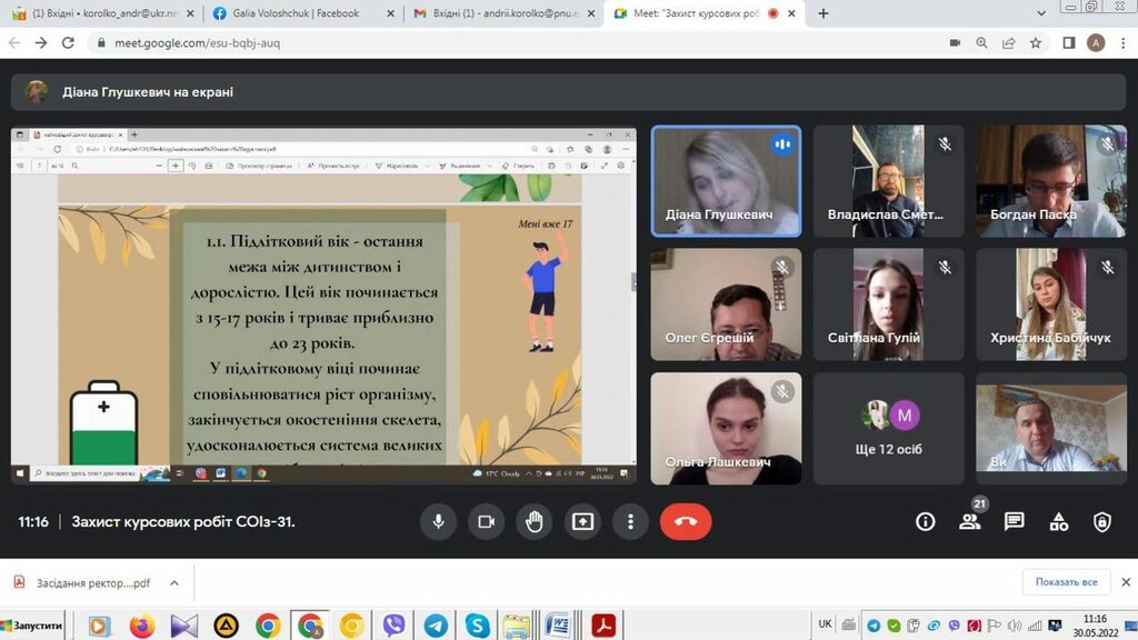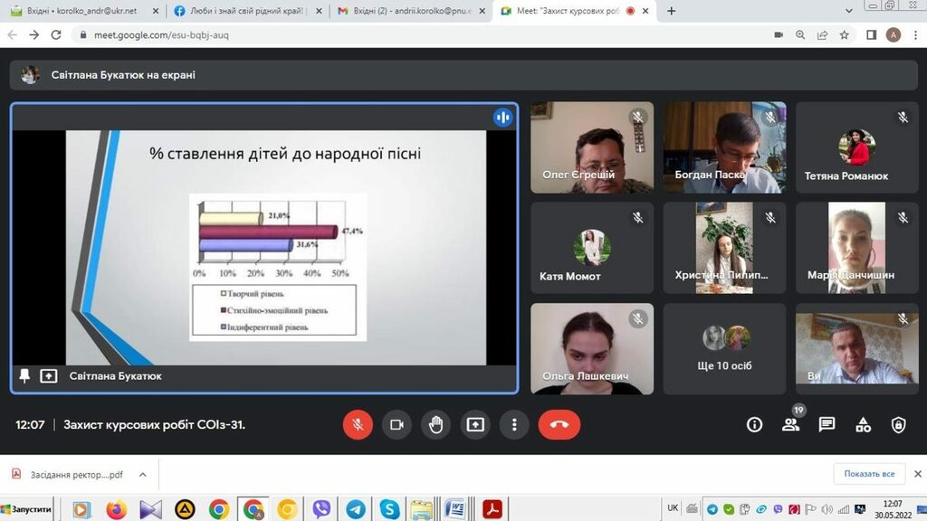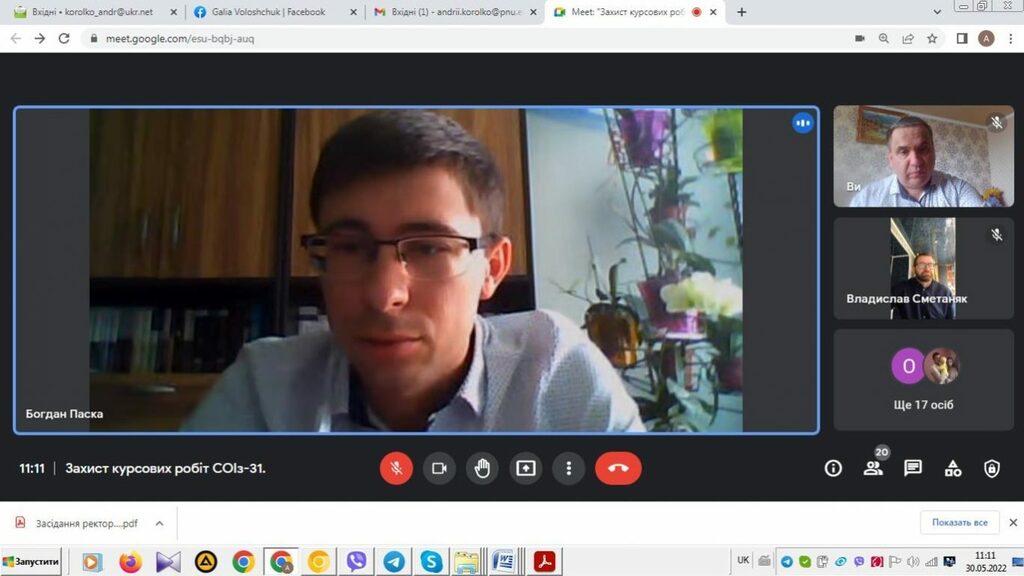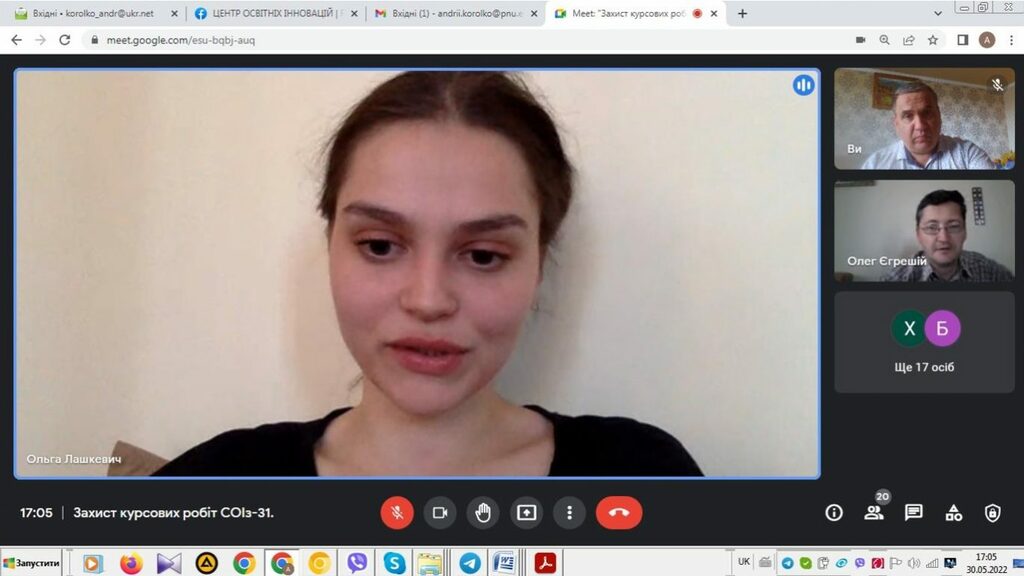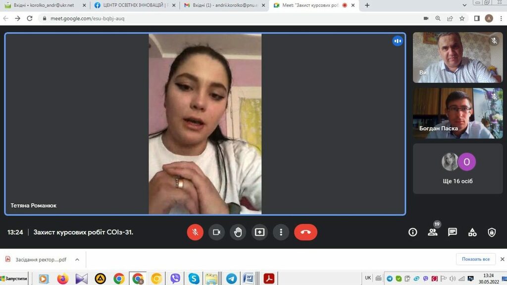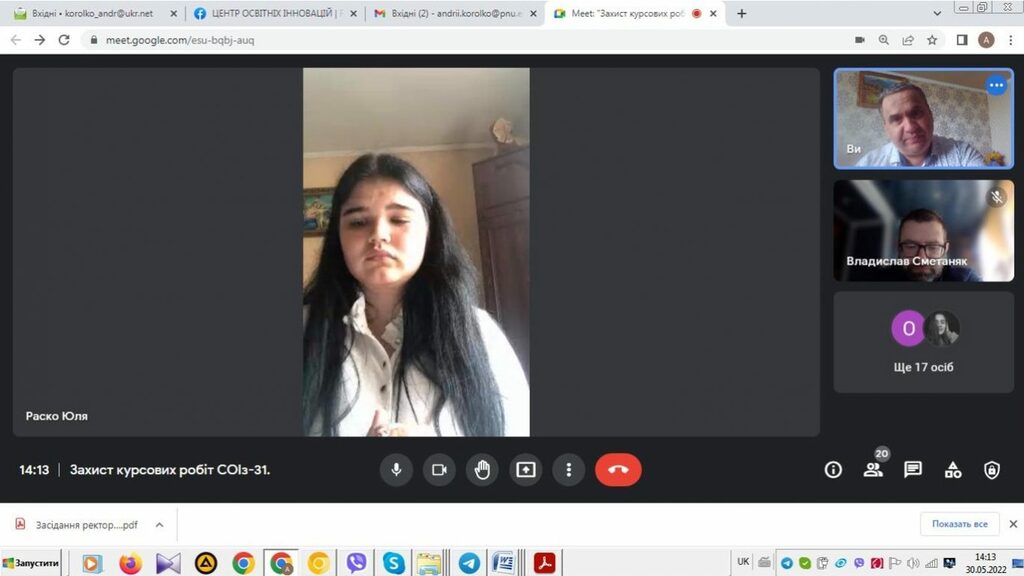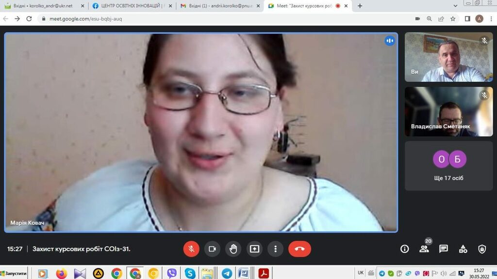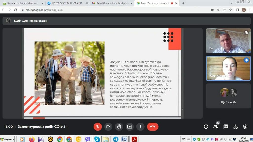 30 травня 2022 р. відбувся онлайн-захист курсових робіт студентів ІІІ курсу спеціальності 014 Середня освіта (Історія) ОР «Бакалавр» (заочна форма навчання) з методики викладання історії і психолого-педагогічних дисциплін. До складу комісії, яка оцінювала захист курсових робіт студентів, ввійшли викладачі кафедри історії України і методики викладання історії Факультету історії, політології і міжнародних відносин О.І. Єгрешій, А.З. Королько і Б.В. Паска та кафедри соціальної психології Факультету психології В.І. Сметаняк.
