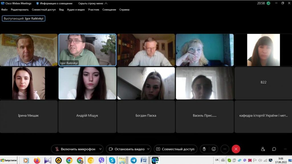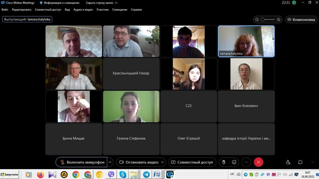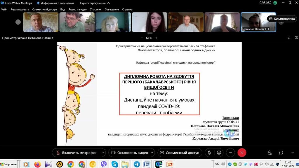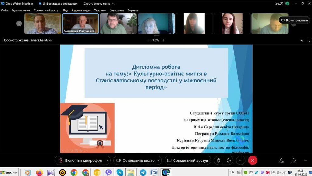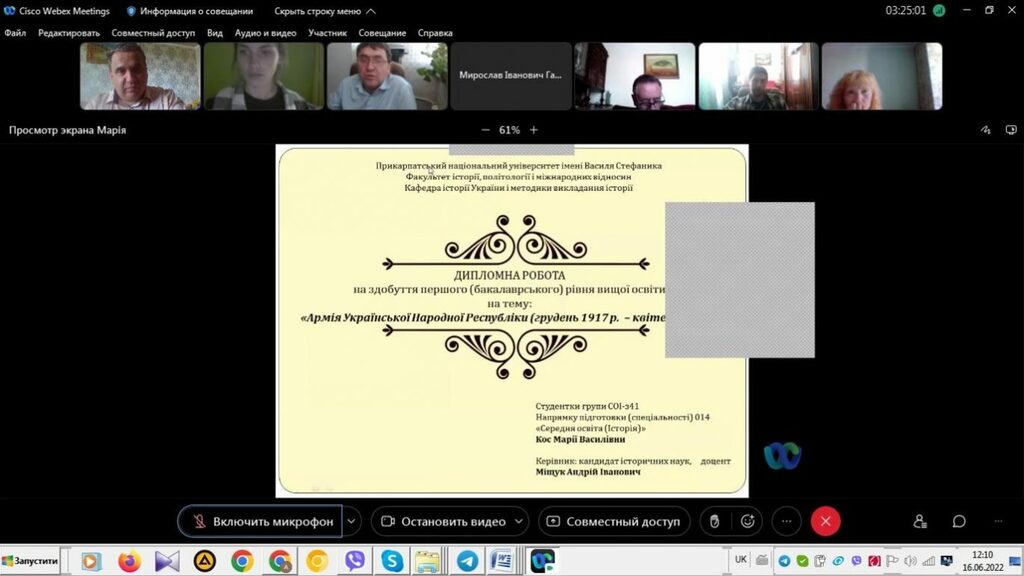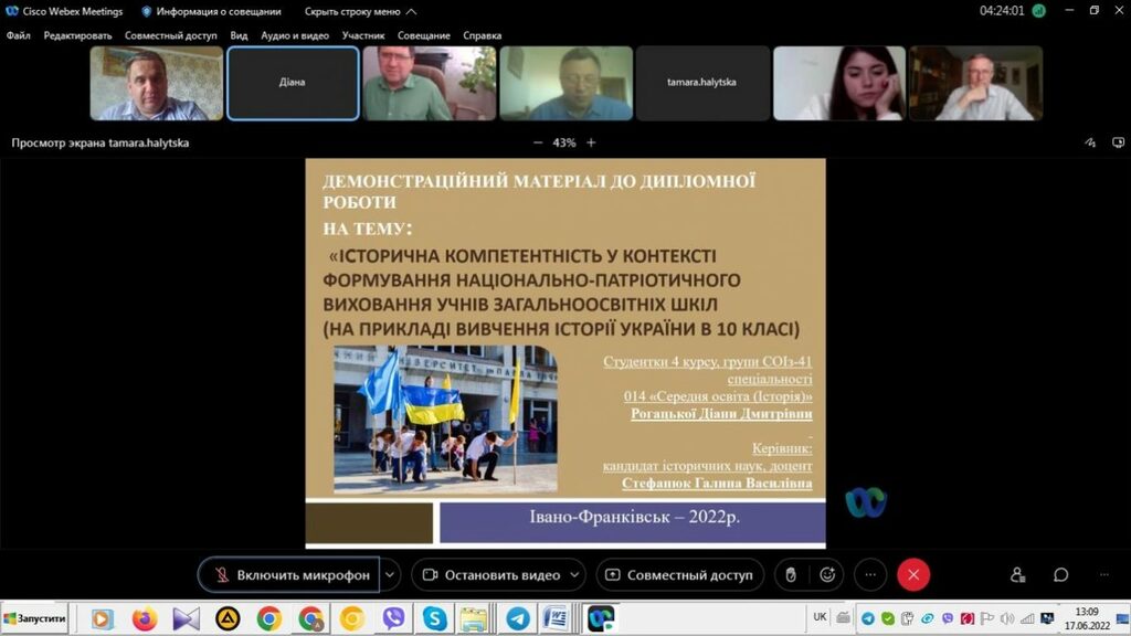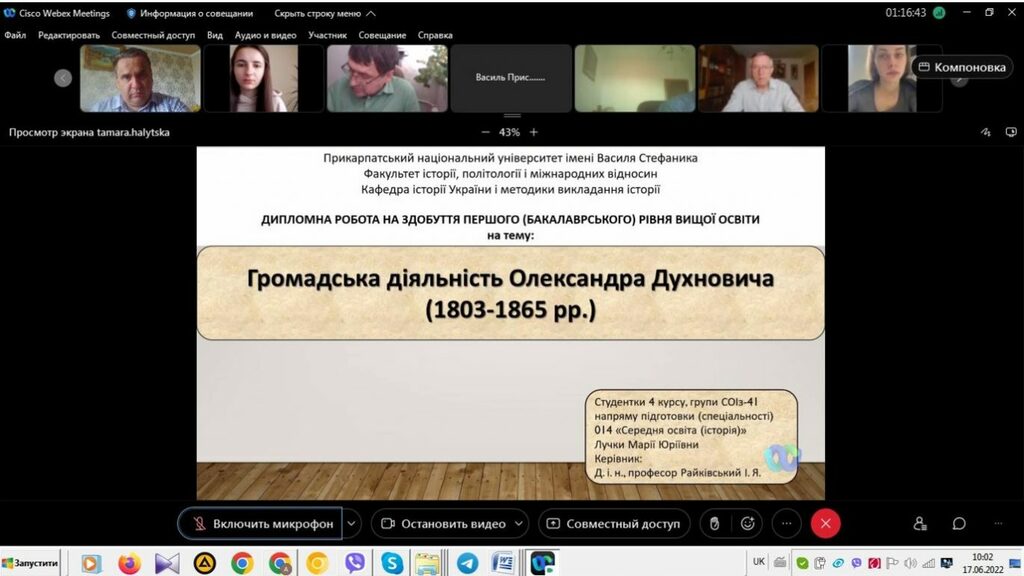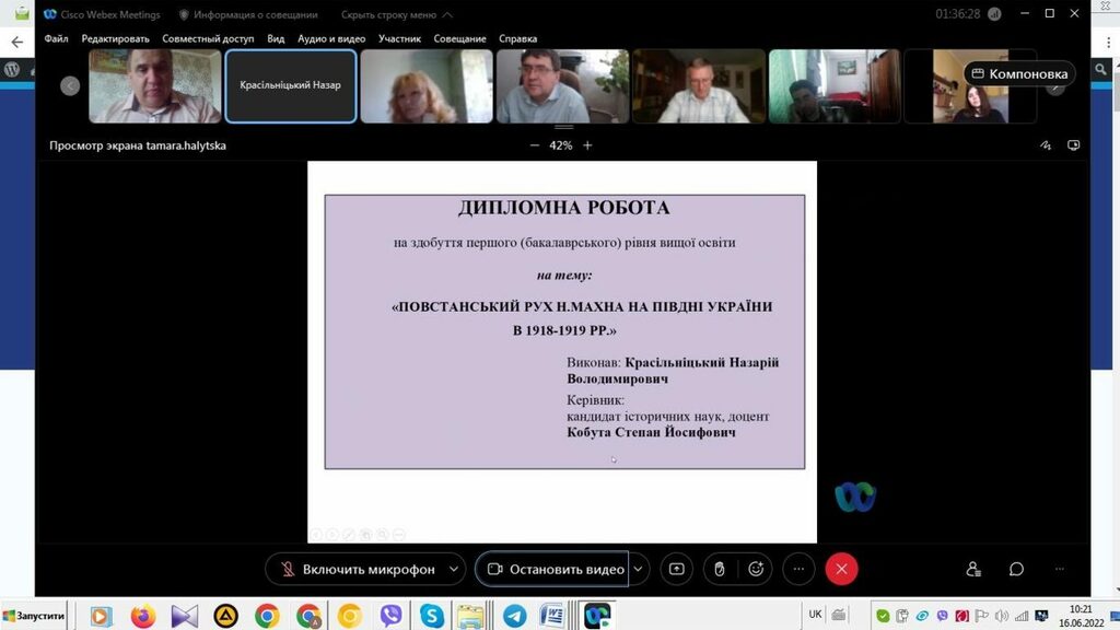 16–17 червня 2022 р. відбувся успішний захист дипломних робіт на здобуття першого (бакалаврського) рівня вищої світи студентами ІV курсу спеціальності 014 Середня освіта (Історія) ОР «Бакалвр» (заочна форма навчання) за допомогою сервісу платформи Cisco Webex Meeting. Екзаменаційна комісія діяла у такому складі: голова – проф. Райківський І.Я., члени комісії – доц. Галицька-Дідух і доц. Марущенко О.В. Усього захищали роботи 15 студентів заочної форми навчання освітнього рівня «Бакалавр». У роботі ЕК взяли також участь наукові керівники та рецензенти – професорсько-викладацький склад кафедри історії України і методики викладання історії та кафедри історії Центральної та Східної Європи і спеціальних галузей історичної науки. Виступи студентів-випускників були цікавими, змістовними, охоплювали різні аспекти (політичні, культурні, економічні, соціальні та ін.) історії України та методики навчання історії в школі. Комісія звернула увагу на високий рівень підготовки, оволодіння фаховими компетентностями випускників спеціальності 014 «Середня освіта (Історія)» ОР «Бакалавр» (заочна форма навчання).