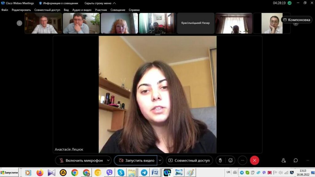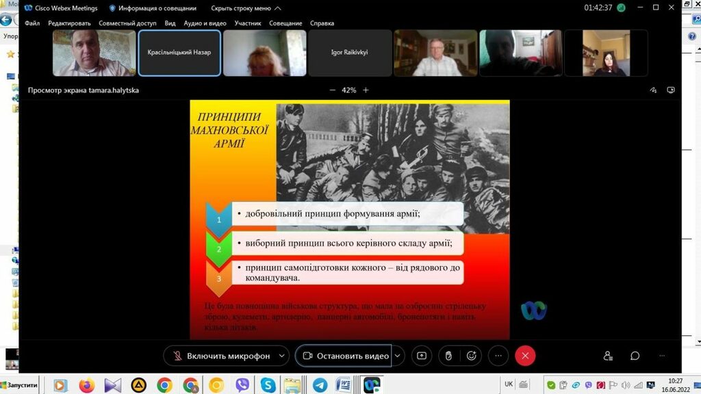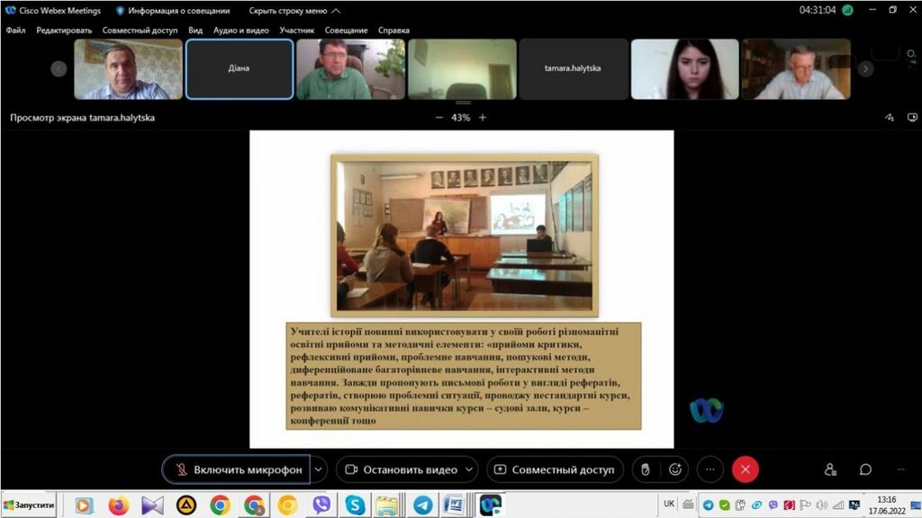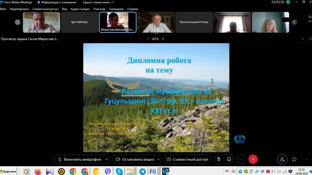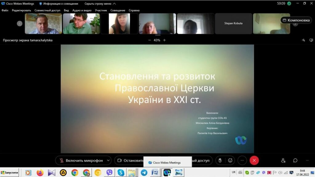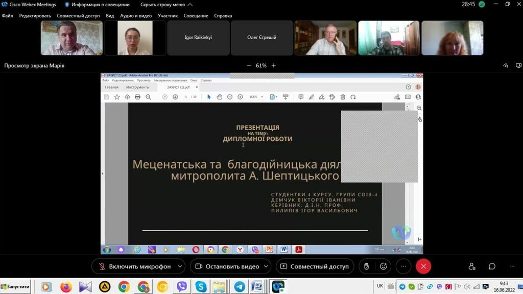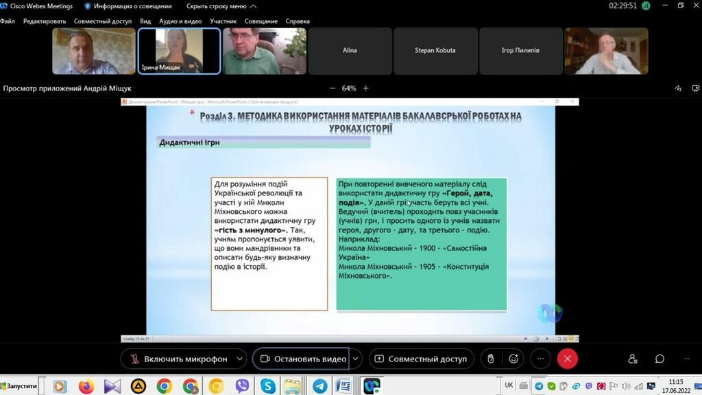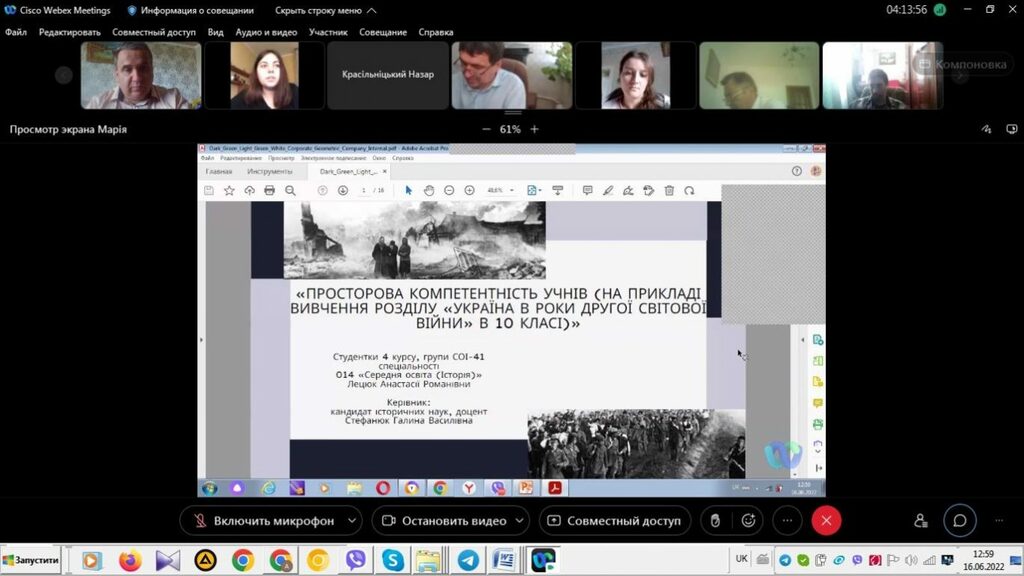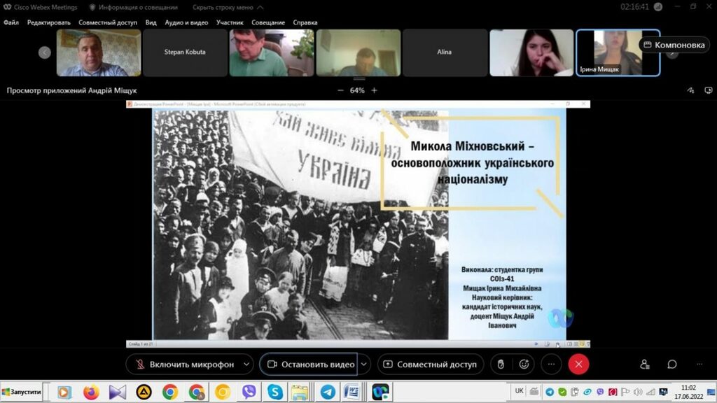 16–17 червня 2022 р. відбувся успішний захист дипломних робіт на здобуття першого (бакалаврського) рівня вищої світи студентами ІV курсу спеціальності 014 Середня освіта (Історія) ОР «Бакалвр» (заочна форма навчання) за допомогою сервісу платформи Cisco Webex Meeting. Екзаменаційна комісія діяла у такому складі: голова – проф. Райківський І.Я., члени комісії – доц. Галицька-Дідух і доц. Марущенко О.В. Усього захищали роботи 15 студентів заочної форми навчання освітнього рівня «Бакалавр». У роботі ЕК взяли також участь наукові керівники та рецензенти – професорсько-викладацький склад кафедри історії України і методики викладання історії та кафедри історії Центральної та Східної Європи і спеціальних галузей історичної науки. Виступи студентів-випускників були цікавими, змістовними, охоплювали різні аспекти (політичні, культурні, економічні, соціальні та ін.) історії України та методики навчання історії в школі. Комісія звернула увагу на високий рівень підготовки, оволодіння фаховими компетентностями випускників спеціальності 014 «Середня освіта (Історія)» ОР «Бакалавр» (заочна форма навчання).
