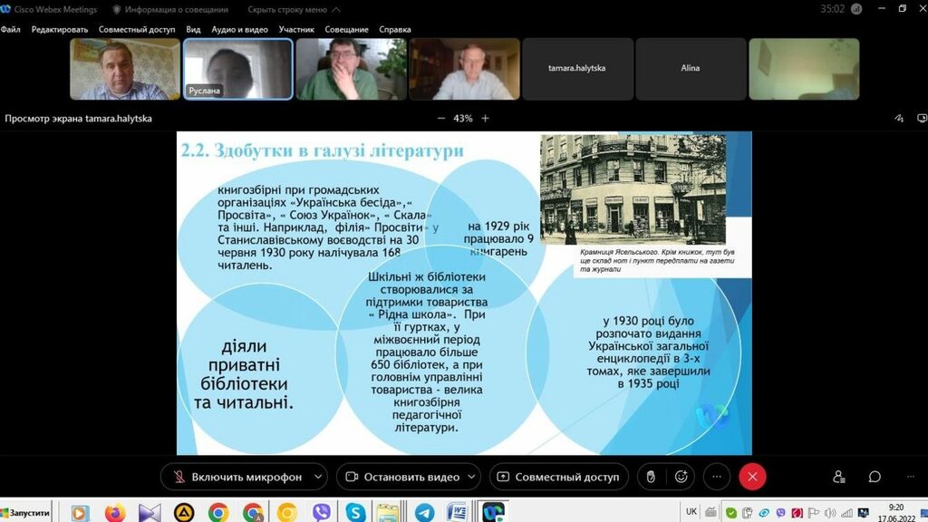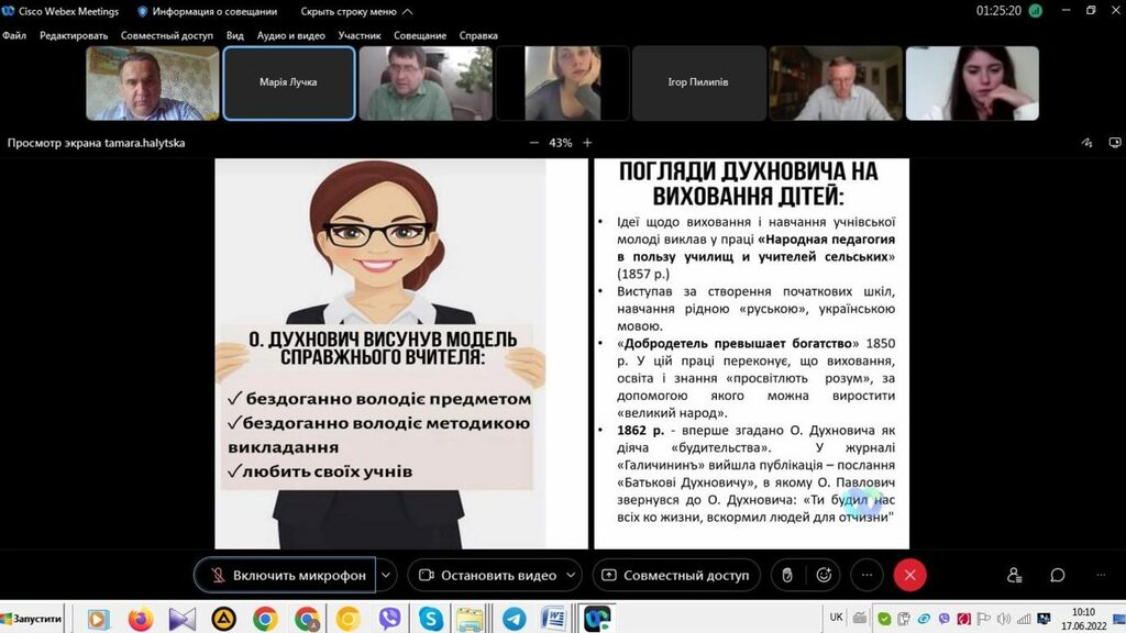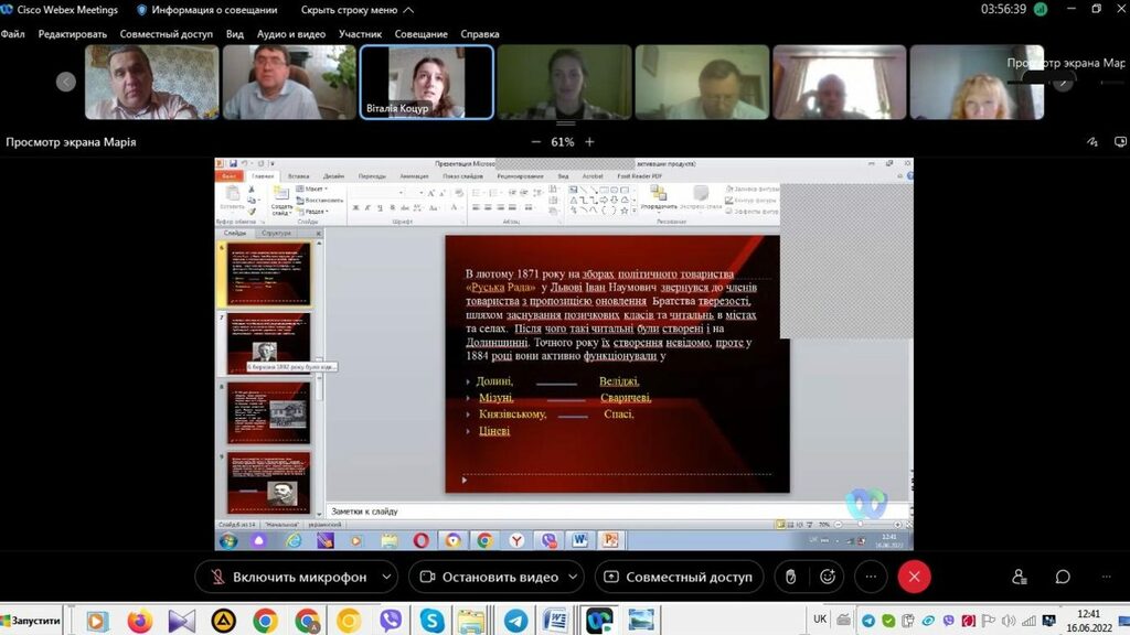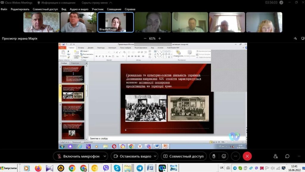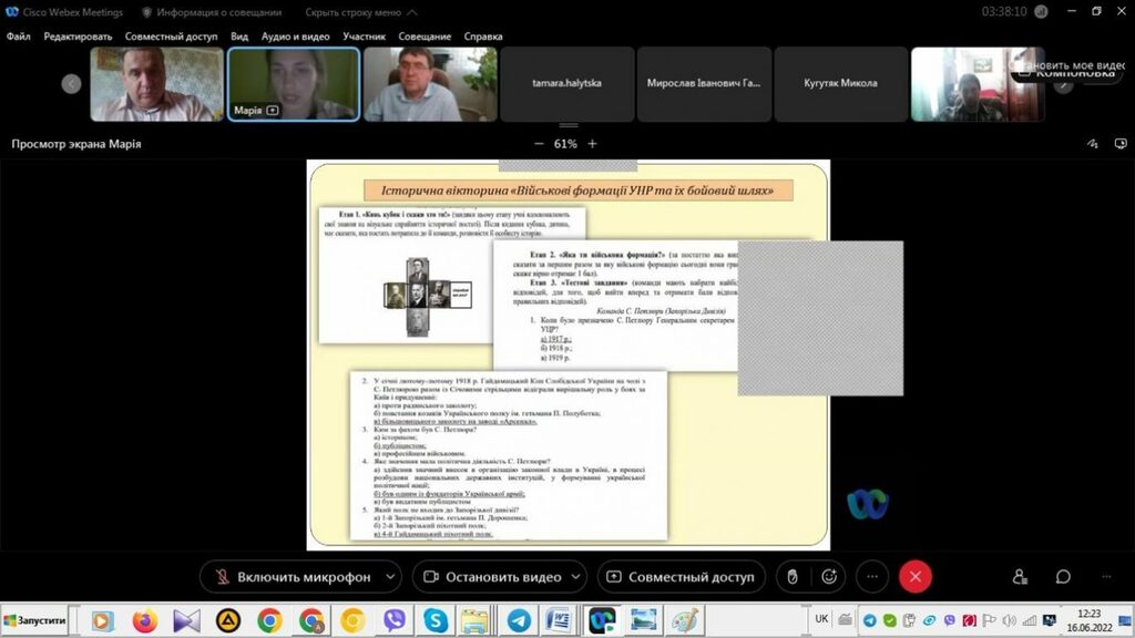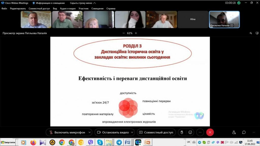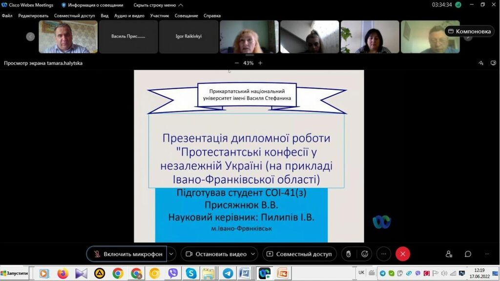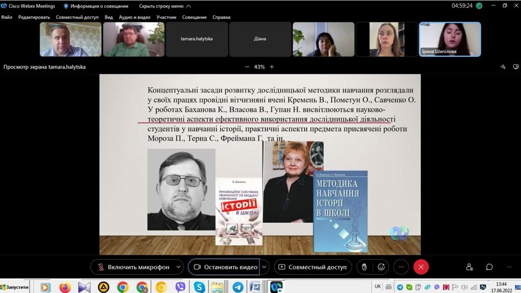 16–17 червня 2022 р. відбувся успішний захист дипломних робіт на здобуття першого (бакалаврського) рівня вищої світи студентами ІV курсу спеціальності 014 Середня освіта (Історія) ОР «Бакалвр» (заочна форма навчання) за допомогою сервісу платформи Cisco Webex Meeting. Екзаменаційна комісія діяла у такому складі: голова – проф. Райківський І.Я., члени комісії – доц. Галицька-Дідух і доц. Марущенко О.В. Усього захищали роботи 15 студентів заочної форми навчання освітнього рівня «Бакалавр». У роботі ЕК взяли також участь наукові керівники та рецензенти – професорсько-викладацький склад кафедри історії України і методики викладання історії та кафедри історії Центральної та Східної Європи і спеціальних галузей історичної науки. Виступи студентів-випускників були цікавими, змістовними, охоплювали різні аспекти (політичні, культурні, економічні, соціальні та ін.) історії України та методики навчання історії в школі. Комісія звернула увагу на високий рівень підготовки, оволодіння фаховими компетентностями випускників спеціальності 014 «Середня освіта (Історія)» ОР «Бакалавр» (заочна форма навчання).