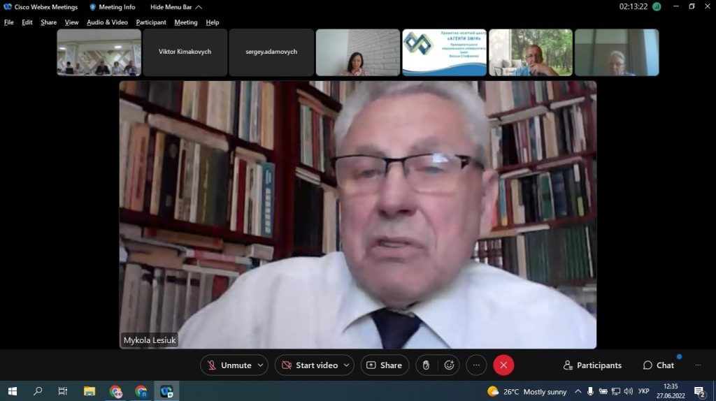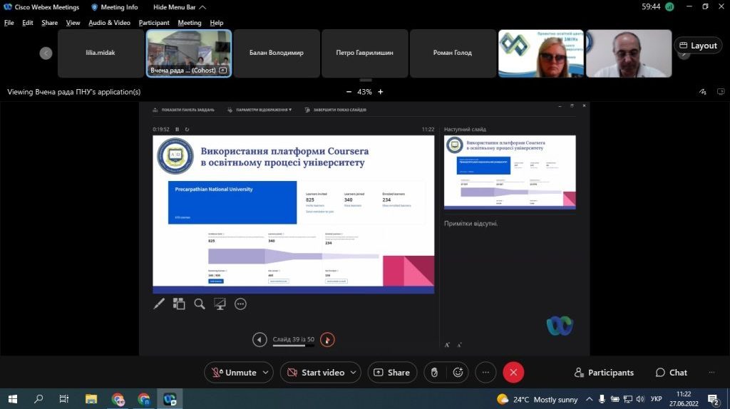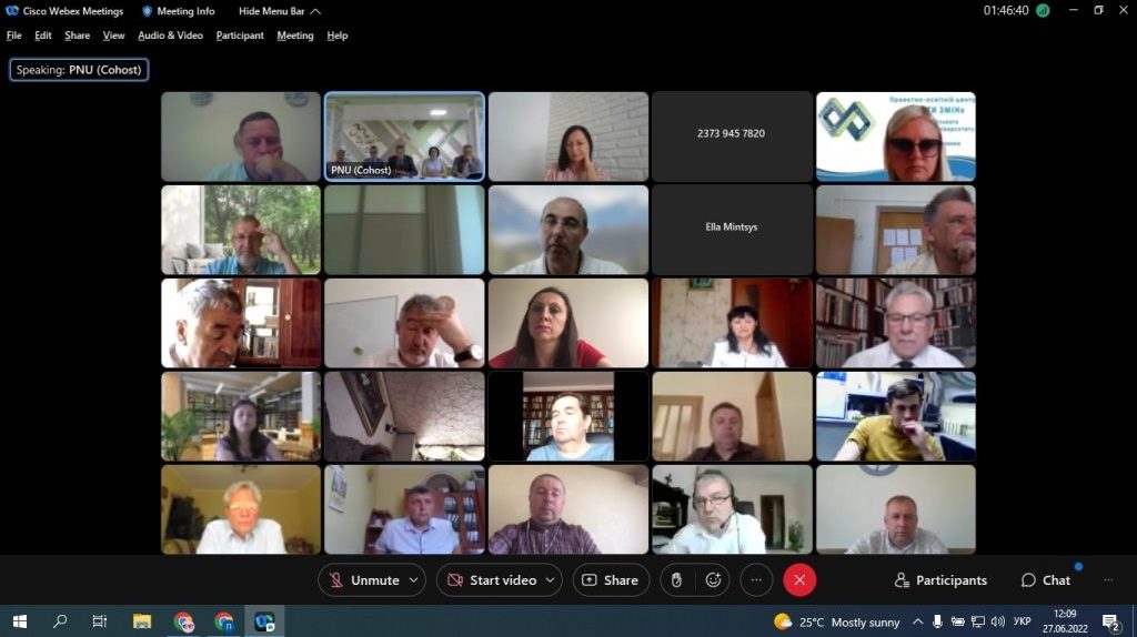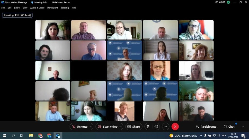 27 червня 2022 р. в Університеті відбулося розширене онлайн-засідання Вченої ради. У цьому навчальному році, зазначимо, це остання робоча зустріч представників колегіального органу. Онлайн-засідання розпочалося з хвилини мовчання у пам’ять про всіх загиблих захисників у війні проти Росії.