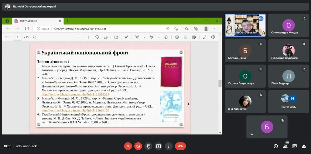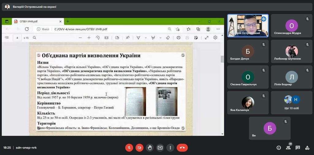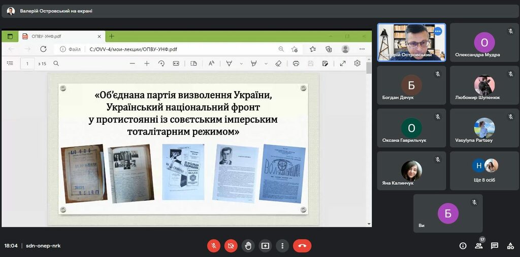 Слухачі ознайомилися із цікавими й унікальними матеріалами, присвяченими історії українського дисидентського руху. У лекції було висвітлено діяльність підпільних націоналістичних організацій на території Прикарпаття в 1950–1960-х рр., подано відомості про їх лідерів – Богдана Ґерманюка, Дмитра Квецка, Зіновія Красівського, а також про особливості та методи боротьби із радянськими окупантами у складних умовах засилля на українських землях тоталітарного імперського режиму. Лекція Валерія Островського викликала значне зацікавлення в студентів-істориків, які задавали науковцю актуальні питання з тематики історії українського дисидентства другої половини ХХ ст. та особливостей викладання цієї теми в середній школі.