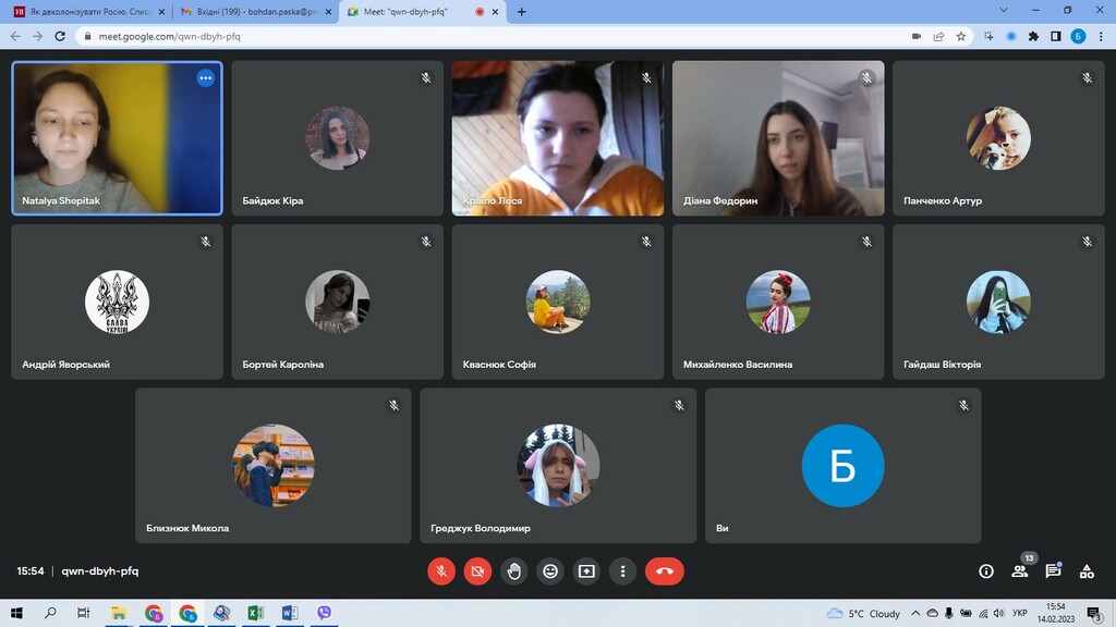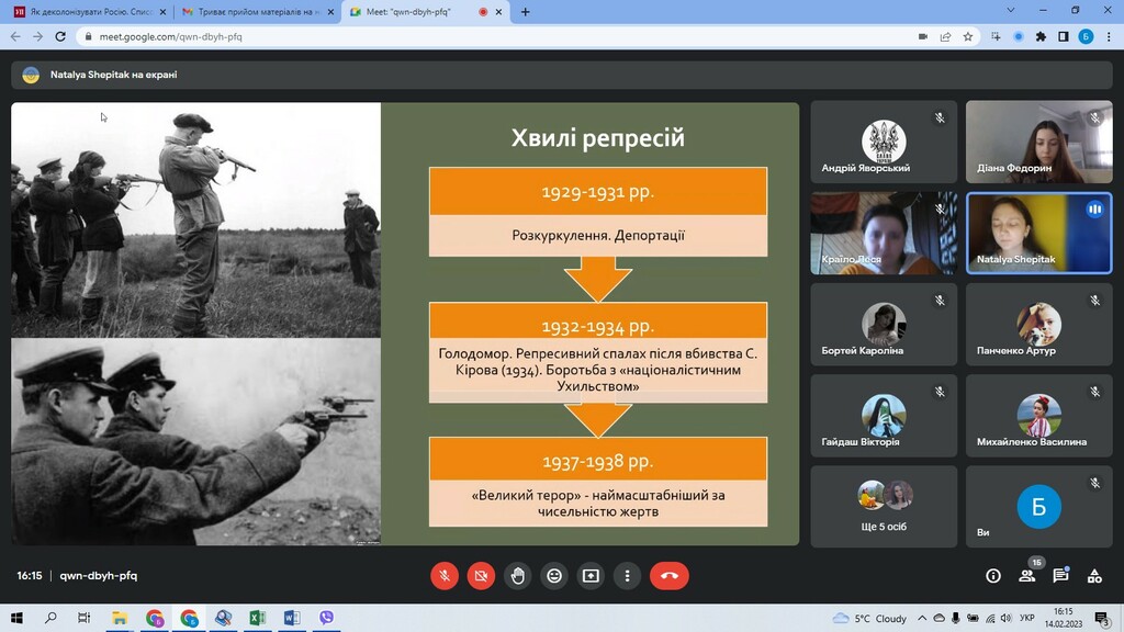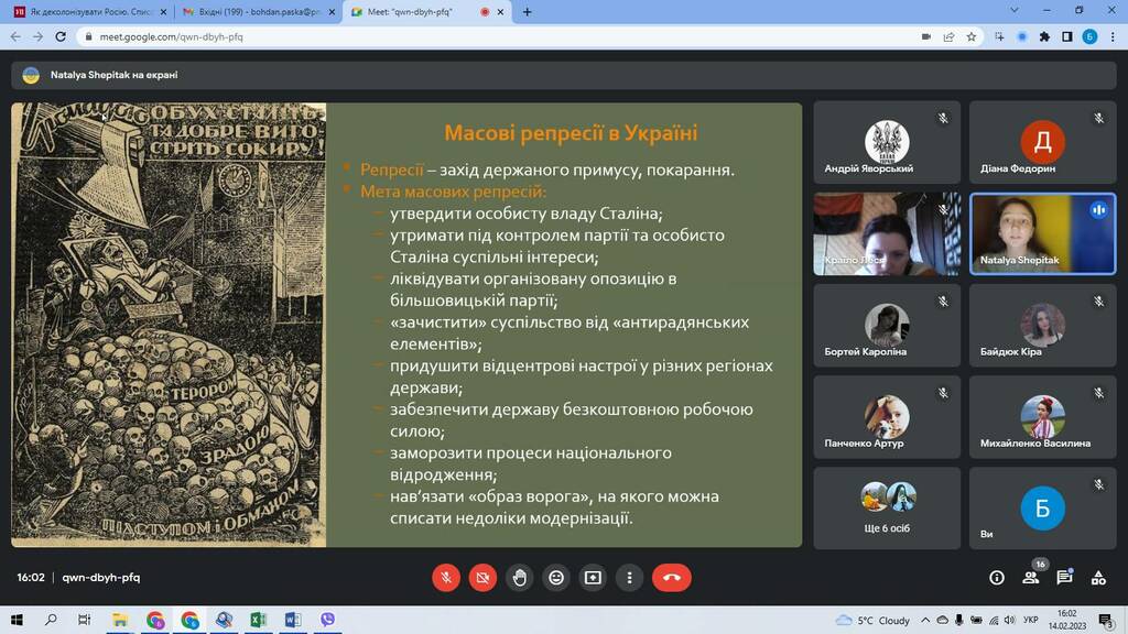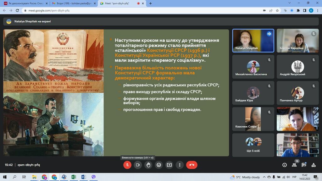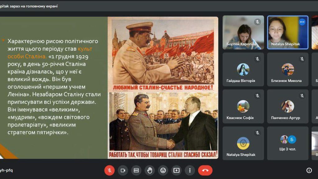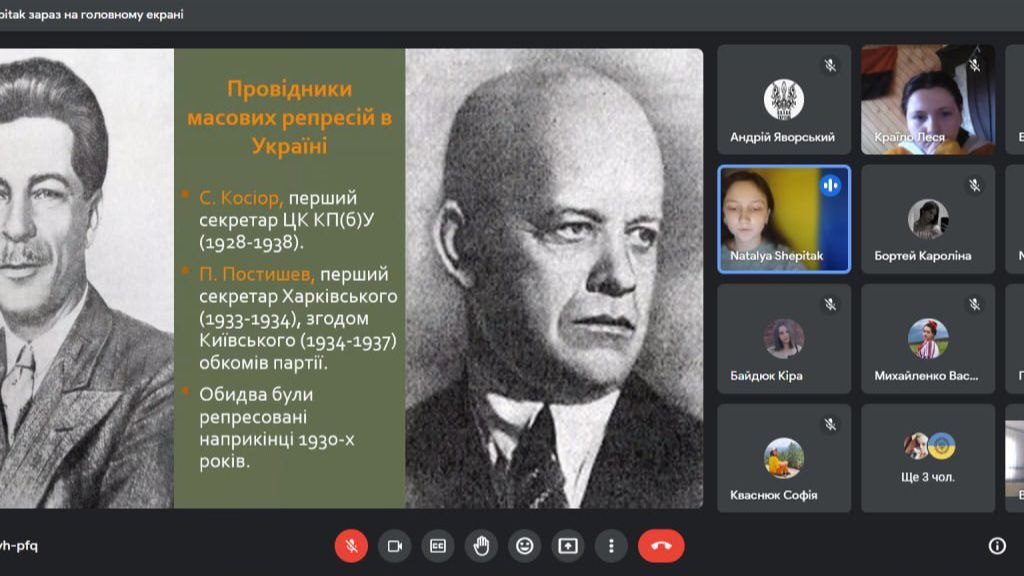 14 лютого 2023 р. в рамках проходження виробничої історико-краєзнавчої практики в ЗПО студентка групи СОІ–21 спеціальності 014 Середня освіта (Історія) ОР «Бакалавр» Наталія Шепітак провела онлайн-заняття для вихованців гуртка «Історія України» (керівник – Яворський Андрій Анатолійович) на базі Івано-Франківського обласного відділення Малої академії наук України, які є ліцеїстами Івано-Франківського фізико-технічного ліцею-інтернату Івано-Франківської обласної ради. Тема заняття – «Україна в період радянської модернізації. Формування сталінської тоталітарної системи». На занятті окрім вихованців гуртка були присутні керівник гуртка, к.і.н. Яворський А.А., керівник-методист: старший викладач кафедри історії України і методики викладання історії, к.і.н. Паска Б. В. та студентка-практикантка Діана Федорин.