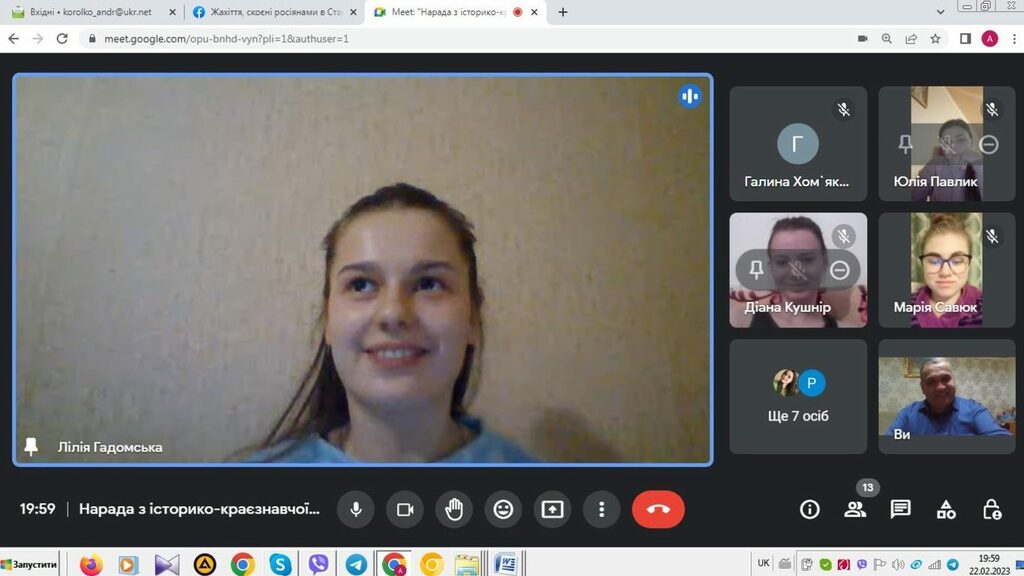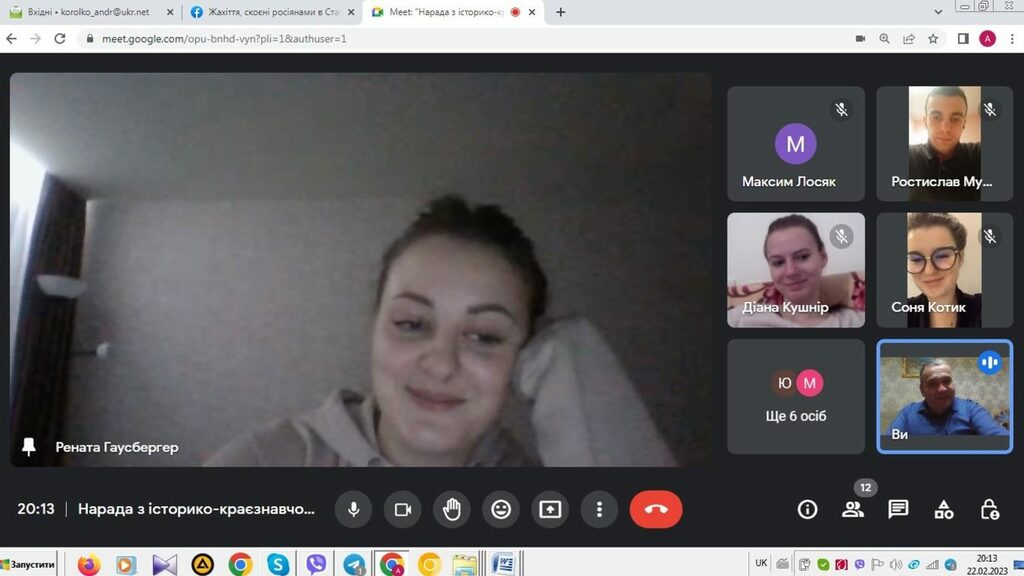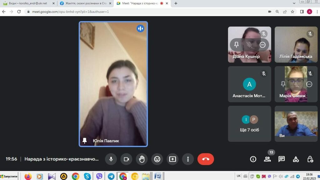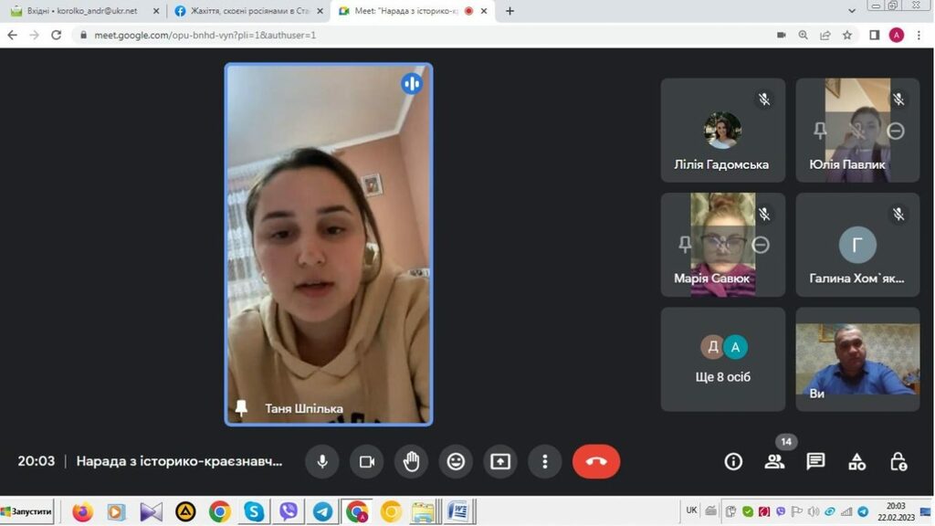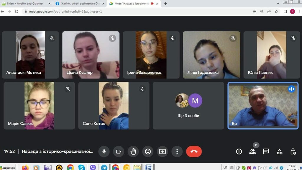 22 лютого 2023 р. за допомогою сервісу платформи Google Meet відбулася підсумкова нарада з питань виробничої історико-краєзнавчої практики в закладах позашкільної освіти для студентів ІІ курсу спеціальності 014 Середня освіта (Історія) ОР «Бакалавр» (заочна форма навчання).