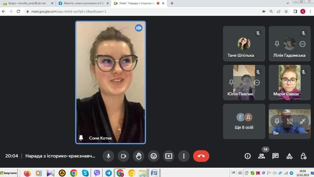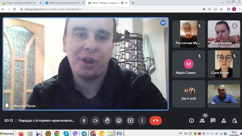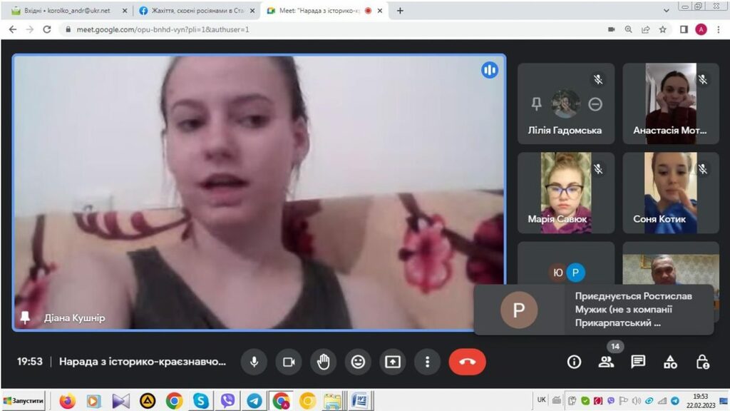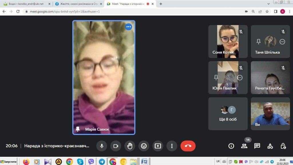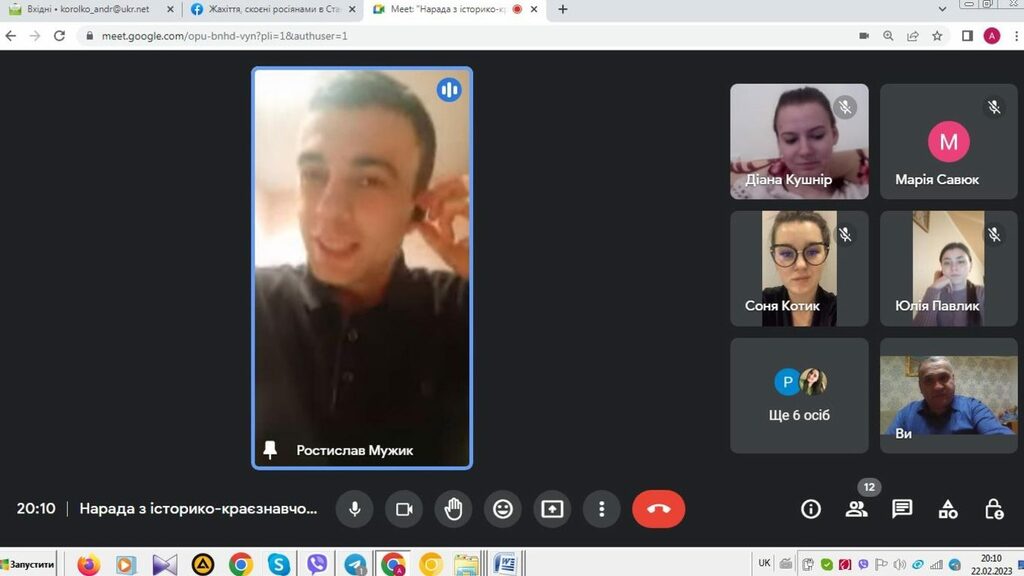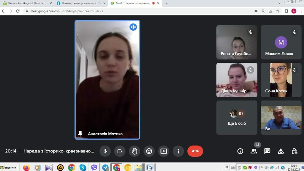 22 лютого 2023 р. за допомогою сервісу платформи Google Meet відбулася підсумкова нарада з питань виробничої історико-краєзнавчої практики в закладах позашкільної освіти для студентів ІІ курсу спеціальності 014 Середня освіта (Історія) ОР «Бакалавр» (заочна форма навчання).