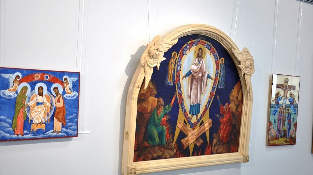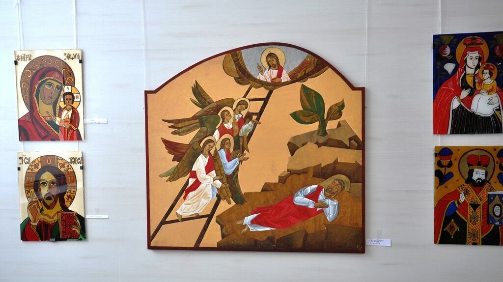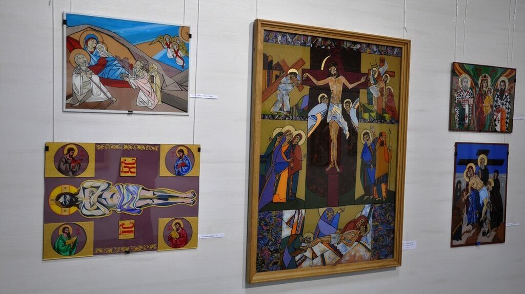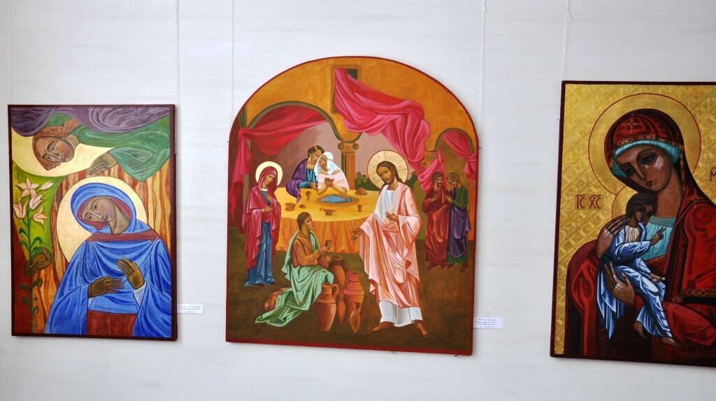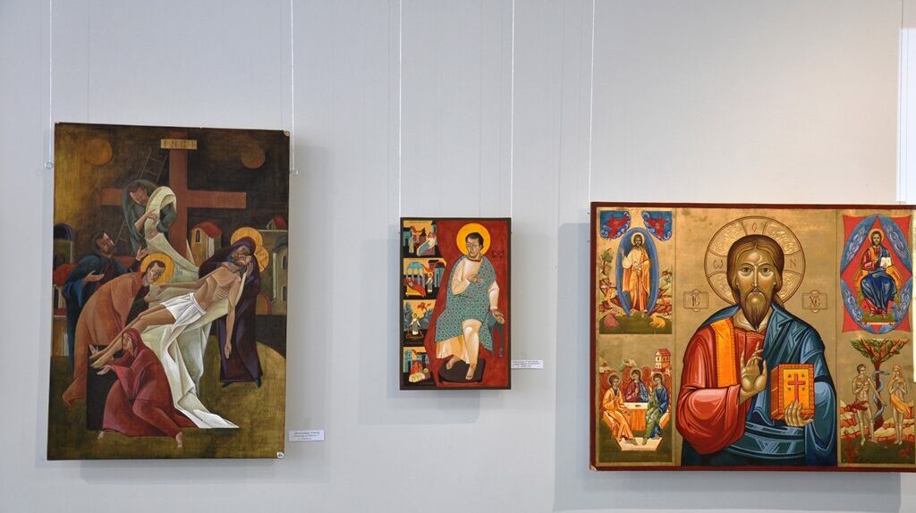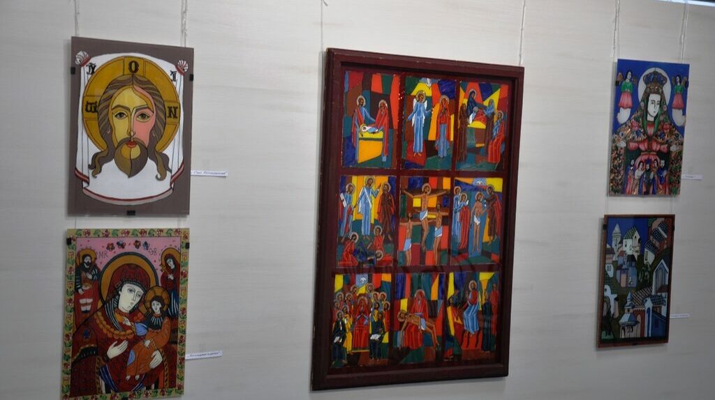 Значну частину експозиції виставки складають ікони написані на дошці покритій левкасом та в техніці живопису на склі.
