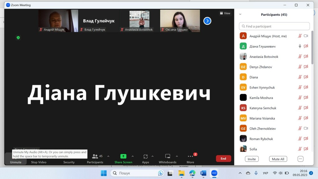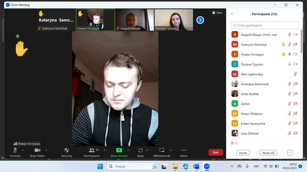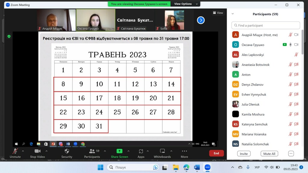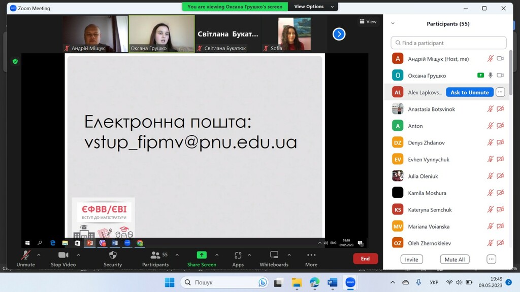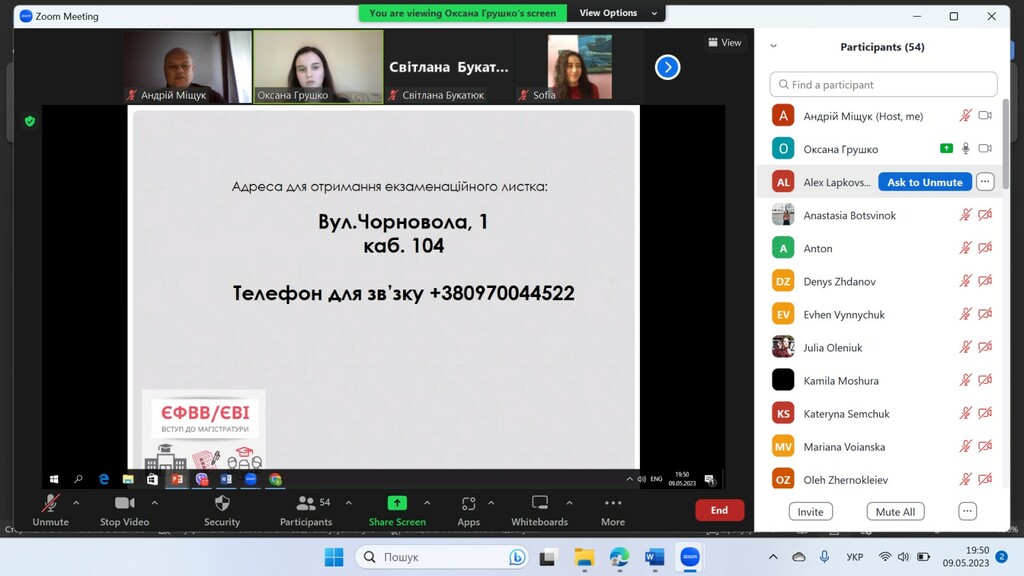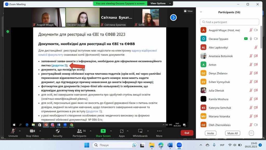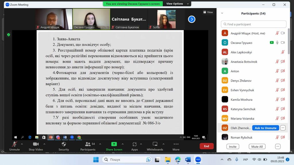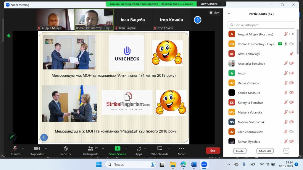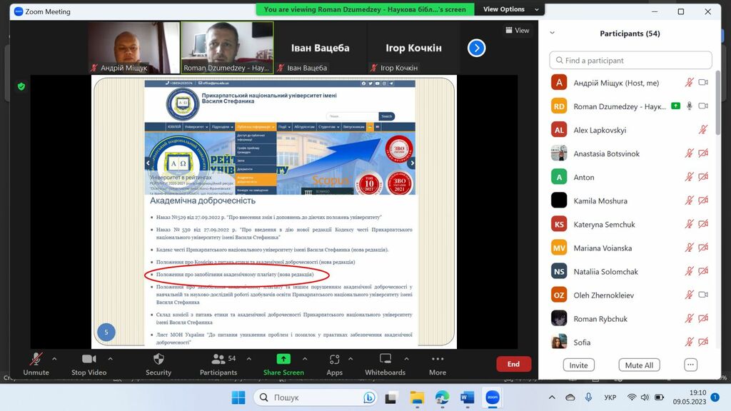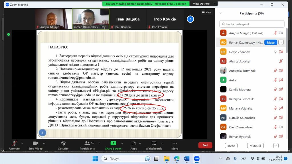 9 травня 2023 р. на Факультеті історії, політології і міжнародних відносин відбулася онлайн-консультація з приводу актуальних питань перевірки дипломних (бакалаврських) робіт на визначення рівня унікальності та вступної кампанії у магістратуру 2023 року. На ній були присутні 57 студентів випускників ОР бакалавр всіх спеціальностей факультету.