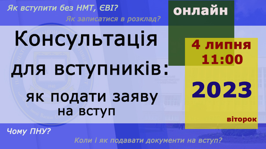 4 липня об 11:00 год. в онлайн форматі Прикарпатський національний університет імені Василя Стефаника проведе консультацію для вступників на усі освітні рівні з приводу правил Вступної кампанії до закладів вищої освіти.