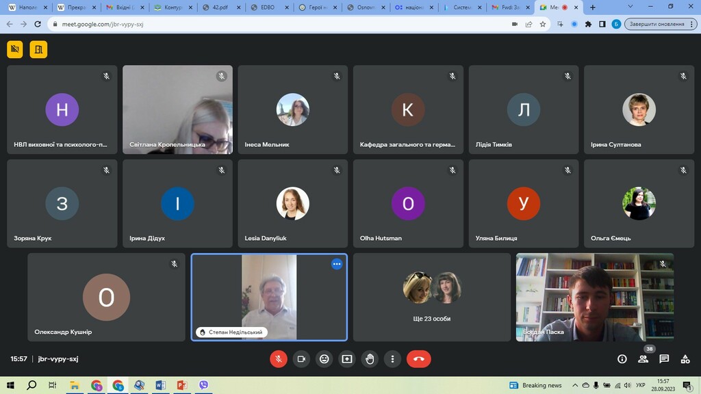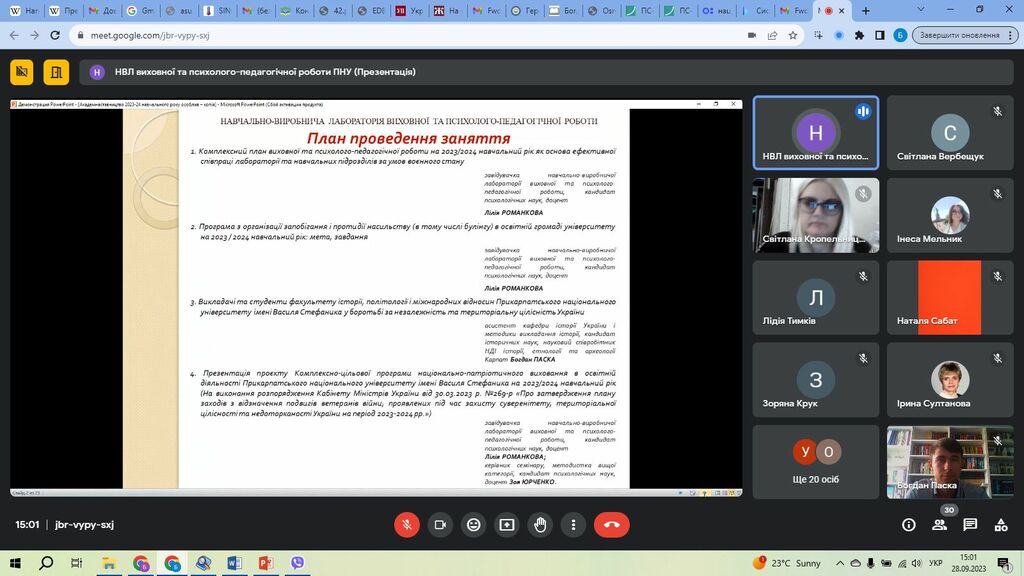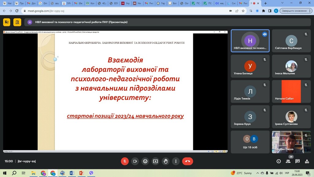 28 вересня 2023 р. відбулося розширене заняття навчально-методичного семінару з кураторами 1–3-х курсів, заступниками з виховної роботи усіх структурних підрозділів університету та аспірантами університету. Модераторами виступили завідуюча навчально-виробничої лабораторії виховної та психолого-педагогічної роботи, к. пс. наук, доц. Лілія Миколаївна Романкова та керівник семінару, методист вищої категорії, к. пс. наук, доц. Зоя Володимирівна Юрченко. Захід відбувся в онлайн-форматі на тему «Взаємодія лабораторії з навчальними підрозділами: стартові позиції 2023/2024 навчального року».