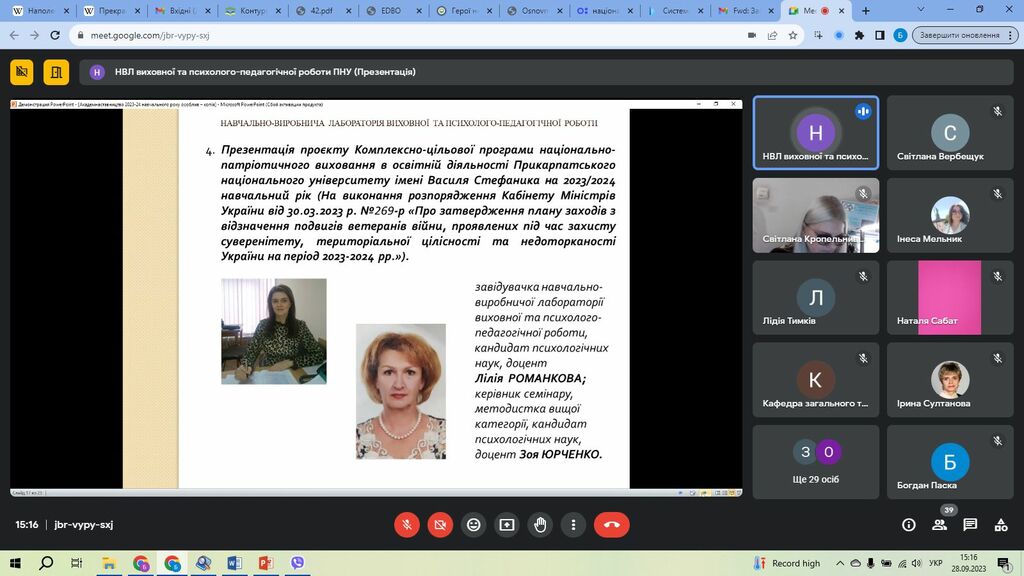 Під час семінару Лілія Романкова представила до розгляду доповідь на тему «Комплексний план виховної та психолого-педагогічної роботи на 2023/2024 навчальний рік як основа ефективної співпраці лабораторії та навчальних підрозділів за умов воєнного стану», а також програму з організації запобігання і протидії насильству (в тому числі булінгу) в освітній громаді університету на 2023/2024 н. р. У свою чергу, Зоя Юрченко презентувала проєкт Комплексно-цільової програми національно-патріотичного виховання в освітній діяльності Прикарпатського національного університету імені Василя Стефаника на 2023/2024 навчальний рік.