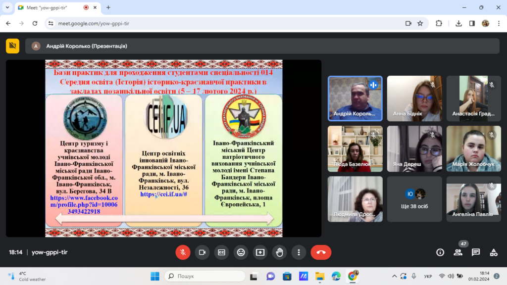 1 лютого 2024 р. відбулася настановча нарада з організації проведення виробничої історико-краєзнавчої практики в закладах позашкільної освіти для студентів ІІ курсу спеціальності 014 Середня освіта (Історія) ОР «Бакалавр» (денна і заочна форма навчання). Вона спрямована на конкретну професіоналізацію Читати далі