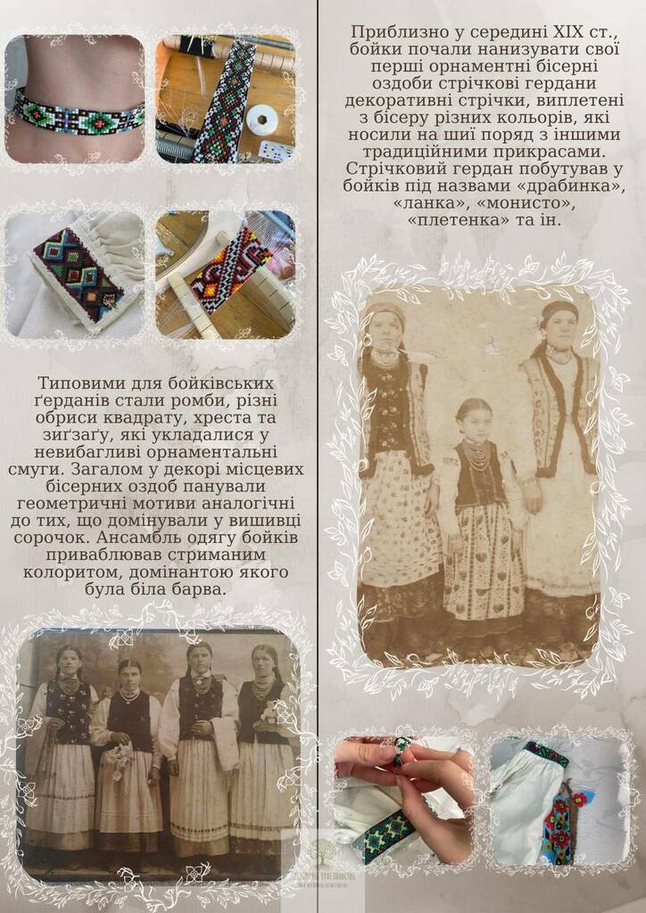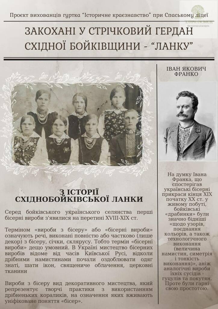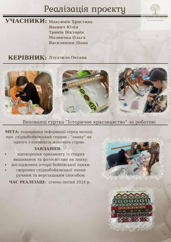 Юні майстрині: Юлія Яневич, Ольга Мазничка, Вікторія Тринів, Діана Василишин, Христина Максимів впродовж січня-лютого 2024 р. відтворювали орнамент із старих вишиванок та фотосвітлин на ланку, досліджували історію бойківських прикрас, створювали східнобойківські ланки ручним та верстатським способами. Це надзвичайно сумлінна та старанна праця дівчаток!