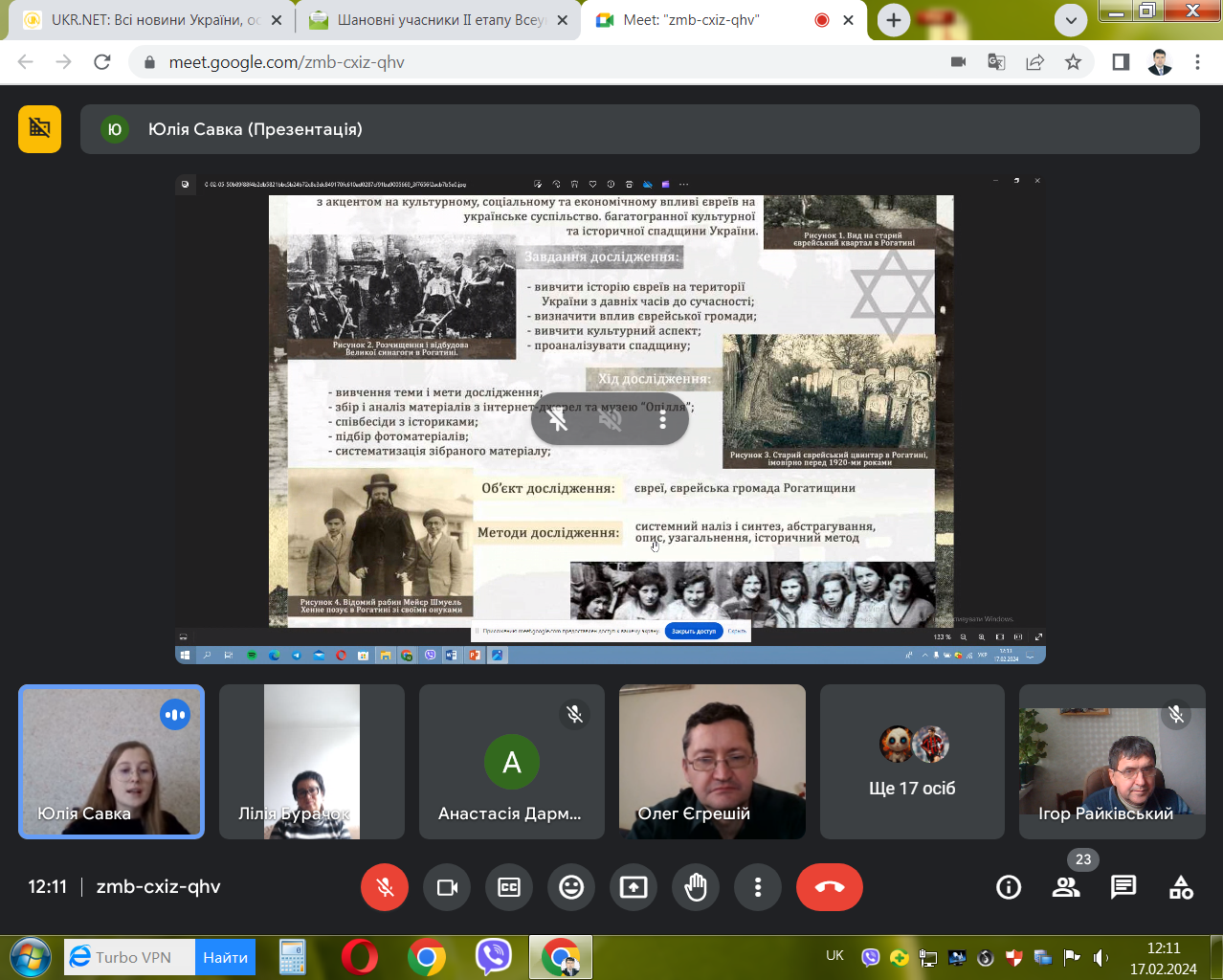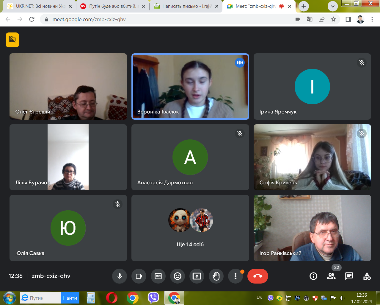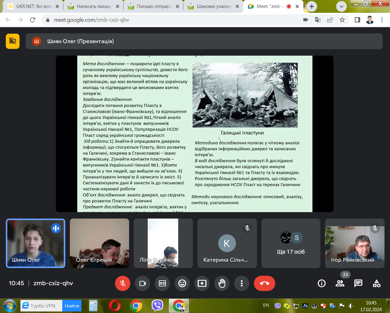 17 лютого 2024 р. відбувся в онлайн-форматі ІІ (обласний) етап Всеукраїнського конкурсу-захисту науково-дослідницьких робіт учнів-членів Малої академії наук України з секції «Історичне краєзнавство». Членами журі виступили, як і в минулі роки: доктор історичних наук, професор, завідувач кафедри історії України і методики викладання історії Прикарпатського національного університету імені Василя Стефаника Ігор Ярославович Райківський, кандидат історичних наук, доцент цієї ж кафедри Олег Ігорович Єгрешій та кандидат історичних наук, доцент кафедри всесвітньої історії Лілія Василівна Бурачок.