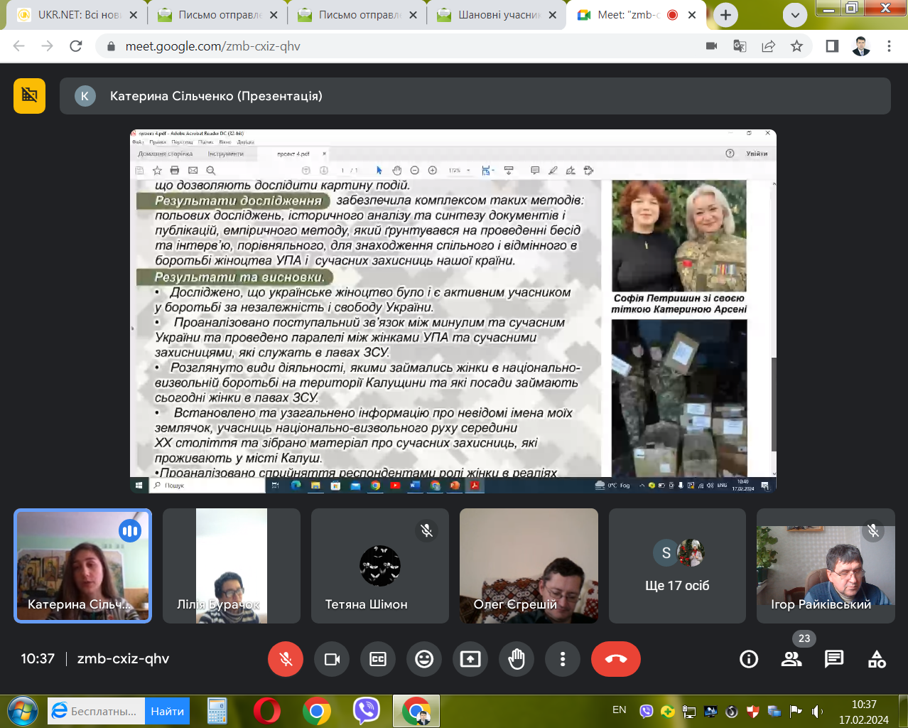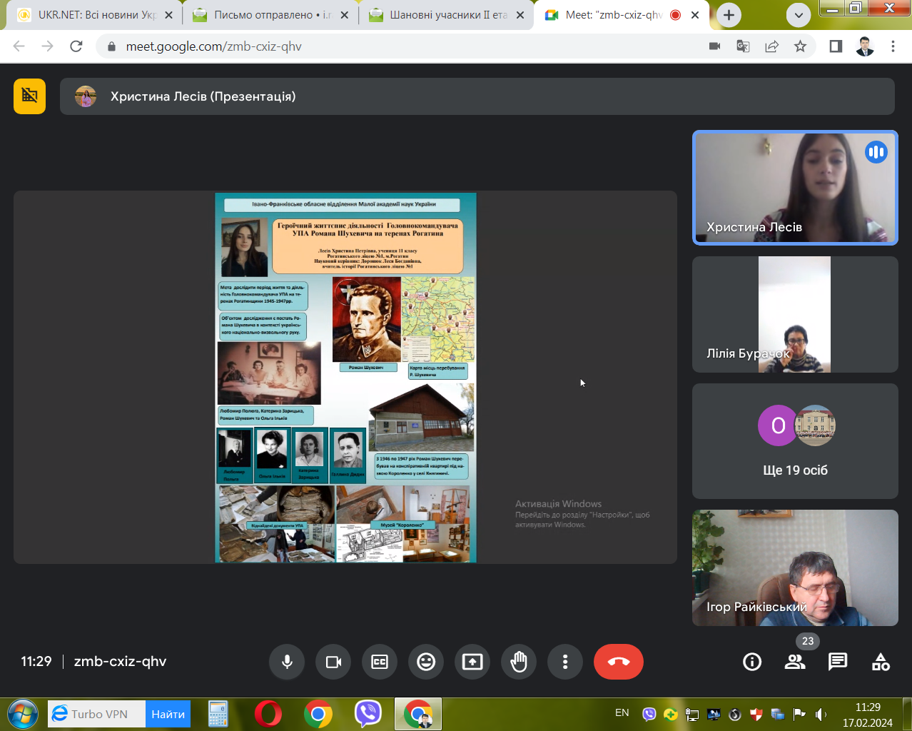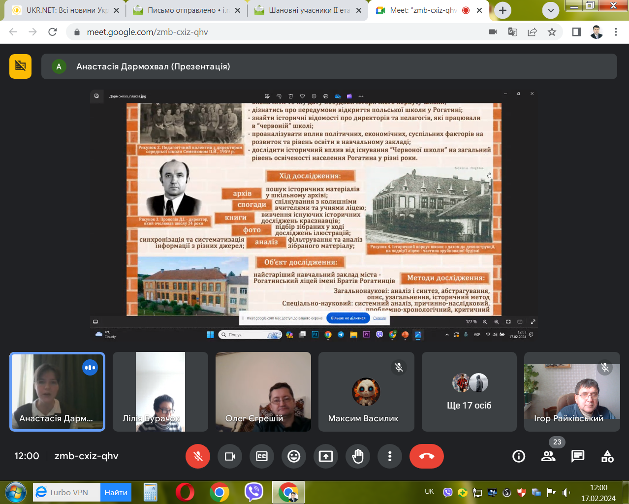 17 лютого 2024 р. відбувся в онлайн-форматі ІІ (обласний) етап Всеукраїнського конкурсу-захисту науково-дослідницьких робіт учнів-членів Малої академії наук України з секції «Історичне краєзнавство». Членами журі виступили, як і в минулі роки: доктор історичних наук, професор, завідувач кафедри історії України і методики викладання історії Прикарпатського національного університету імені Василя Стефаника Ігор Ярославович Райківський, кандидат історичних наук, доцент цієї ж кафедри Олег Ігорович Єгрешій та кандидат історичних наук, доцент кафедри всесвітньої історії Лілія Василівна Бурачок.