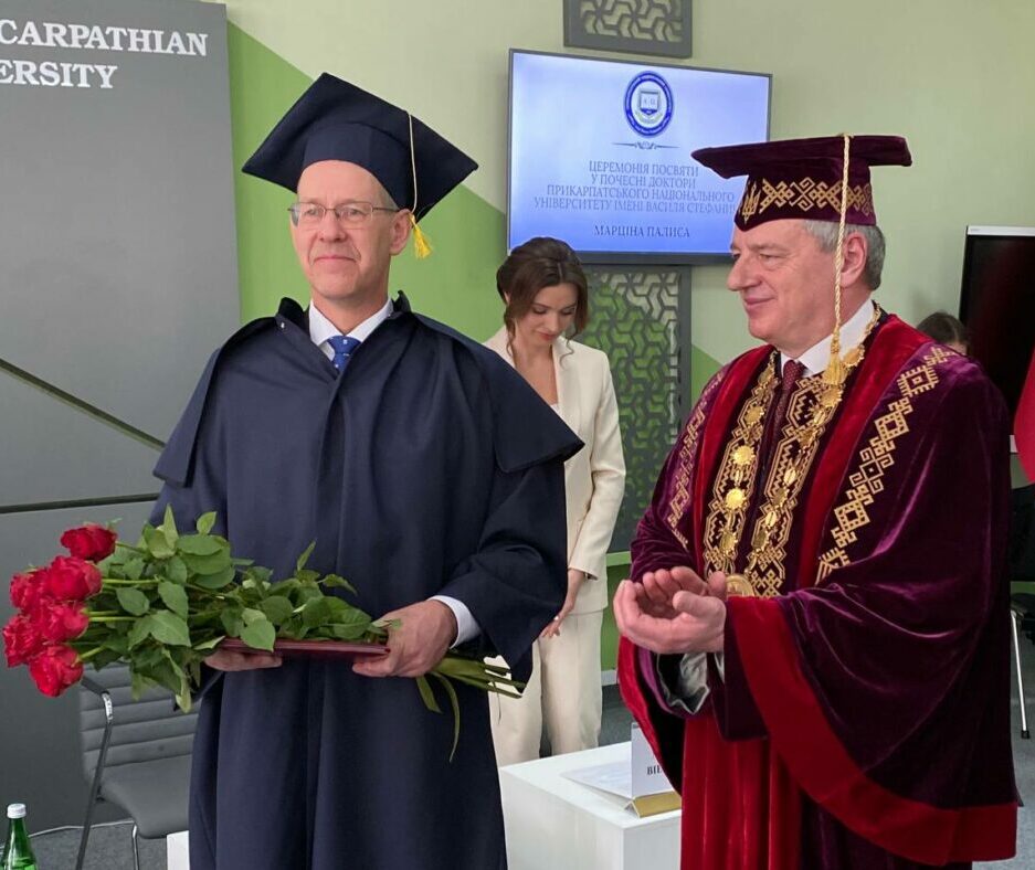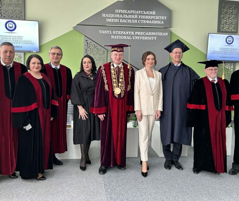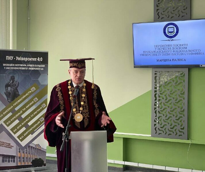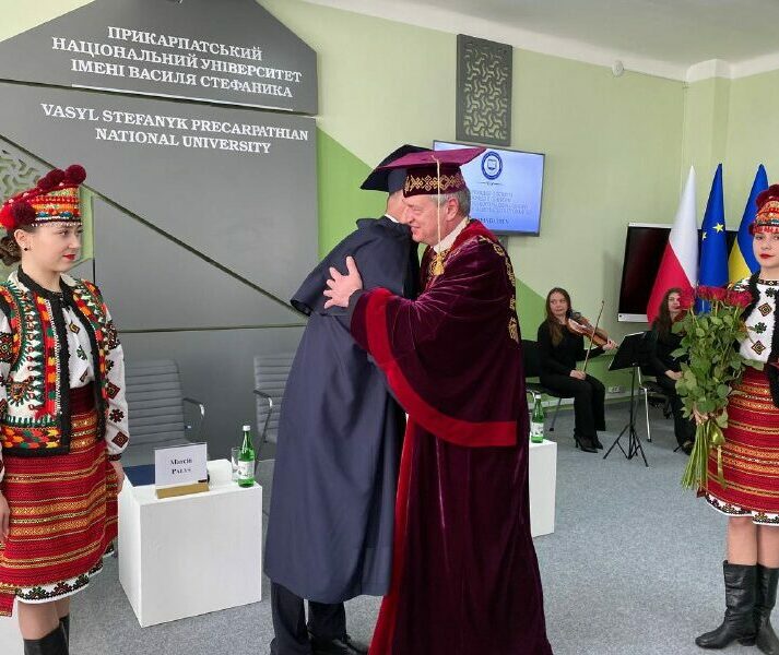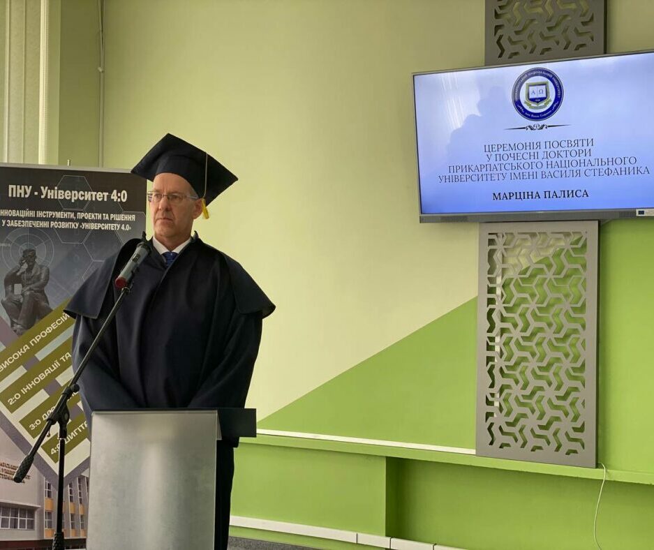 Сьогодні в Прикарпатському національному університеті імені Василя Стефаника відбулося вручення Почесного доктора ПНУ – ректору Варшавського університету (Республіка Польща) (2012–2020 рр.), члену правління Європейської асоціації університетів пану Марціну Палису. Високе звання було присвоєно Марціну Палису відповідно до ухвали Вченої ради Прикарпатського національного університету імені Василя Стефаника 26 ервня 2020 р., але через пандемію та повномасштабну війну в Україні церемонія вручення диплому та мантії була відкладена майже на чотири роки…