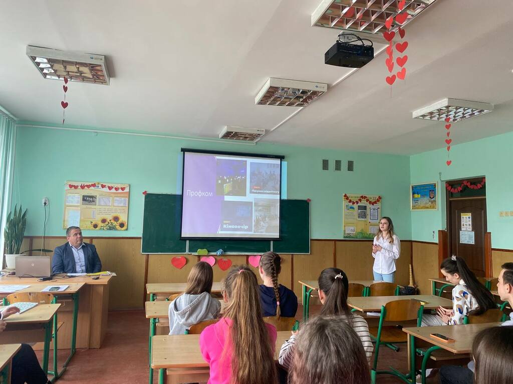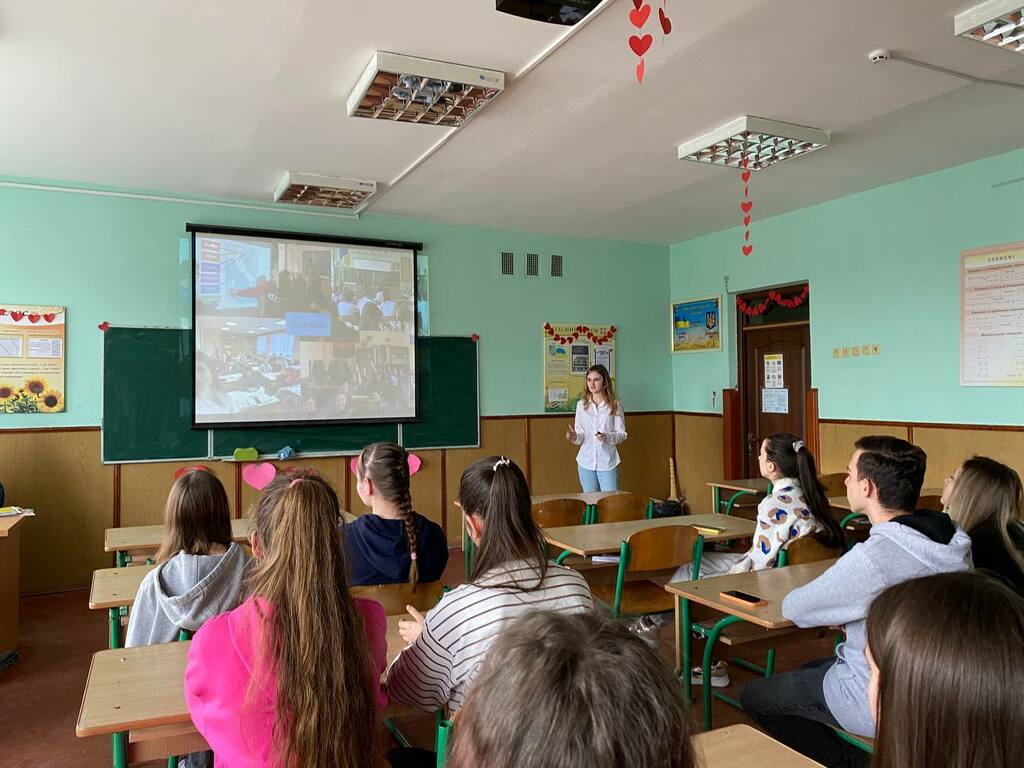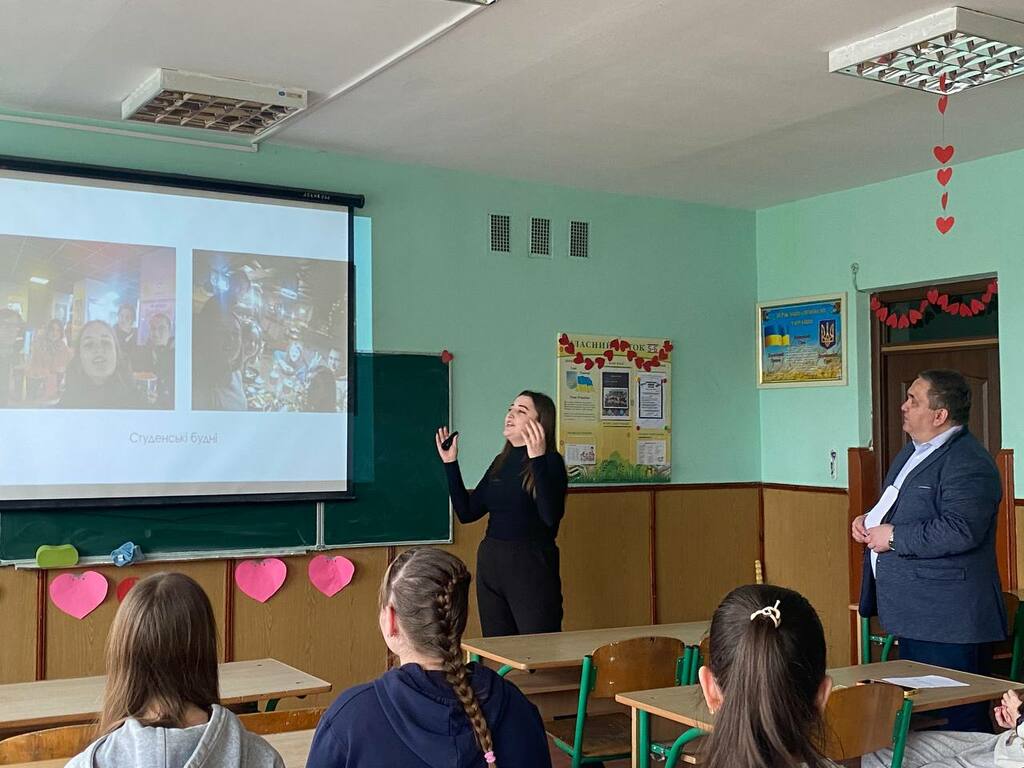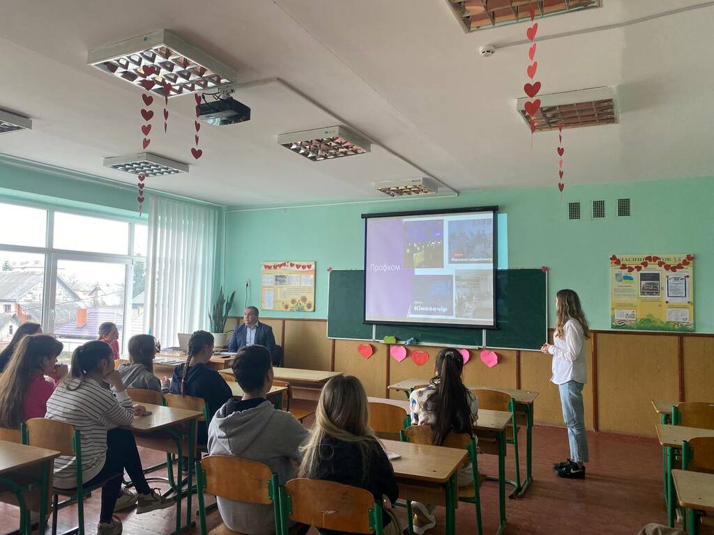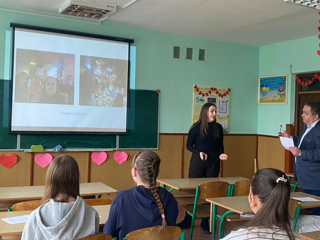 Каріна Говзан акцентувала увагу на громадському і студентському дозвіллі. Розкрила структуру і зміст діяльності студентських сенату та профкому Університету, розповіла учням про різносторонню діяльність молодіжного центру «Paragraph».
