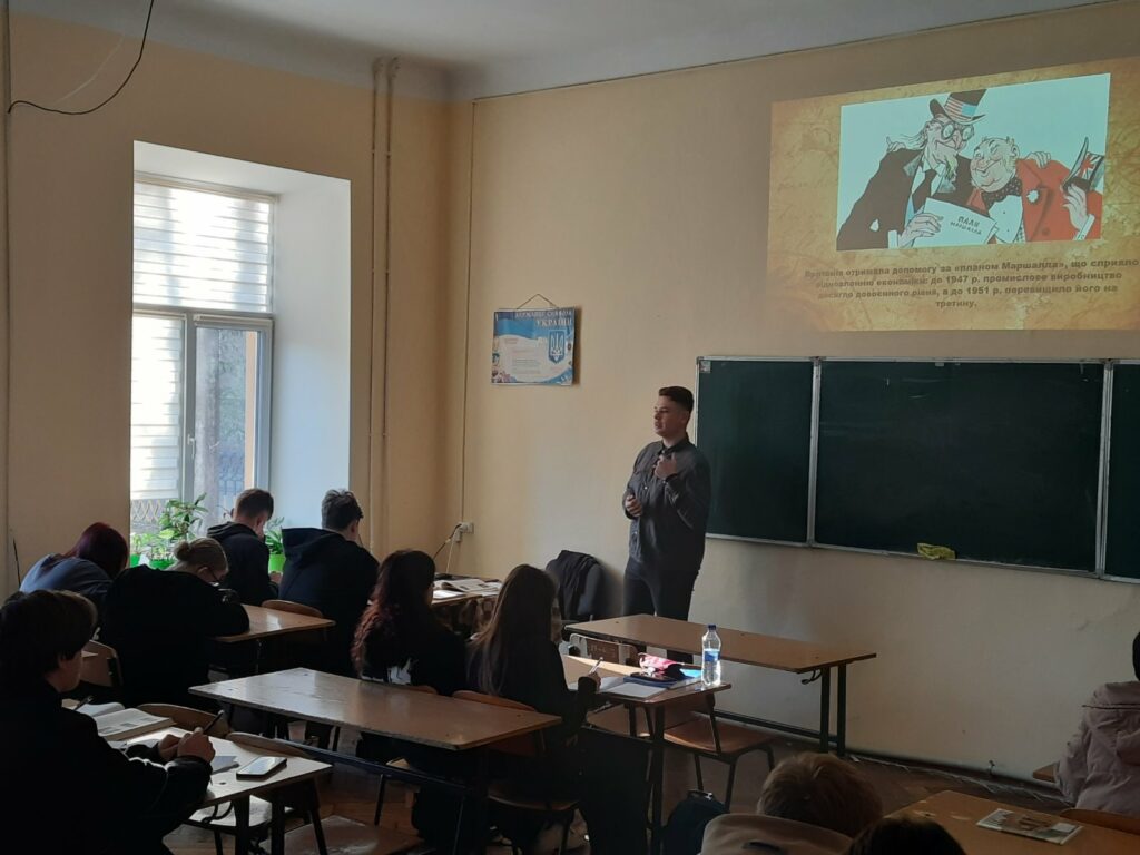 Студент II курсу магістратури спеціальності «Середня освіта (Історія)» Святослав Боданський 22 жовтня 2024 р. у рамках виробничої (педагогічної) практики в закладах загальної середньої освіти (керівник-методист – професор, завідувач кафедри історії України і методики викладання історії І.Я. Райківський) провів урок з предмету «Всесвітня історія» для учнів 11 класу Ліцею № 7 Івано-Франківської міської ради. Тема заняття – «Велика Британія у другій половині ХХ – на початку ХХІ ст.». Під час уроку, з використанням історичних карт, ілюстративних матеріалів і т. п., студент розкрив британсько-українські відносини, особливу увагу звернув на період з 2022 р. до сьогодні. Зокрема, учням поставлено завдання скласти інтелект карту, в якій пропонувалося виділити характерні риси Великої Британії як світового лідера.